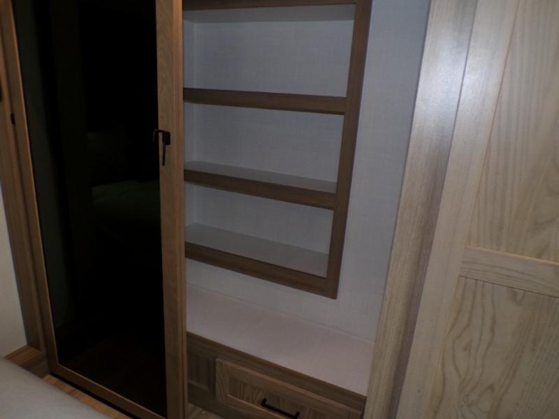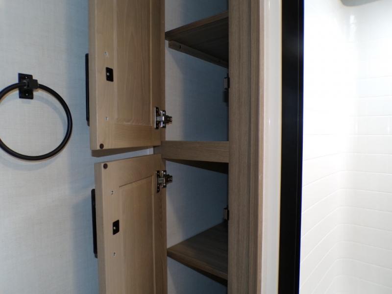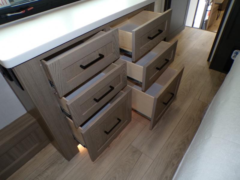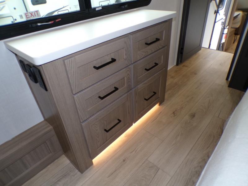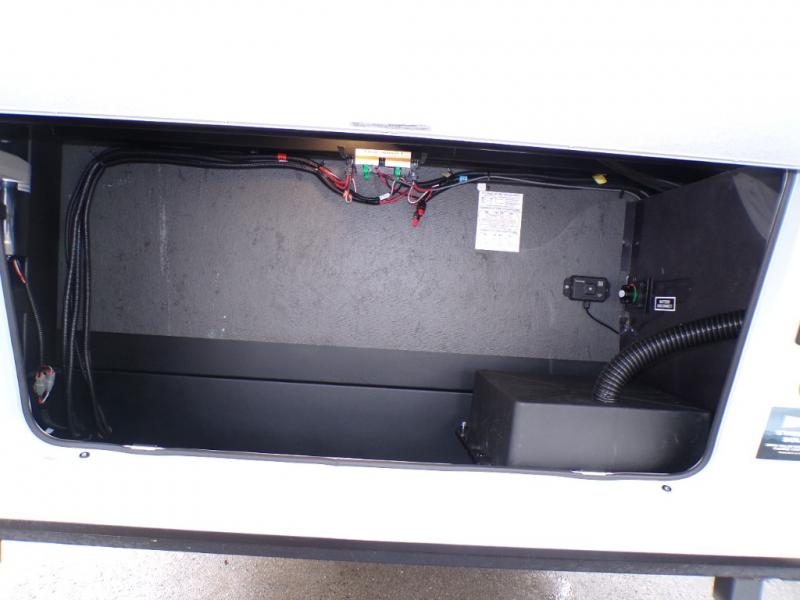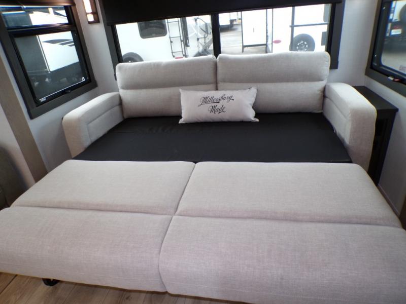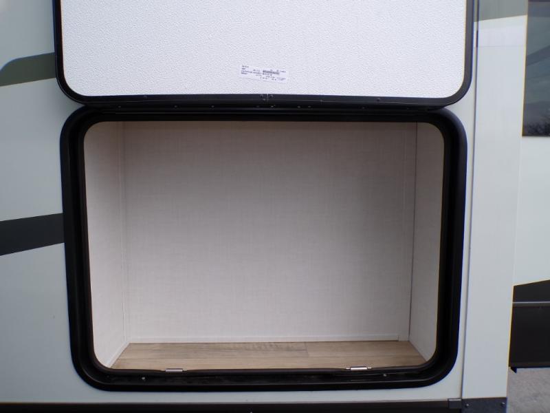 Get ready to enjoy the outdoors while inside with the spacious windows in both the rear and the door side slide of this fifth wheel. The main living area offers dual opposing slides giving you a great place to invite other RVers over to visit, eat, and even play cards. There is seating for nine from the table and chairs with a bench, the theater seats, and the rear hide-a-bed sofa. The cook will have a 12V refrigerator to store lots of drinks and cold food, plus a pantry, and the center island offers extra counter space plus seating. After everyone has left, retire to the front bedroom with a king bed slide, dresser, wardrobe, plus washer and dryer prep if you plan to go full-time!