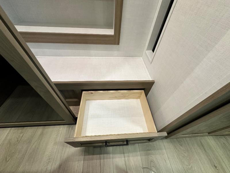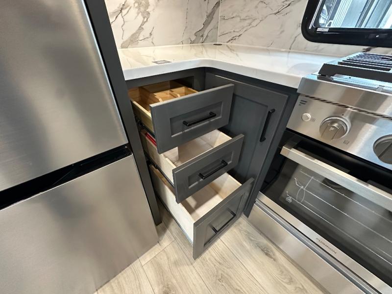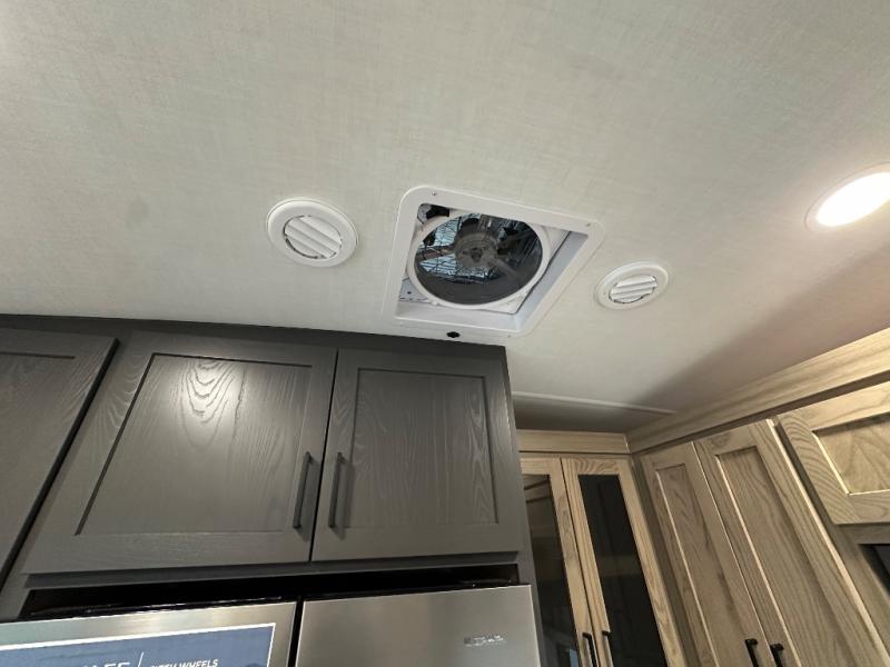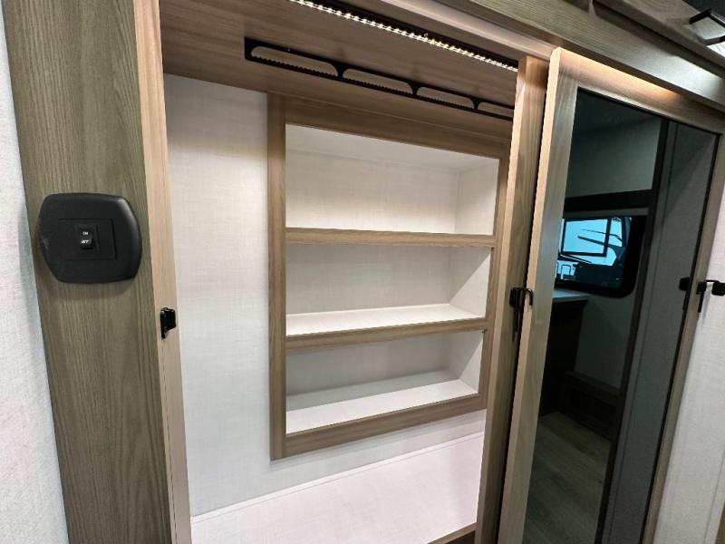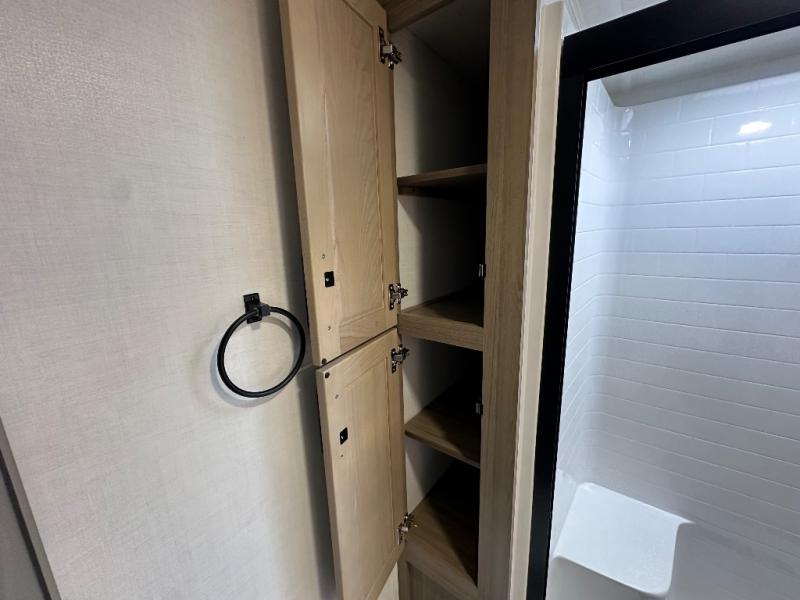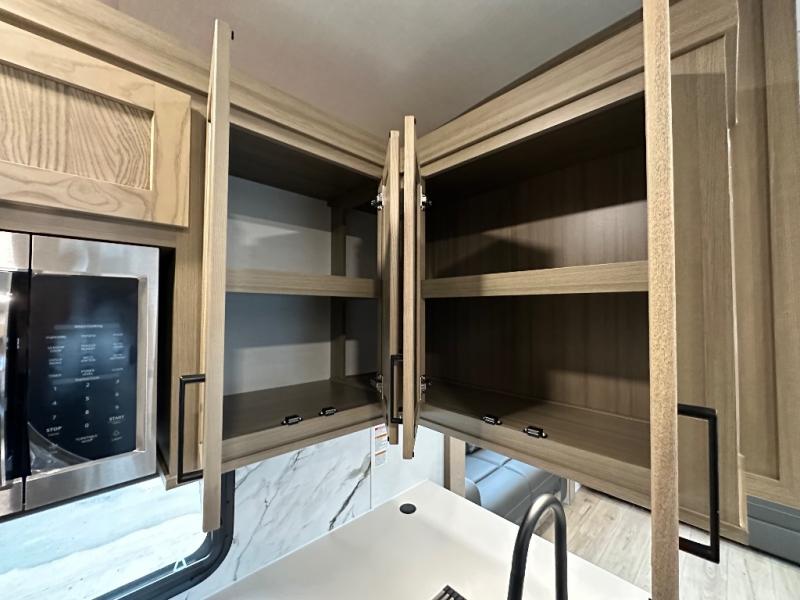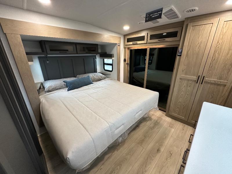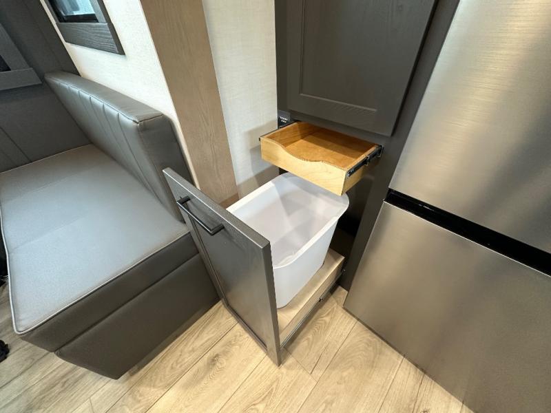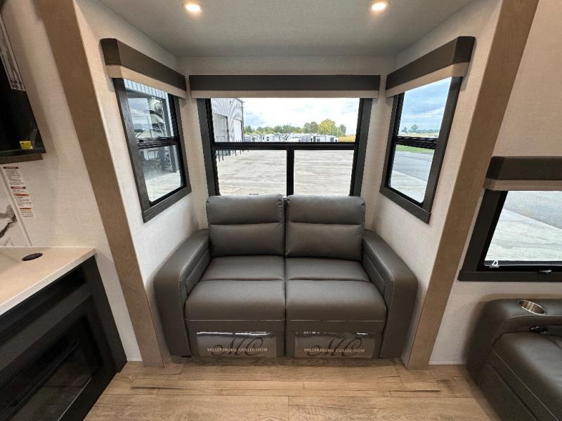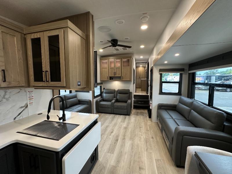 This fifth wheel has everything and then some! The front private bedroom has a queen bed slide with an optional king bed that can replace it and a front wardrobe with washer and dryer prep. Freshen up each morning in the full bathroom featuring a shower with a seat then head to the rear kitchen and scramble up some eggs on the three burner cooktop. You can enjoy your morning coffee and eggs at the table and chairs with a bench. In the middle living area there is a 60" theater seat across from an entertainment center with a fireplace and opposing hide-a-bed sofa slides. Outside, you'll find two power awnings, multiple exterior storage compartments and a pass-thru storage for fishing poles, camp gear and more!
