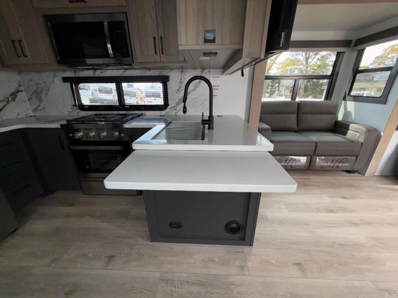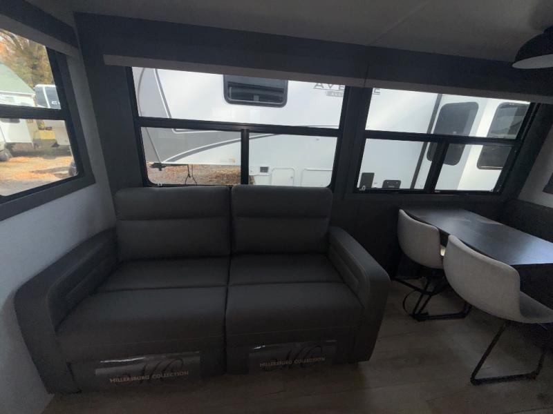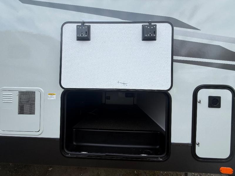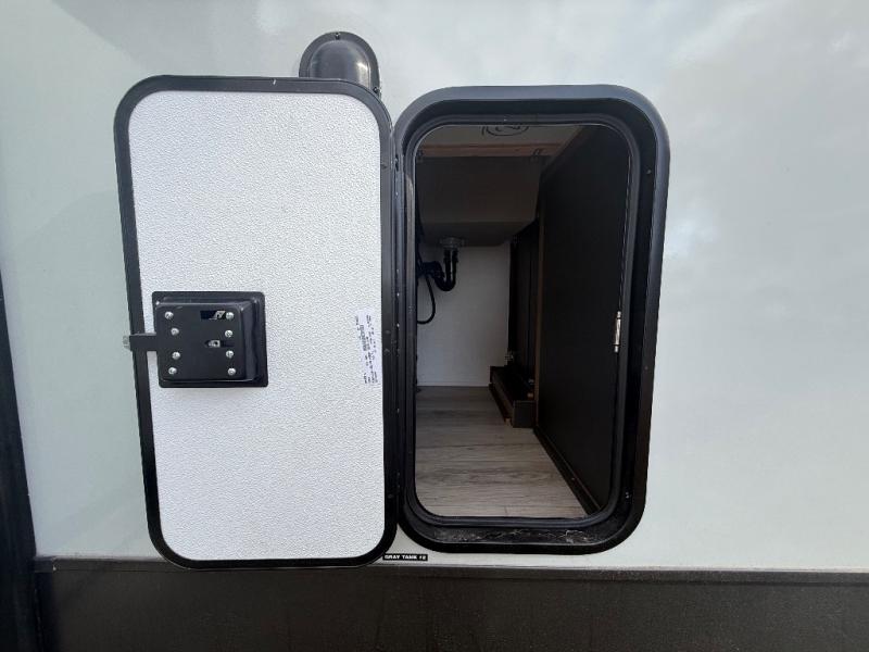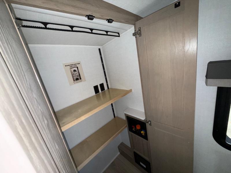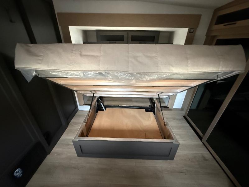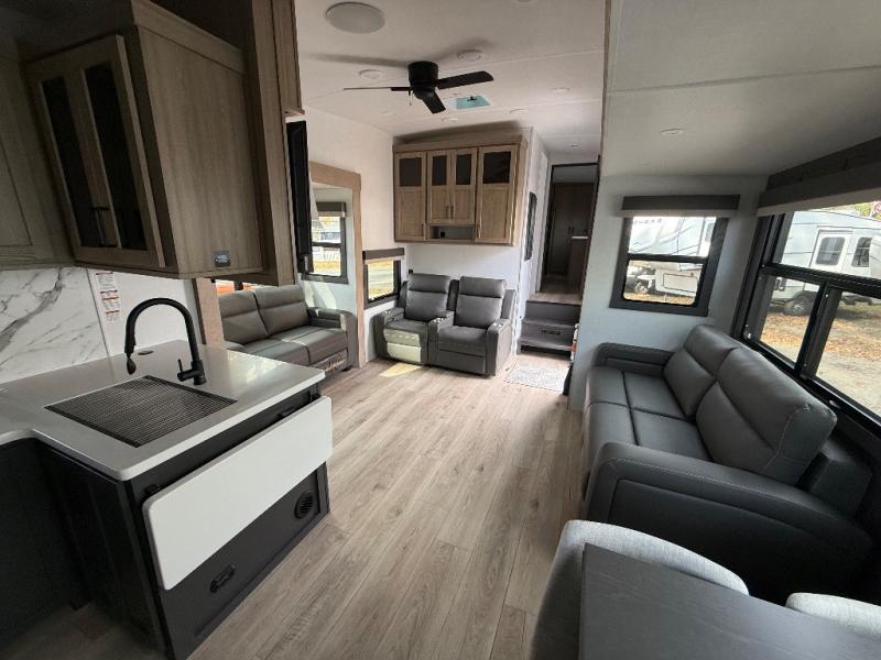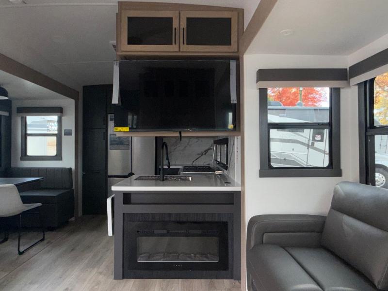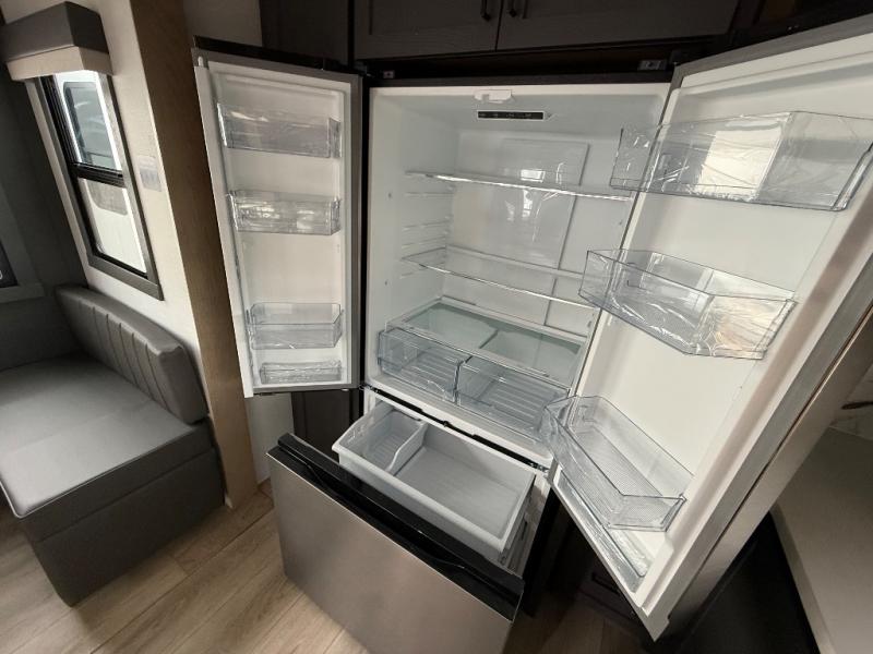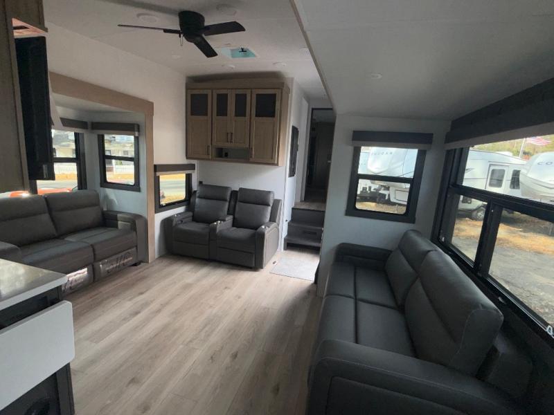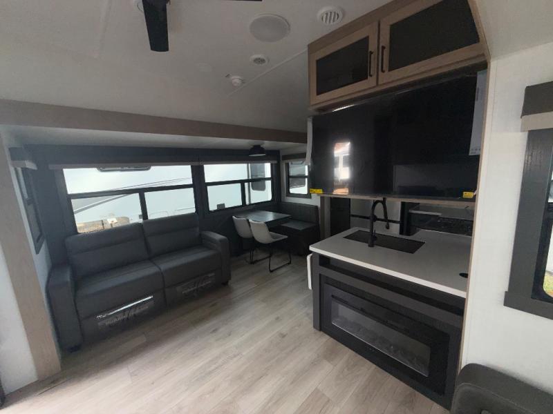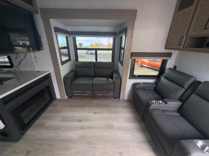This fifth wheel has everything and then some! The front private bedroom has a queen bed slide with an optional king bed that can replace it and a front wardrobe with washer and dryer prep. Freshen up each morning in the full bathroom featuring a shower with a seat then head to the rear kitchen and scramble up some eggs on the three burner cooktop. You can enjoy your morning coffee and eggs at the table and chairs with a bench. In the middle living area there is a 60" theater seat across from an entertainment center with a fireplace and opposing hide-a-bed sofa slides. Outside, you'll find two power awnings, multiple exterior storage compartments and a pass-thru storage for fishing poles, camp gear and more!
