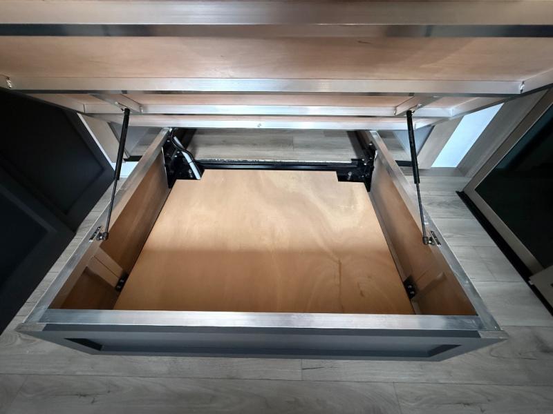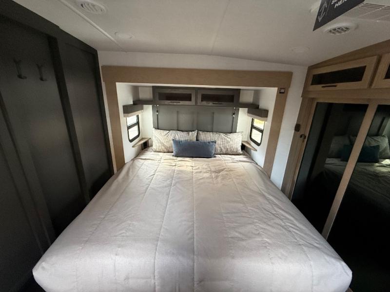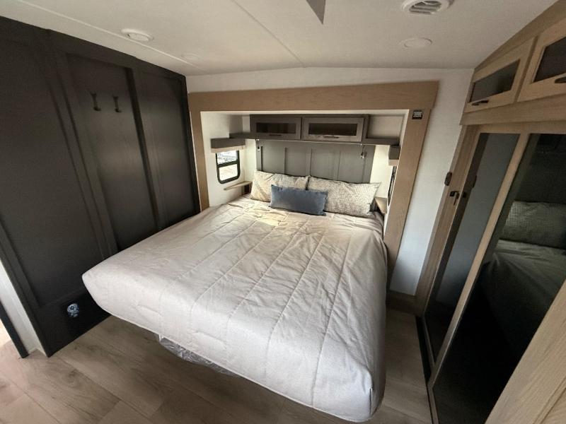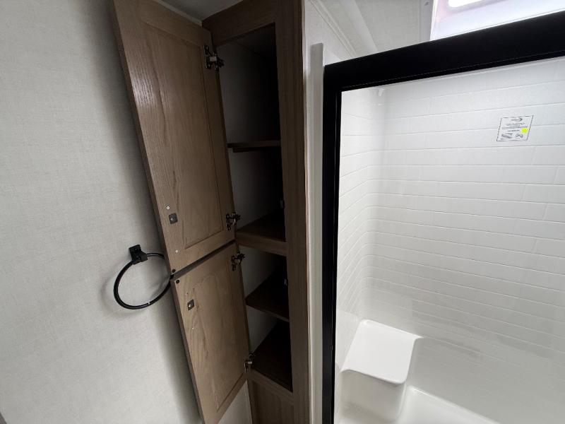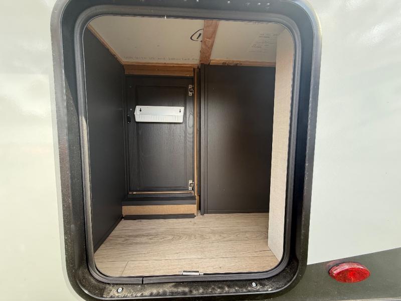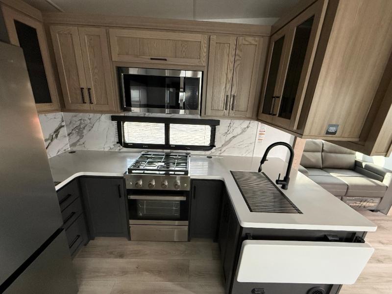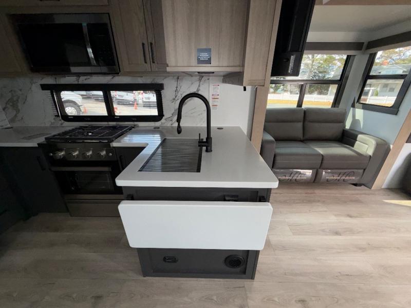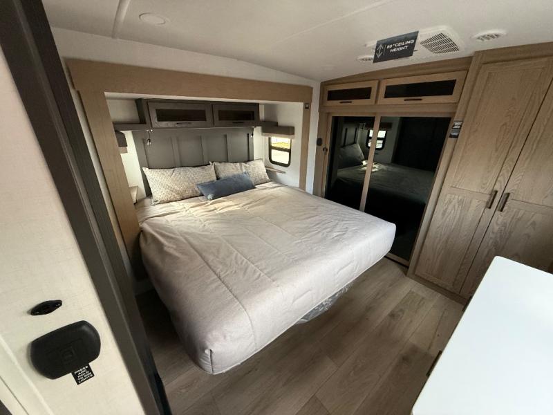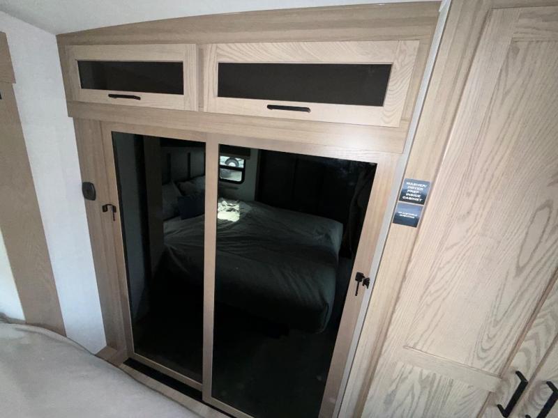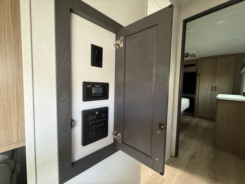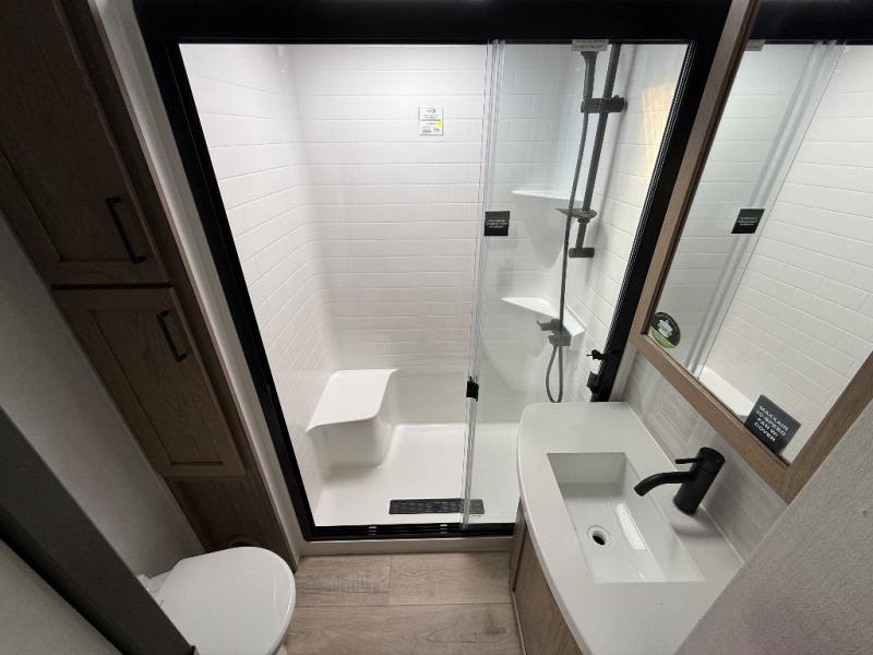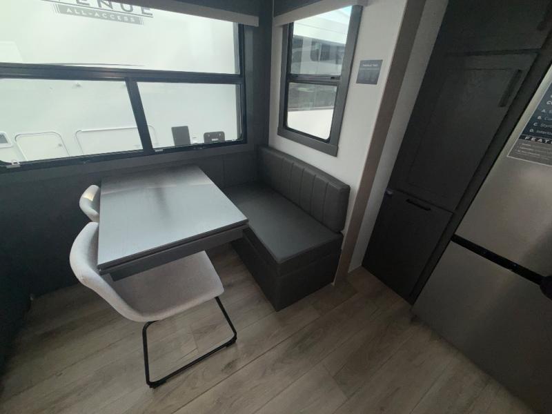This fifth wheel has everything and then some! The front private bedroom has a queen bed slide with an optional king bed that can replace it and a front wardrobe with washer and dryer prep. Freshen up each morning in the full bathroom featuring a shower with a seat then head to the rear kitchen and scramble up some eggs on the three burner cooktop. You can enjoy your morning coffee and eggs at the table and chairs with a bench. In the middle living area there is a 60" theater seat across from an entertainment center with a fireplace and opposing hide-a-bed sofa slides. Outside, you'll find two power awnings, multiple exterior storage compartments and a pass-thru storage for fishing poles, camp gear and more!