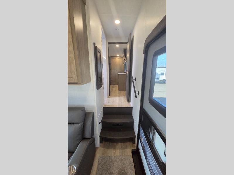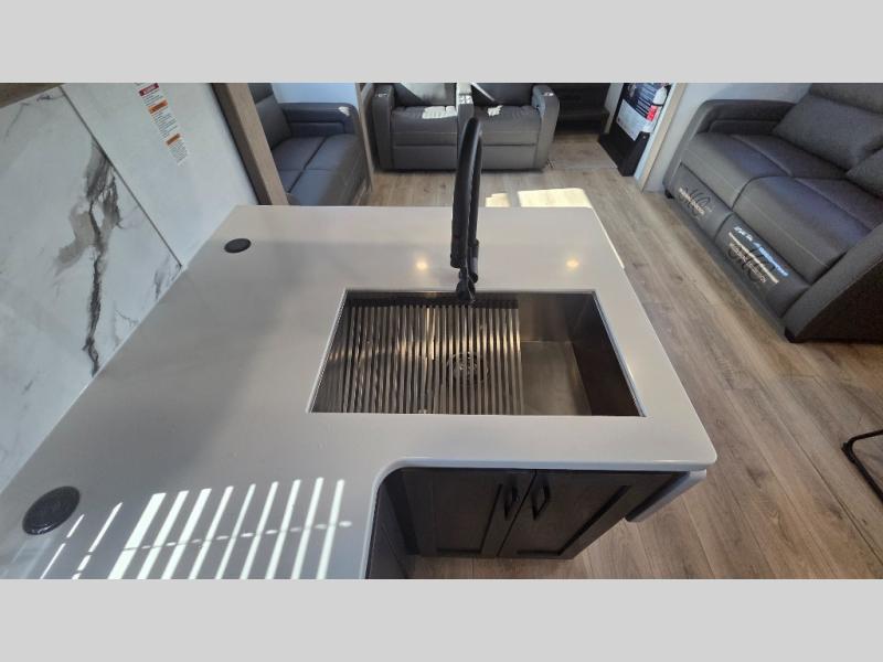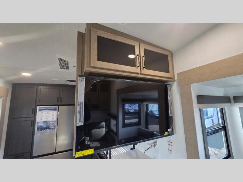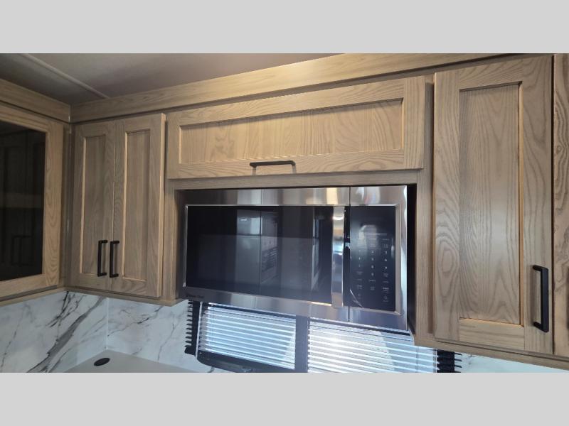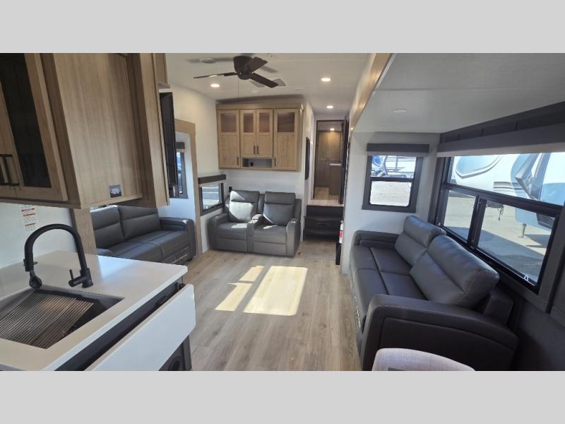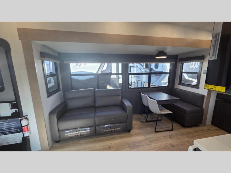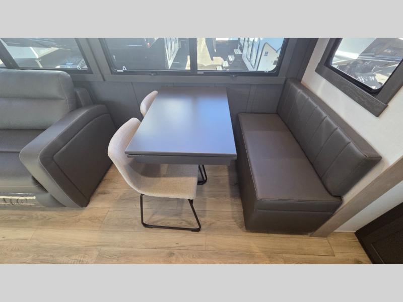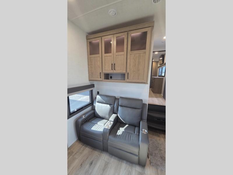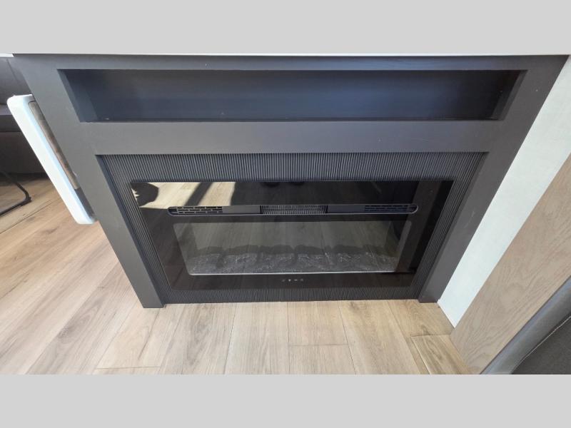 This fifth wheel has everything and then some! The front private bedroom has a queen bed slide with an optional king bed that can replace it and a front wardrobe with washer and dryer prep. Freshen up each morning in the full bathroom featuring a shower with a seat then head to the rear kitchen and scramble up some eggs on the three burner cooktop. You can enjoy your morning coffee and eggs at the table and chairs with a bench. In the middle living area there is a 60" theater seat across from an entertainment center with a fireplace and opposing hide-a-bed sofa slides. Outside, you'll find two power awnings, multiple exterior storage compartments and a pass-thru storage for fishing poles, camp gear and more!