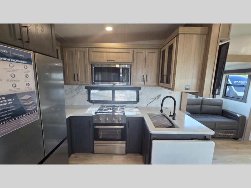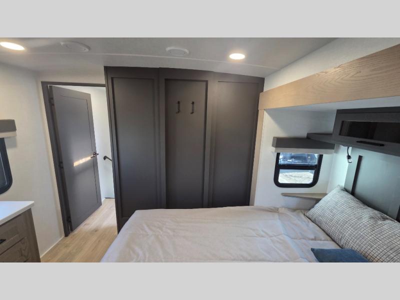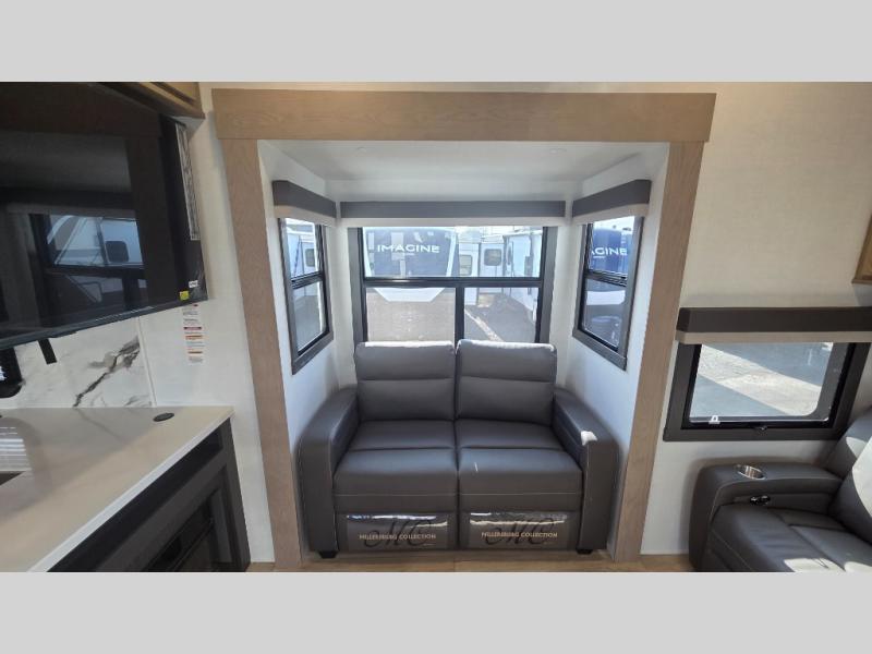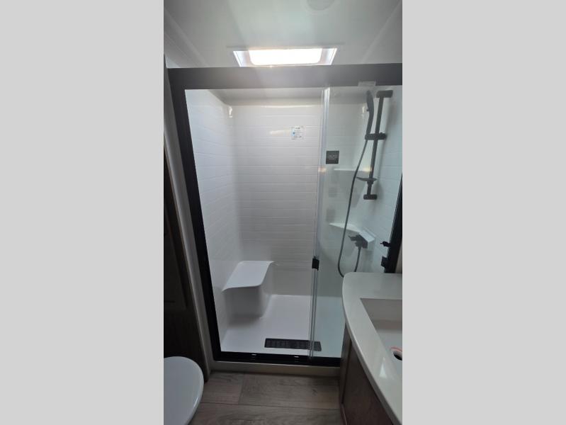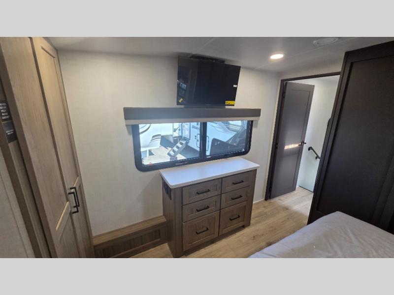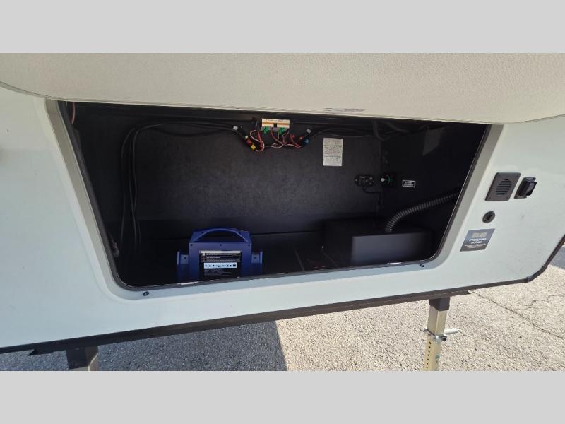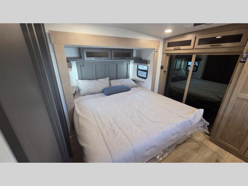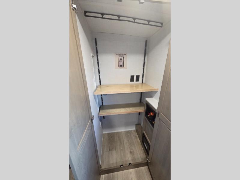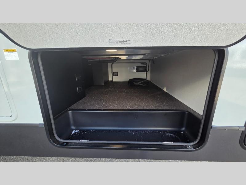 This fifth wheel has everything and then some! The front private bedroom has a queen bed slide with an optional king bed that can replace it and a front wardrobe with washer and dryer prep. Freshen up each morning in the full bathroom featuring a shower with a seat then head to the rear kitchen and scramble up some eggs on the three burner cooktop. You can enjoy your morning coffee and eggs at the table and chairs with a bench. In the middle living area there is a 60" theater seat across from an entertainment center with a fireplace and opposing hide-a-bed sofa slides. Outside, you'll find two power awnings, multiple exterior storage compartments and a pass-thru storage for fishing poles, camp gear and more!