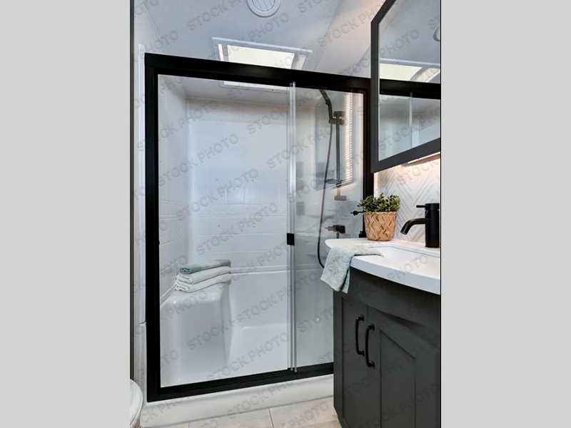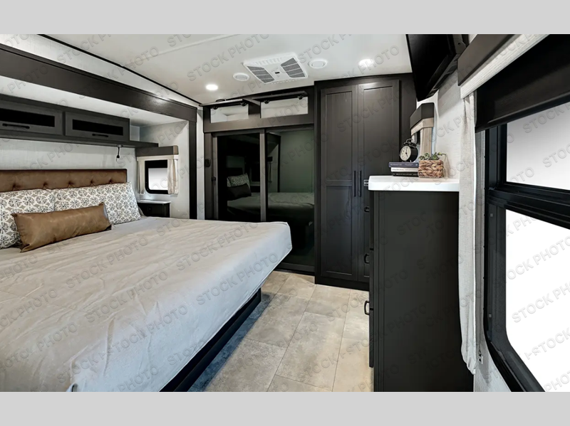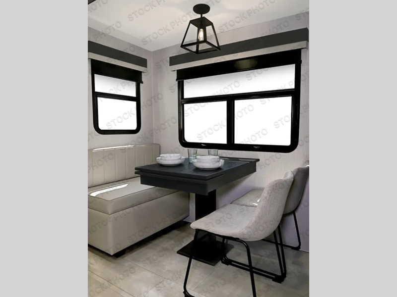 Get ready to enjoy the outdoors while inside with the large windows in both the rear and the door side slide of this fifth wheel. The spacious main living area offers dual opposing slides giving you a great place to invite other RVers over to visit, eat, and even play cards. There is seating for nine on the table and chairs, the theater seats, and the rear hide-a-bed sofa. The cook will have a 12V refrigerator to store lots of drinks and cold food, plus a pantry, and the center island offers extra counter space plus seating. After everyone has left, retire to the front bedroom with a king bed slide, a dresser, wardrobe with washer/dryer prep, plus a TV option.