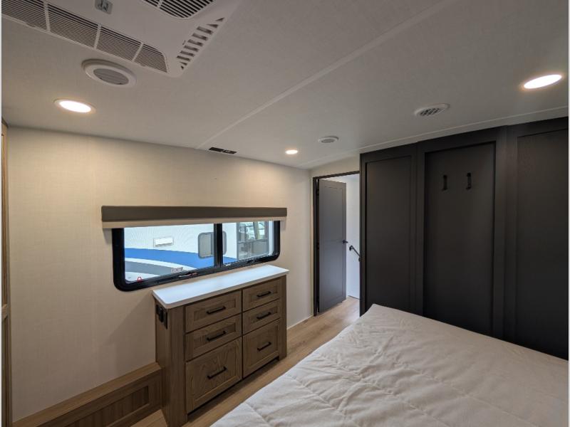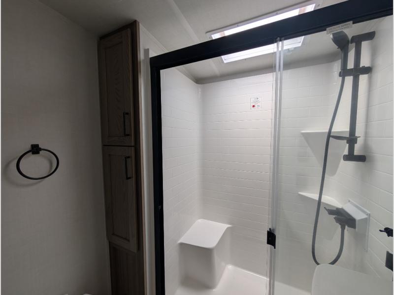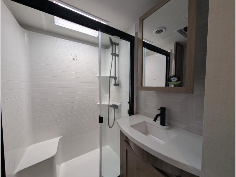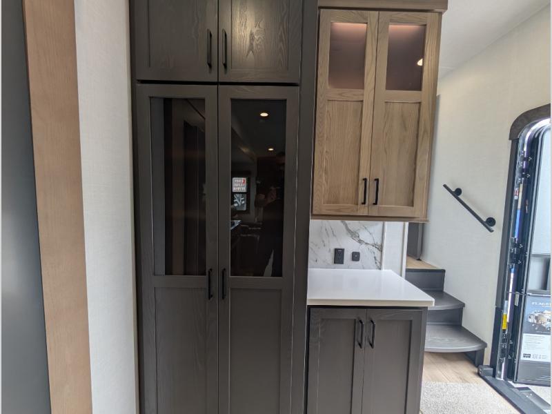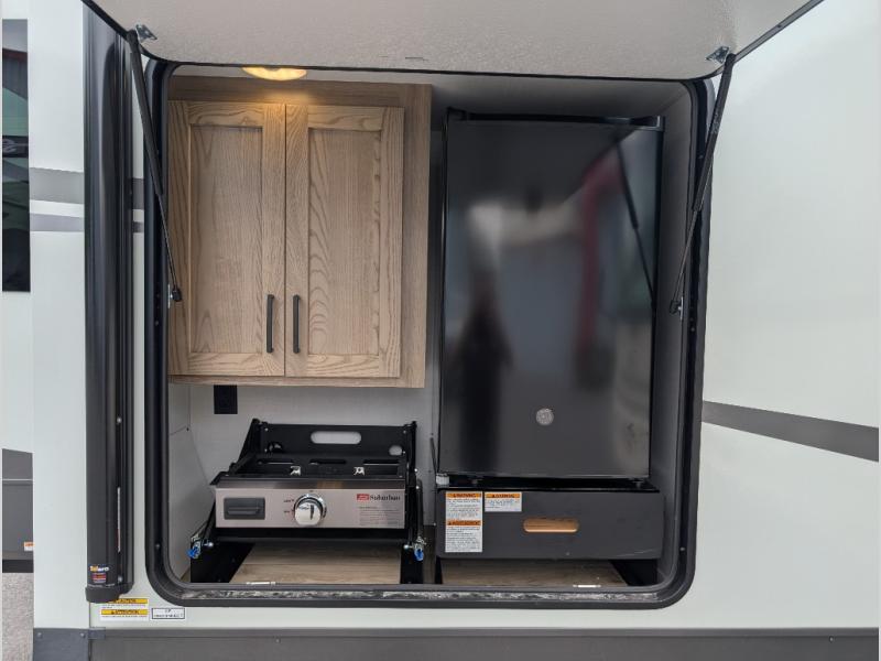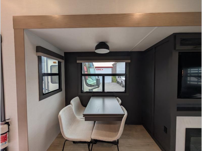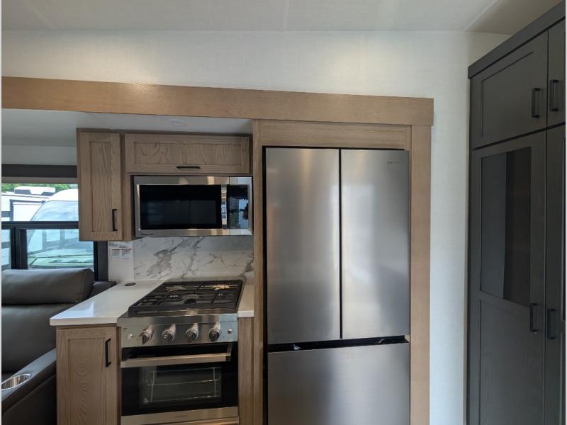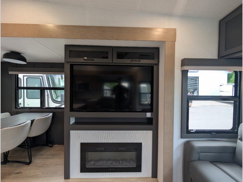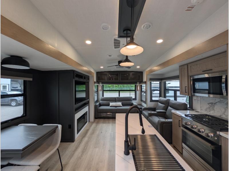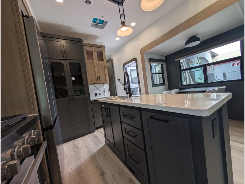 Get ready to enjoy the outdoors while inside with the large windows in both the rear and the door side slide of this fifth wheel. The spacious main living area offers dual opposing slides giving you a great place to invite other RVers over to visit, eat, and even play cards. There is seating for nine on the table and chairs, the theater seats, and the rear hide-a-bed sofa. The cook will have a 12V refrigerator to store lots of drinks and cold food, plus a pantry, and the center island offers extra counter space plus seating. After everyone has left, retire to the front bedroom with a king bed slide, a dresser, wardrobe with washer/dryer prep, plus a TV option.