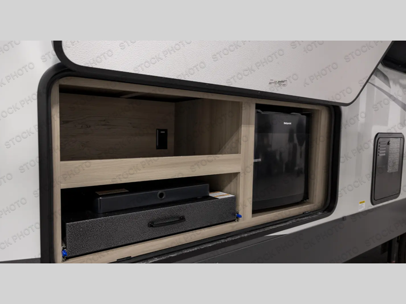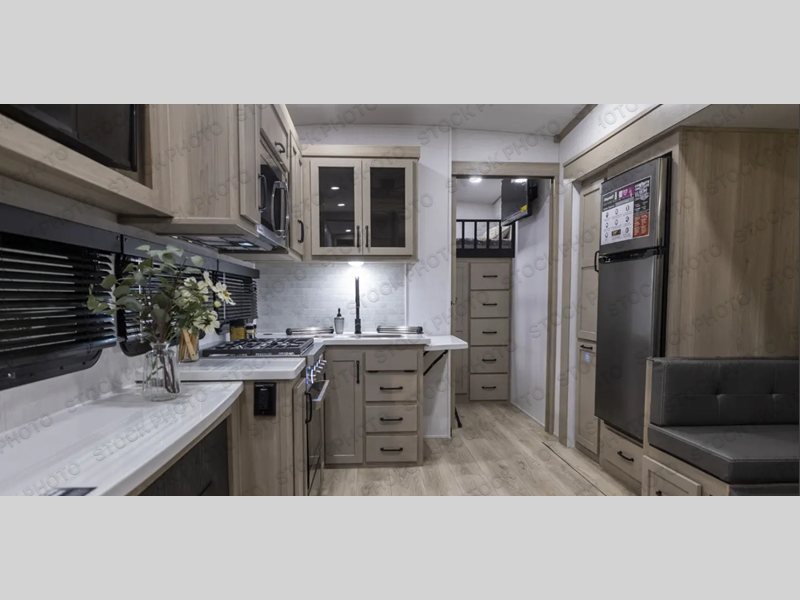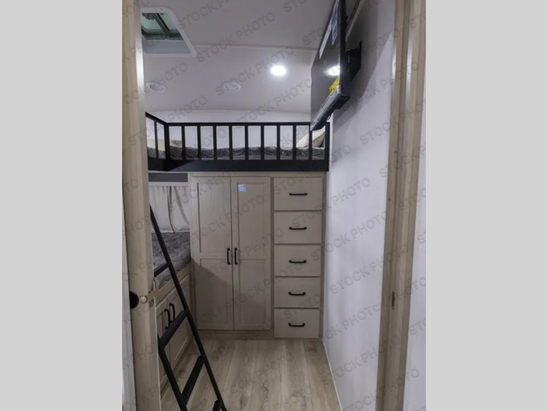 If you have a larger family or friend group this fifth wheel will allow you to bring everyone with sleeping space for eight campers. The kids or your guests will have privacy in the rear bunkhouse which offers a single 32" top bunk, and a 42" x 72" bunk over a 47" x 72" lower bunk, plus washer and dryer prep if you want to add those appliances. You will have privacy on the opposite side of the RV in the front bedroom which offers a queen bed with a king bed option, a wardrobe and an optional TV if you like to watch movies in bed. And don't forget about all the kitchen amenities and the living area furniture which includes a theater seat and a king U-shaped dinette, Smart TV and fireplace. Outside, you will find pass-through storage, two power awnings, an outside kitchen, and additional outside storage for even more camp gear!