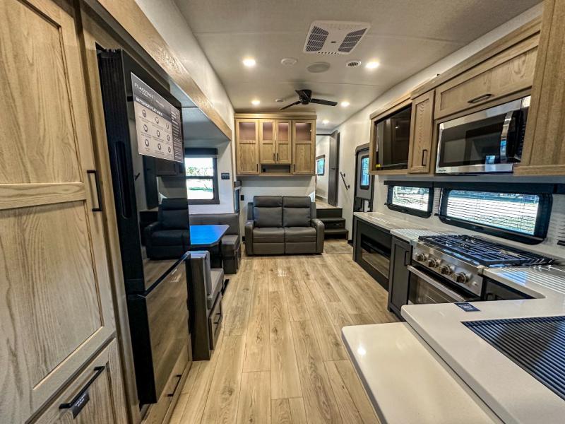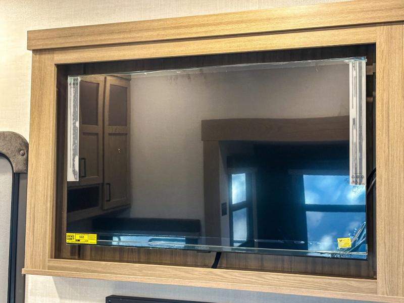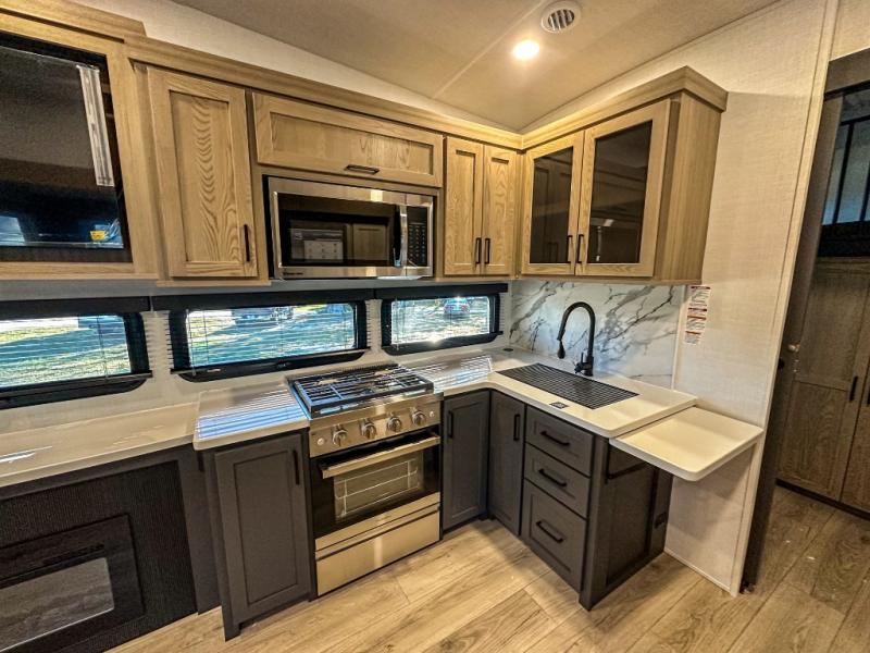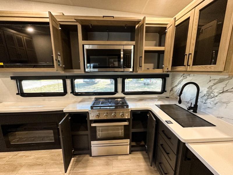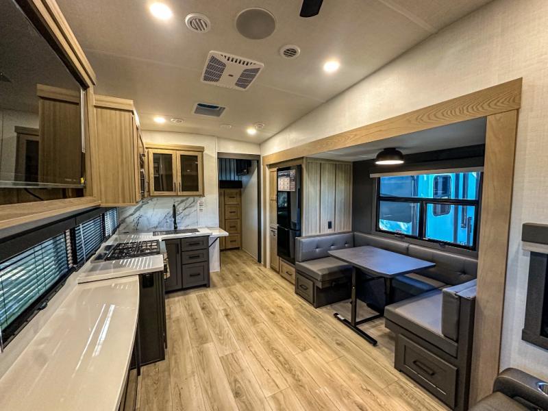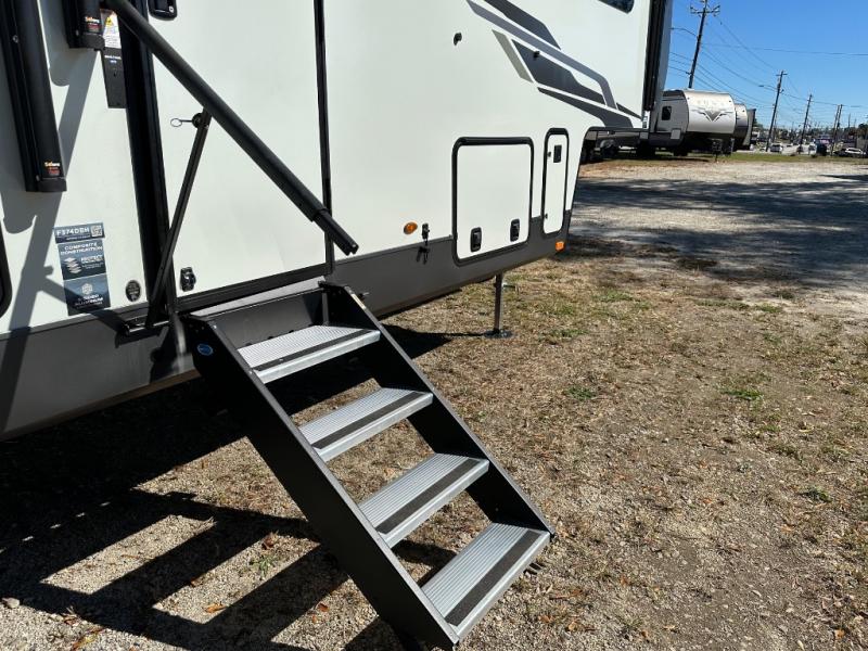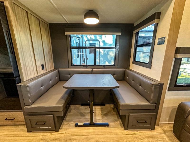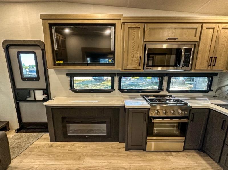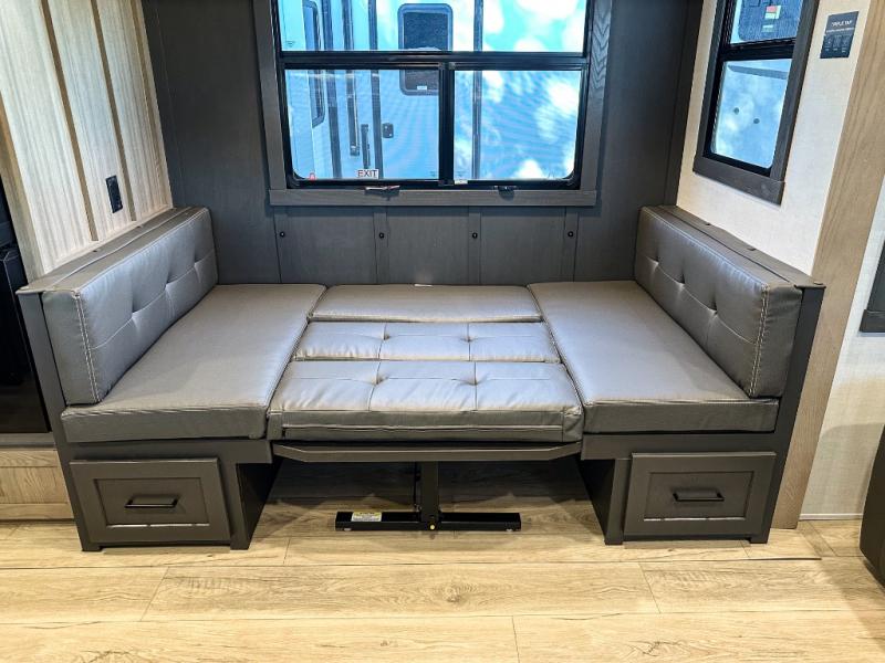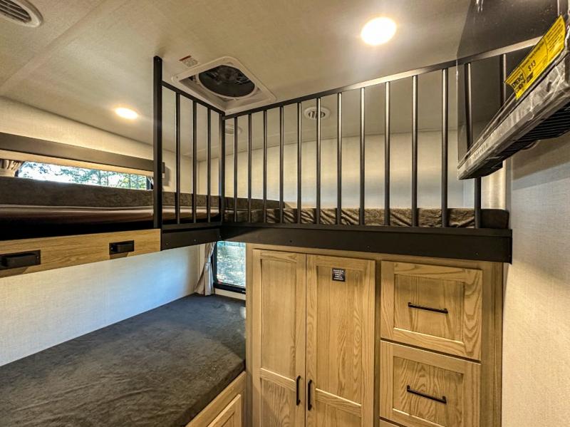 If you have a larger family or friend group this fifth wheel will allow you to bring everyone with sleeping space for eight campers. The kids or your guests will have privacy in the rear bunkhouse which offers a single 32" top bunk, and a 42" x 72" bunk over a 47" x 72" lower bunk, plus washer and dryer prep if you want to add those appliances. You will have privacy on the opposite side of the RV in the front bedroom which offers a queen bed with a king bed option, a wardrobe and an optional TV if you like to watch movies in bed. And don't forget about all the kitchen amenities and the living area furniture which includes a theater seat and a king U-shaped dinette, Smart TV and fireplace. Outside, you will find pass-through storage, two power awnings, an outside kitchen, and additional outside storage for even more camp gear!