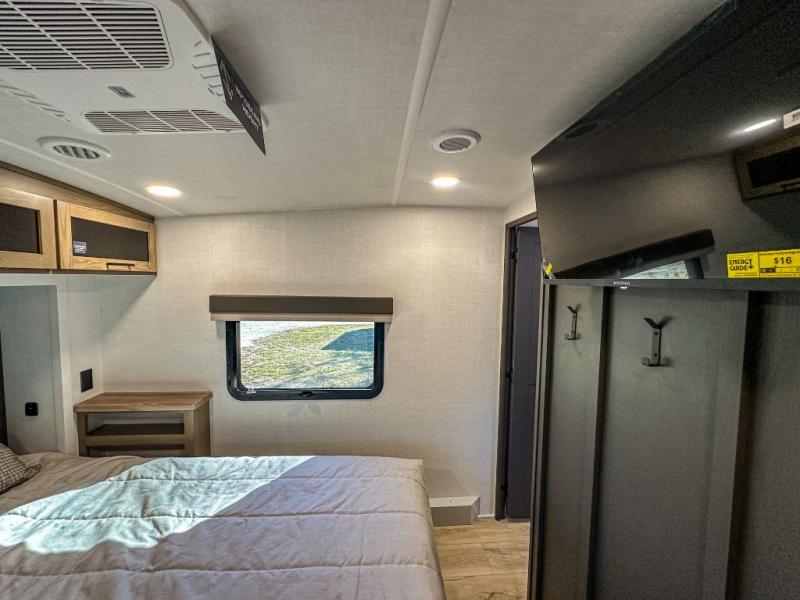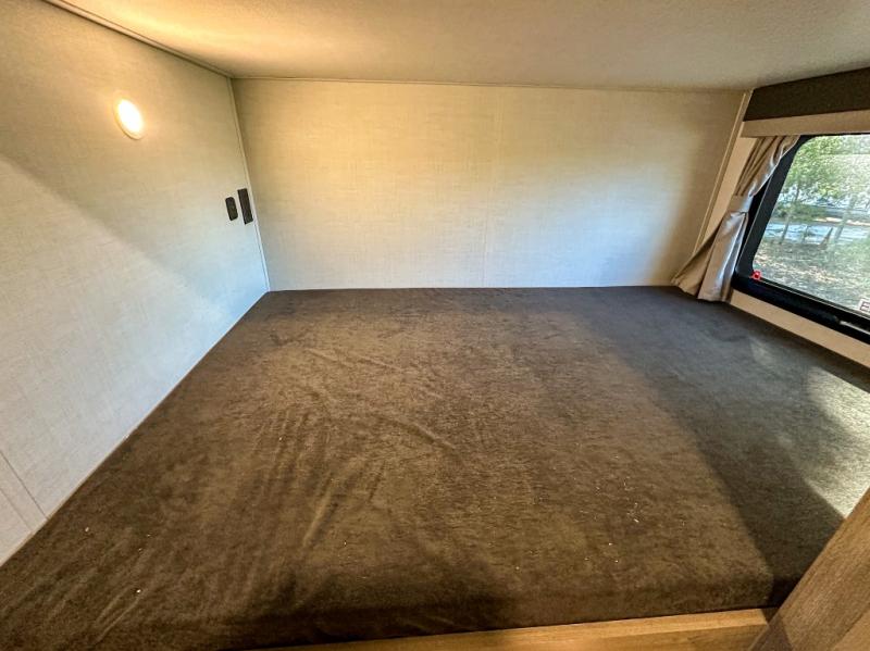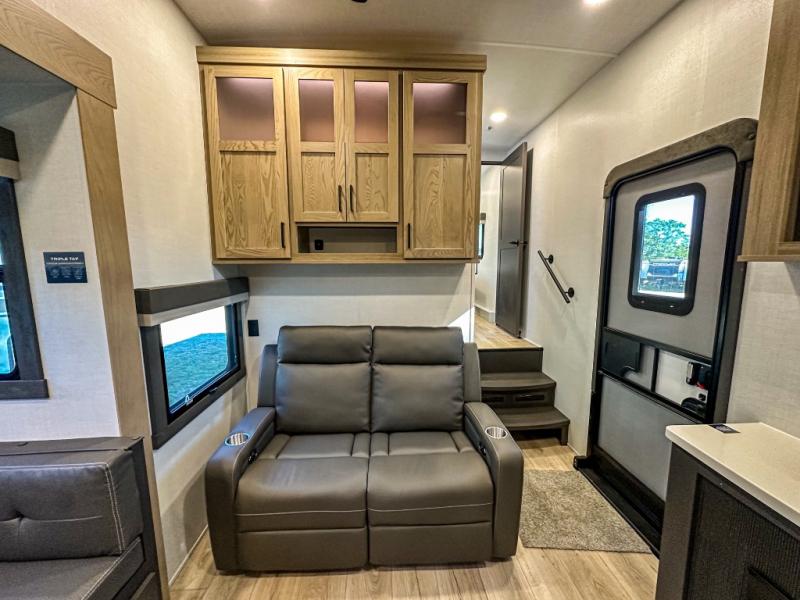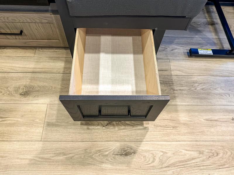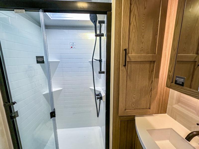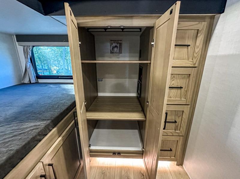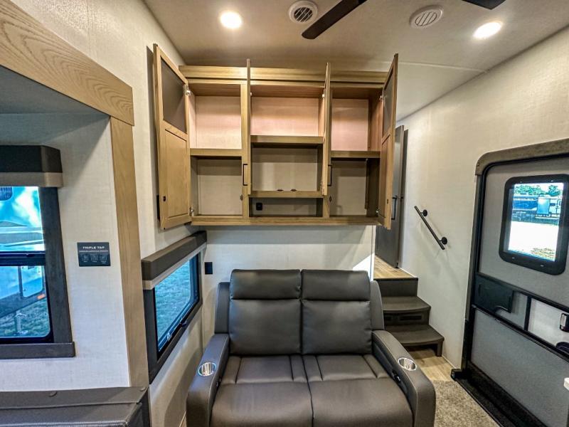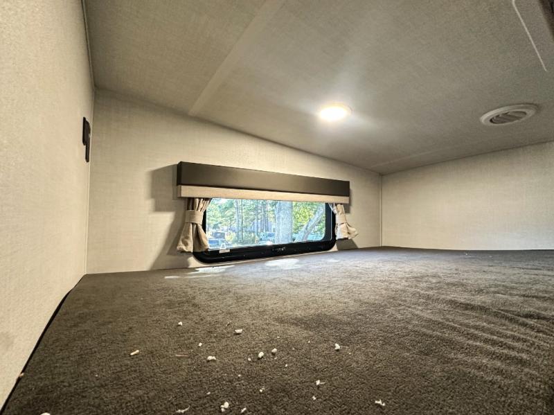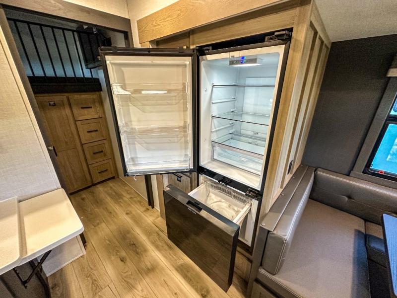 If you have a larger family or friend group this fifth wheel will allow you to bring everyone with sleeping space for eight campers. The kids or your guests will have privacy in the rear bunkhouse which offers a single 32" top bunk, and a 42" x 72" bunk over a 47" x 72" lower bunk, plus washer and dryer prep if you want to add those appliances. You will have privacy on the opposite side of the RV in the front bedroom which offers a queen bed with a king bed option, a wardrobe and an optional TV if you like to watch movies in bed. And don't forget about all the kitchen amenities and the living area furniture which includes a theater seat and a king U-shaped dinette, Smart TV and fireplace. Outside, you will find pass-through storage, two power awnings, an outside kitchen, and additional outside storage for even more camp gear!
