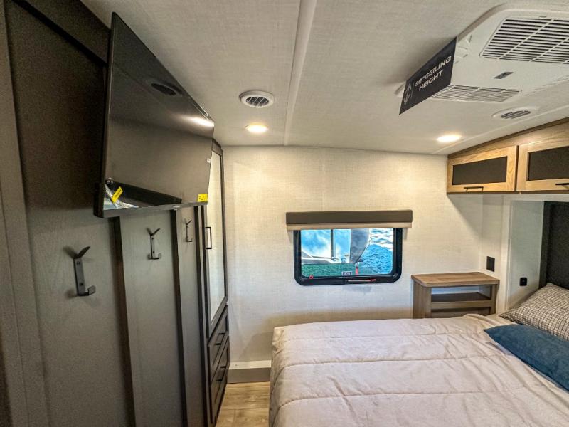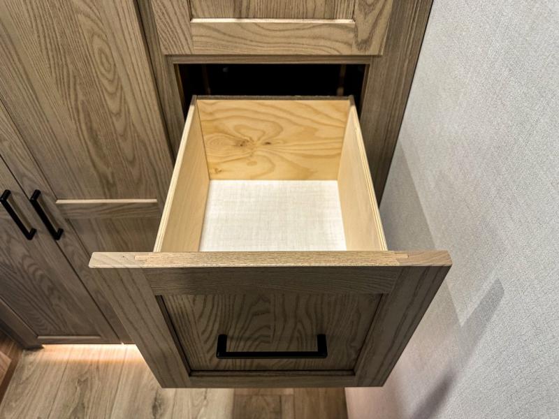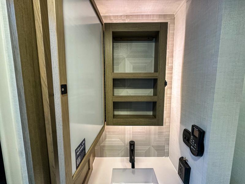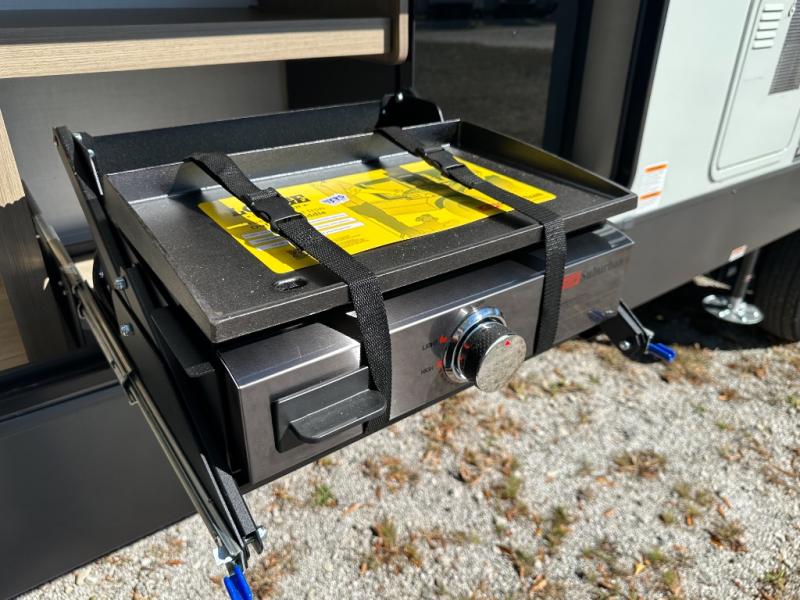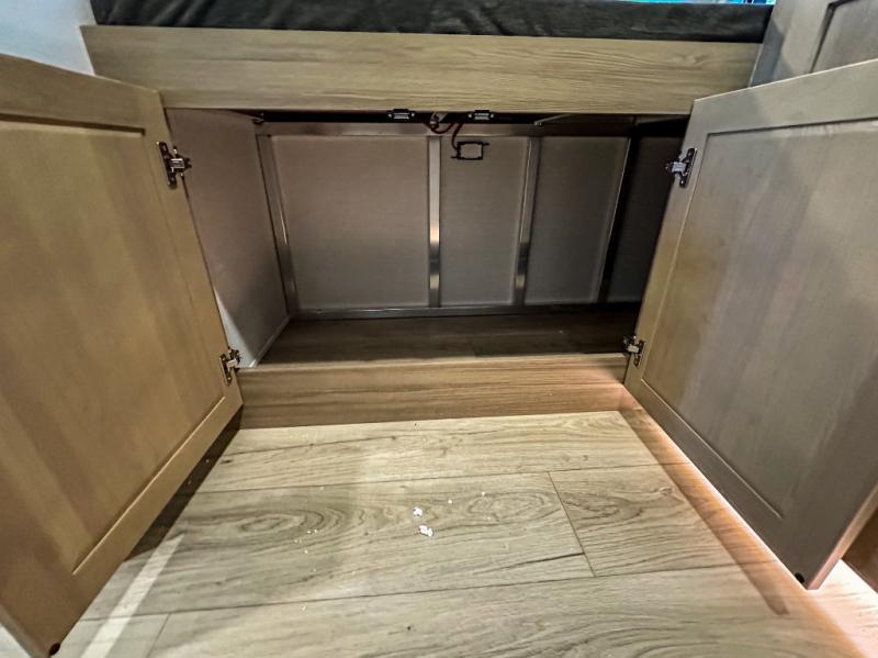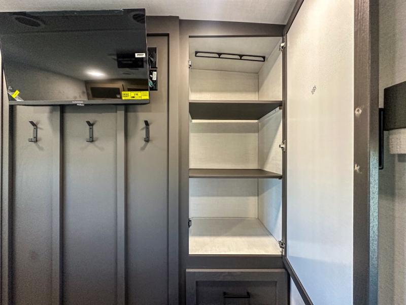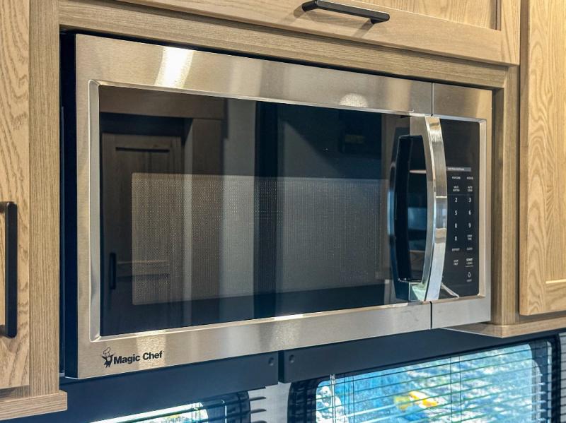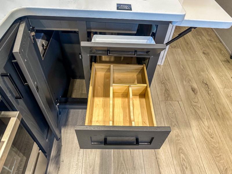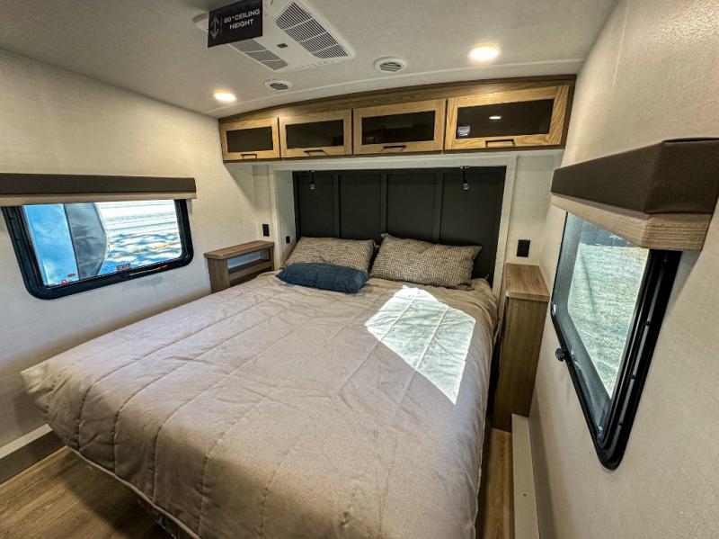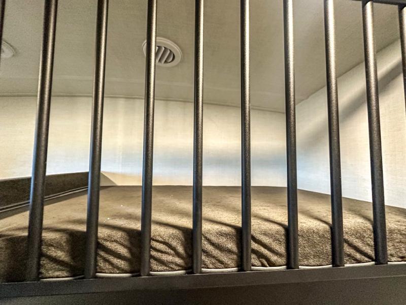 If you have a larger family or friend group this fifth wheel will allow you to bring everyone with sleeping space for eight campers. The kids or your guests will have privacy in the rear bunkhouse which offers a single 32" top bunk, and a 42" x 72" bunk over a 47" x 72" lower bunk, plus washer and dryer prep if you want to add those appliances. You will have privacy on the opposite side of the RV in the front bedroom which offers a queen bed with a king bed option, a wardrobe and an optional TV if you like to watch movies in bed. And don't forget about all the kitchen amenities and the living area furniture which includes a theater seat and a king U-shaped dinette, Smart TV and fireplace. Outside, you will find pass-through storage, two power awnings, an outside kitchen, and additional outside storage for even more camp gear!