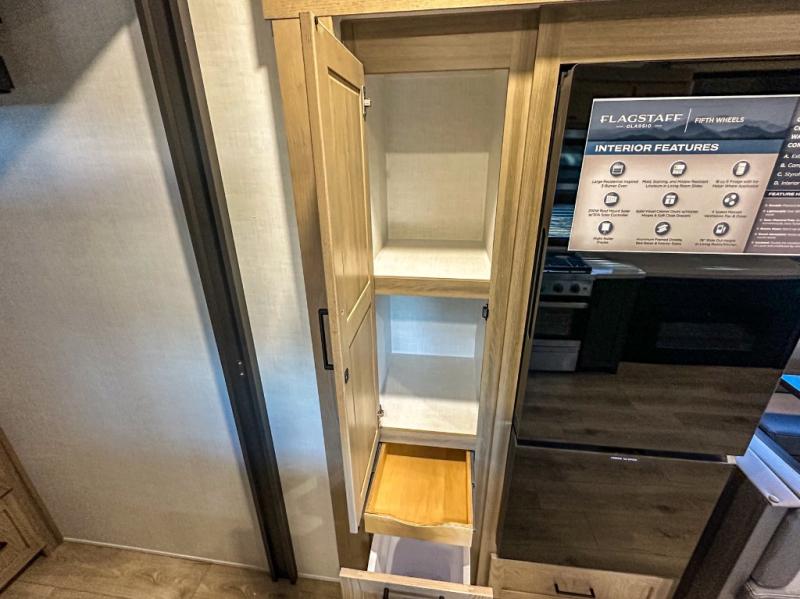 Each one of these Forest River Flagstaff Classic fifth wheels or travel trailers will be your home on wheels! Their quality craftsmanship and attention to detail shines through the enclosed underbelly, the fully laminated walkable roof, and six-sided full-aluminum frame. Towing your unit will be easy with the Goodyear Endurance tires plus RoadTech tire pressure monitoring. Additional exterior features include a 200W solar panel, slam baggage doors, a Key-Alike lock system, and double 30 lb. LP tanks to name a few conveniences. Head inside to find a residential style gas range, solid surface kitchen and bath countertops, soft close hidden cabinet hinges, and more comforts!