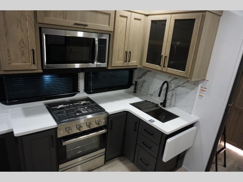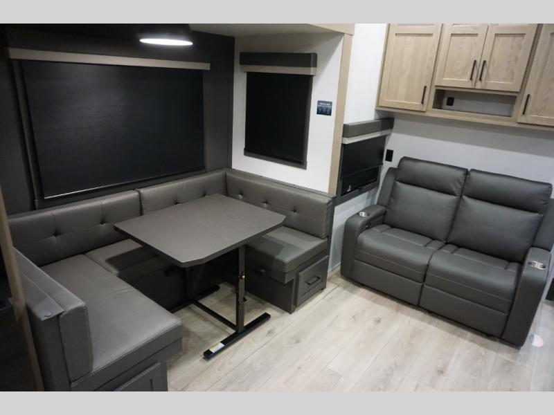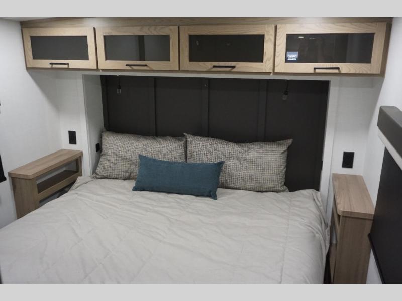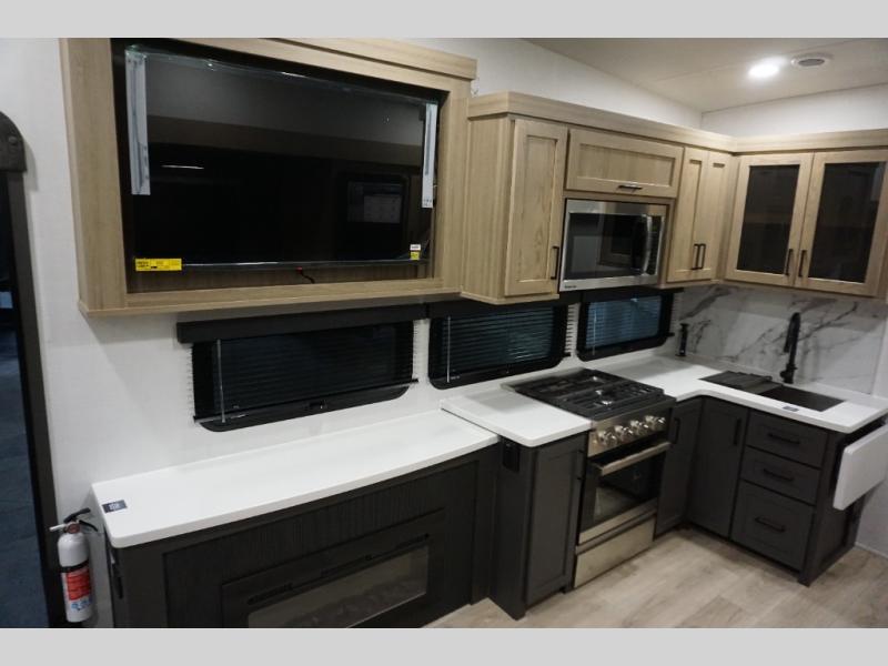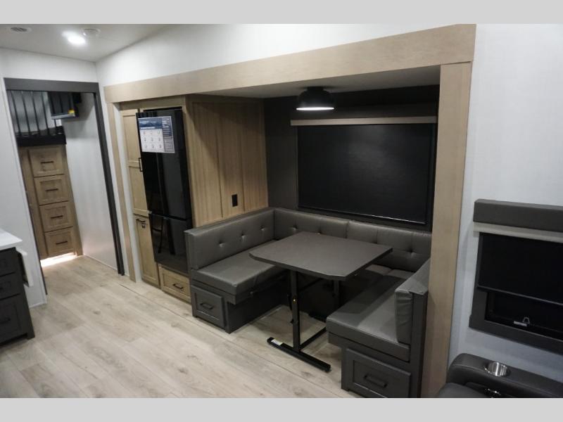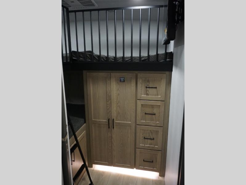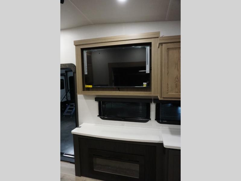 If you have a larger family or friend group this fifth wheel will allow you to bring everyone with sleeping space for eight campers. The kids or your guests will have privacy in the rear bunkhouse which offers a single 32" top bunk, and a 42" x 72" bunk over a 47" x 72" lower bunk, plus washer and dryer prep if you want to add those appliances. You will have privacy on the opposite side of the RV in the front bedroom which offers a queen bed with a king bed option, a wardrobe and an optional TV if you like to watch movies in bed. And don't forget about all the kitchen amenities and the living area furniture which includes a theater seat and a king U-shaped dinette, Smart TV and fireplace. Outside, you will find pass-through storage, two power awnings, an outside kitchen, and additional outside storage for even more camp gear!