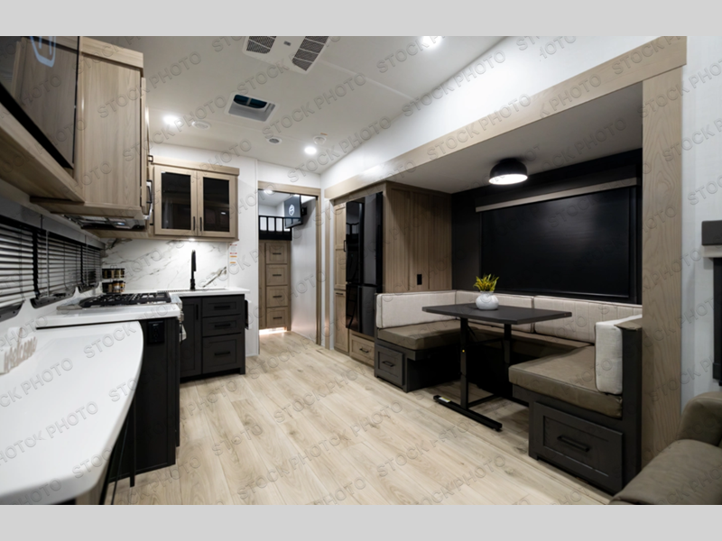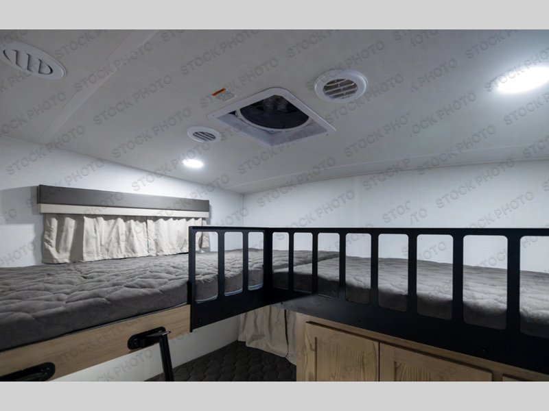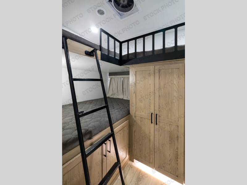 If you have a larger family or friend group this fifth wheel will allow you to bring everyone with sleeping space for eight campers. The kids or your guests will have privacy in the rear bunkhouse which offers a single 32" top bunk, and a 42" x 72" bunk over a 47" x 72" lower bunk, plus washer and dryer prep if you want to add those appliances. You will have privacy on the opposite side of the RV in the front bedroom which offers a queen bed with a king bed option, a wardrobe and an optional TV if you like to watch movies in bed. And don't forget about all the kitchen amenities and the living area furniture which includes a theater seat and a king U-shaped dinette, Smart TV and fireplace. Outside, you will find pass-through storage, two power awnings, an outside kitchen, and additional outside storage for even more camp gear!