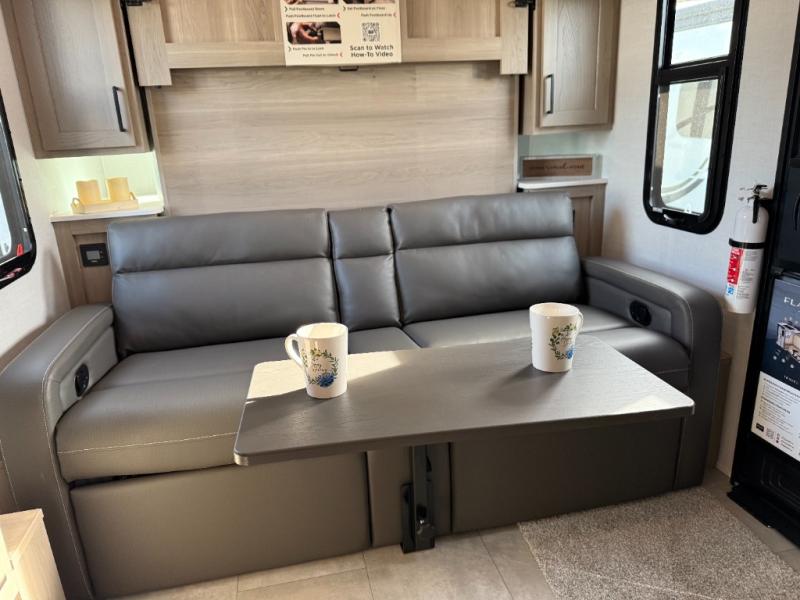 This can be the perfect couples trailer for you or your own RV with more floor space to move around thanks to the slide out sofa with a 30" x 15" table which offers sleeping space for friends. You will have a queen bed to lay your head up front, and everyone can watch the 12V TV. The wardrobe and overhead cabinets give you clothing storage, and the kitchen cooktop and microwave allow the cook to make warm meals. And the 12V refrigerator is conveniently next to the entry so you can grab a drink on your way out to relax under the 11' power awning.