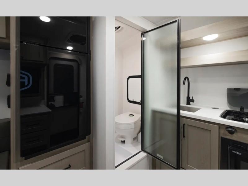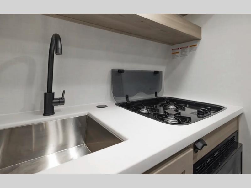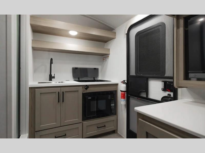 It's time to hit the road in this small, yet walkable travel trailer that is versatile to your needs and offers everything you will want to stay comfortable at a campground or off-grid. You can make meals using the cooktop and microwave up front, and store your cold items in the 12V refrigerator. Take turns getting cleaned up in the wet bath so you can skip the public facilities, and store your clothing in the overhead cabinets. You can watch the 32" TV while dining or sleeping on the twin beds that offer a table top to help you convert this area into a king bed. And the 10' power awning will give you a place to hang out while you use the outdoor griddle.