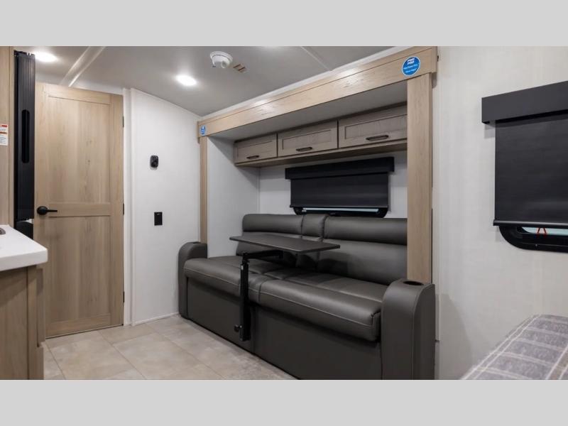 Get ready for a spacious and comfortable trip in this trailer, plus you will have a convenient rear full bathroom with an oversized shower and linen storage to utilize instead of using the campground's facilities. The walk-around full bed gives you two sides with wardrobes to claim as your own. And the kitchen offers full amenities to make meals, and the outside griddle gives you even more choices when cooking. You can relax, dine, or even work from the slide out sofa with a 30" x 15" table and watch the 32" TV. You will find storage along the exterior for your outdoor gear, plus a 14' power awning.
