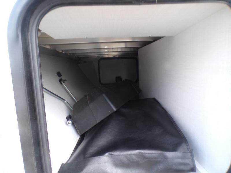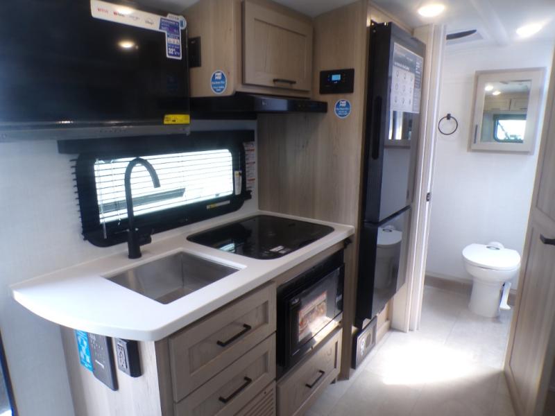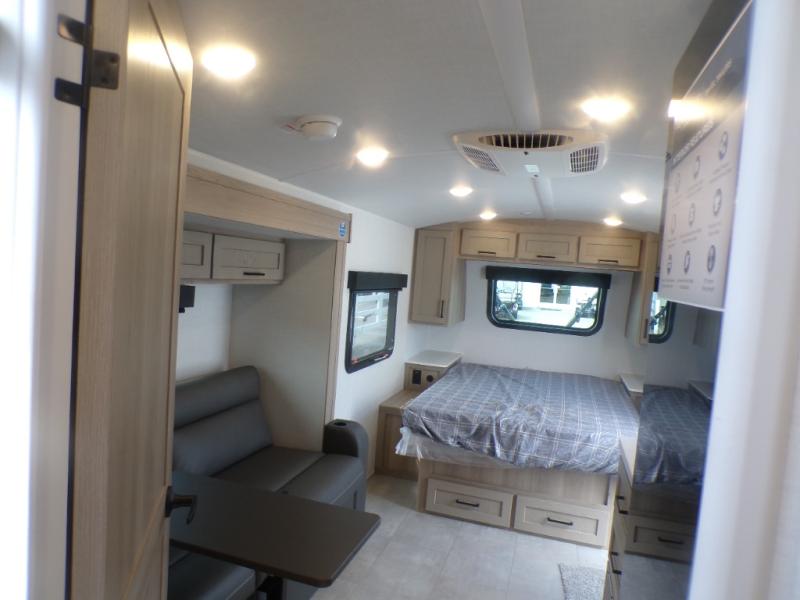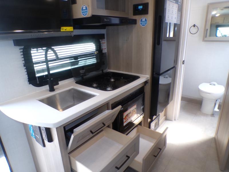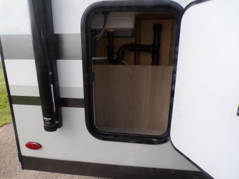 Get ready for a spacious and comfortable trip in this trailer, plus you will have a convenient rear full bathroom with an oversized shower and linen storage to utilize instead of using the campground's facilities. The walk-around full bed gives you two sides with wardrobes to claim as your own. And the kitchen offers full amenities to make meals, and the outside griddle gives you even more choices when cooking. You can relax, dine, or even work from the slide out sofa with a 30" x 15" table and watch the 32" TV. You will find storage along the exterior for your outdoor gear, plus a 14' power awning.