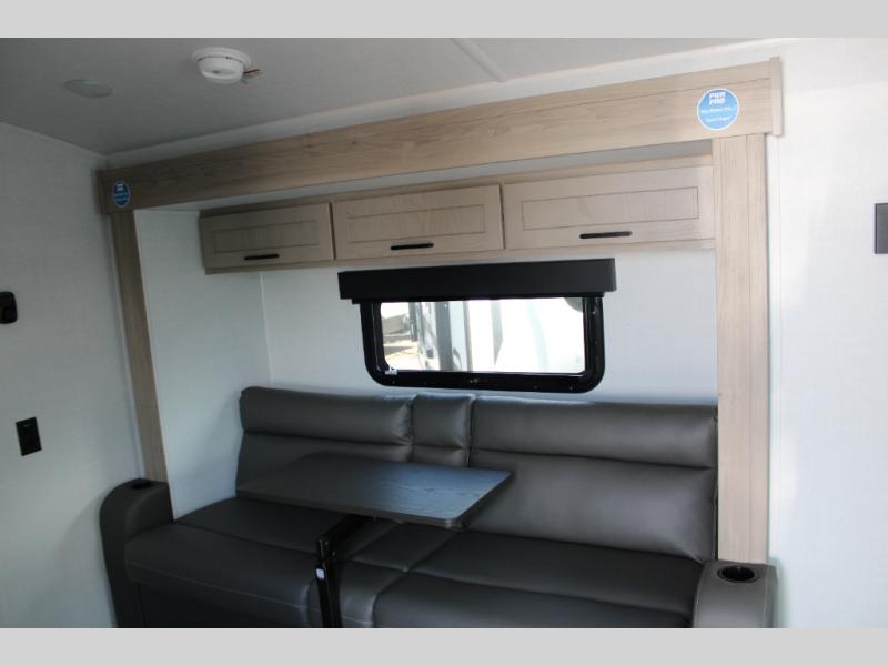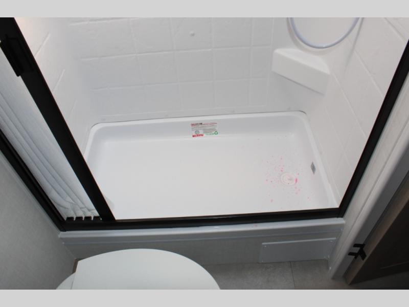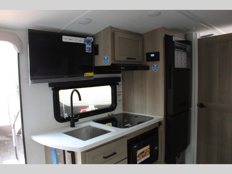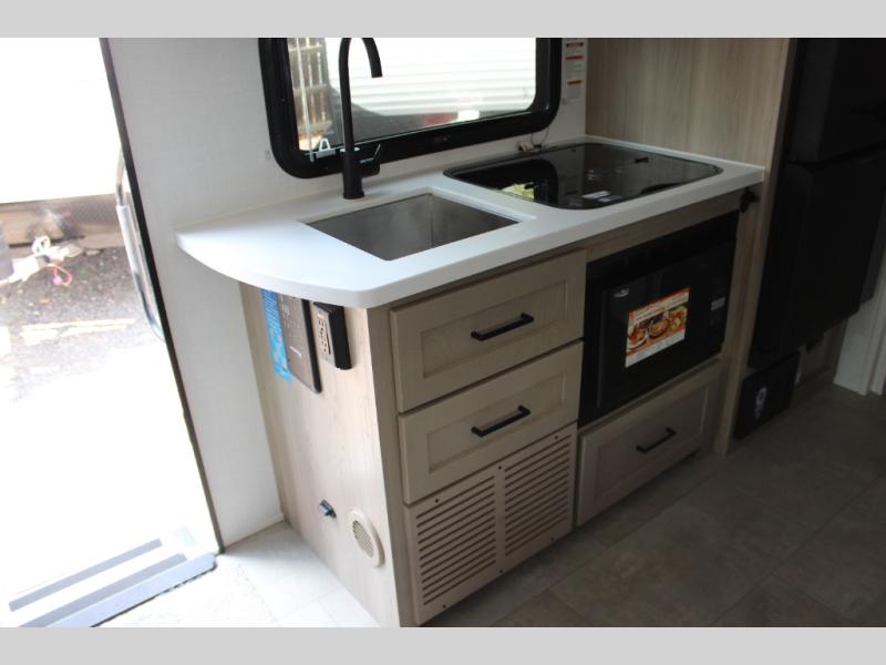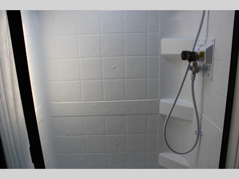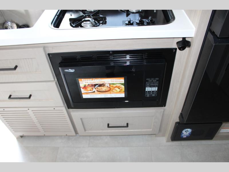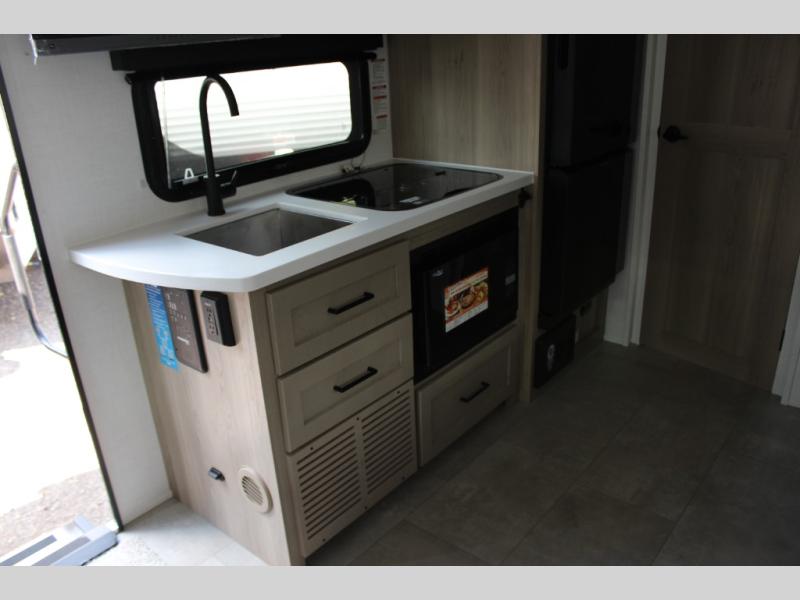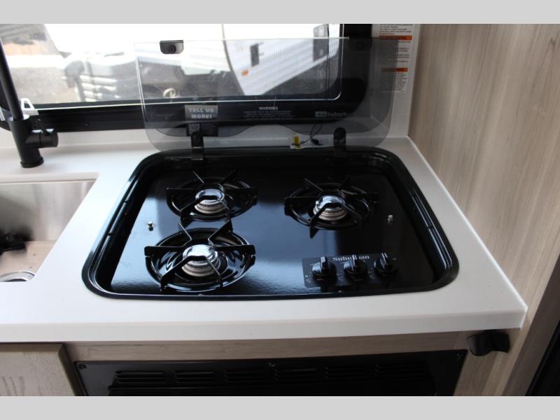 Get ready for a spacious and comfortable trip in this trailer, plus you will have a convenient rear full bathroom with an oversized shower and linen storage to utilize instead of using the campground's facilities. The walk-around full bed gives you two sides with wardrobes to claim as your own. And the kitchen offers full amenities to make meals, and the outside griddle gives you even more choices when cooking. You can relax, dine, or even work from the slide out sofa with a 30" x 15" table and watch the 32" TV. You will find storage along the exterior for your outdoor gear, plus a 14' power awning.