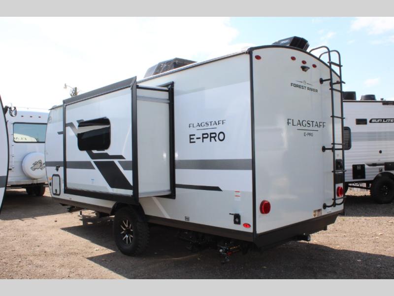 With any Flagstaff E-Pro travel trailer by Forest River, you will experience lightweight towing, style and features that will meet your needs, plus amenities that give you more than you expected! Built with interior and exterior composite sidewall construction, tongue and grove plywood flooring, and a vacuum laminated roof and walls, plus torsion axle, Rubber-Ryde suspension, and a tire pressure monitoring system for safety while traveling. And the 200 watt roof mount solar panel with 1,800-watt inverter will allow you to stay off-grid if you like. The interior offers a comfortable environment with the choice to use the air conditioner or furnace, and a 12V entertainment TV with a stereo to stay up to date on your favorite movies. Make your selection today!