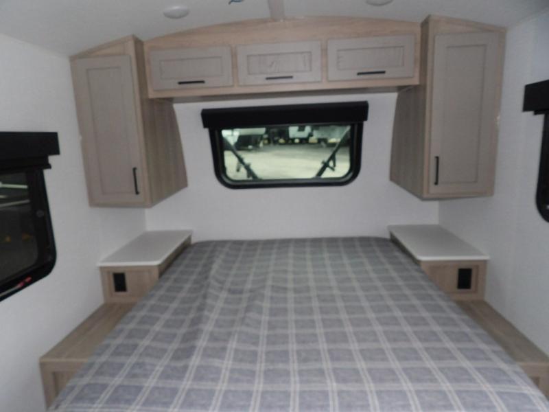 Get ready for a spacious and comfortable trip in this trailer, plus you will have a convenient rear full bathroom with an oversized shower and linen storage to utilize instead of using the campground's facilities. The walk-around full bed gives you two sides with wardrobes to claim as your own. And the kitchen offers full amenities to make meals. You can relax, dine, or even work from the slide out sofa with a 30" x 15" table and watch the TV. You will find storage along the exterior for your outdoor gear, plus a 14' power awning.
