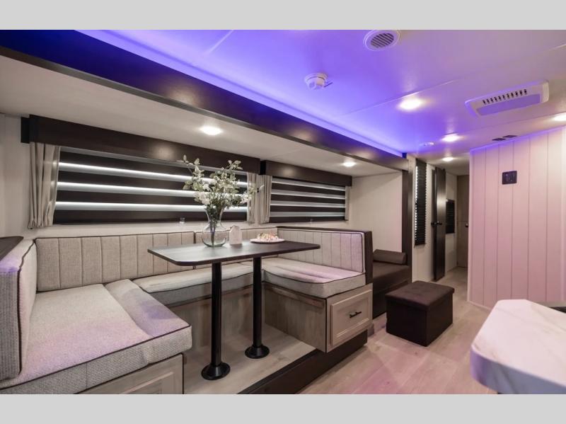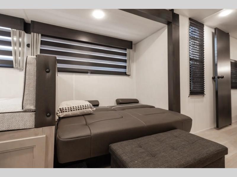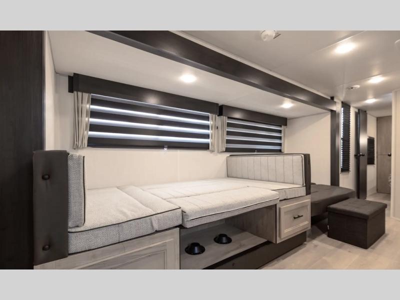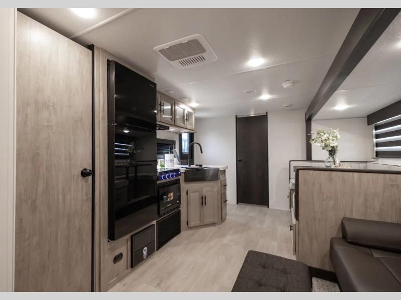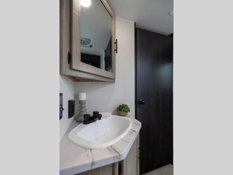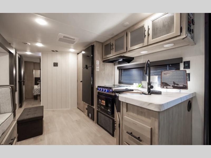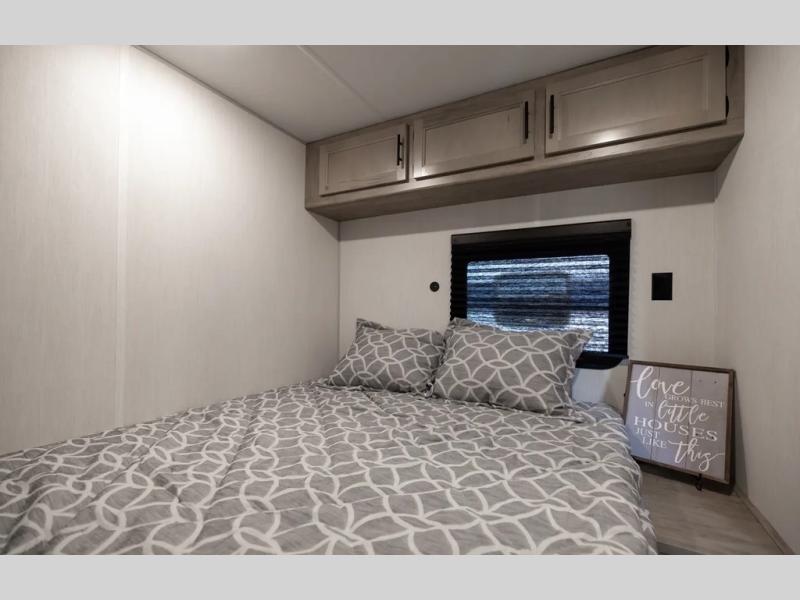 Get ready for a spacious and comfortable trip in this trailer, plus you will have a convenient rear full bathroom with an oversized shower and linen storage to utilize instead of using the campground's facilities. The walk-around full bed gives you two sides with wardrobes to claim as your own. And the kitchen offers full amenities to make meals. You can relax, dine, or even work from the slide out sofa with a 30" x 15" table and watch the TV. You will find storage along the exterior for your outdoor gear, plus a 14' power awning.