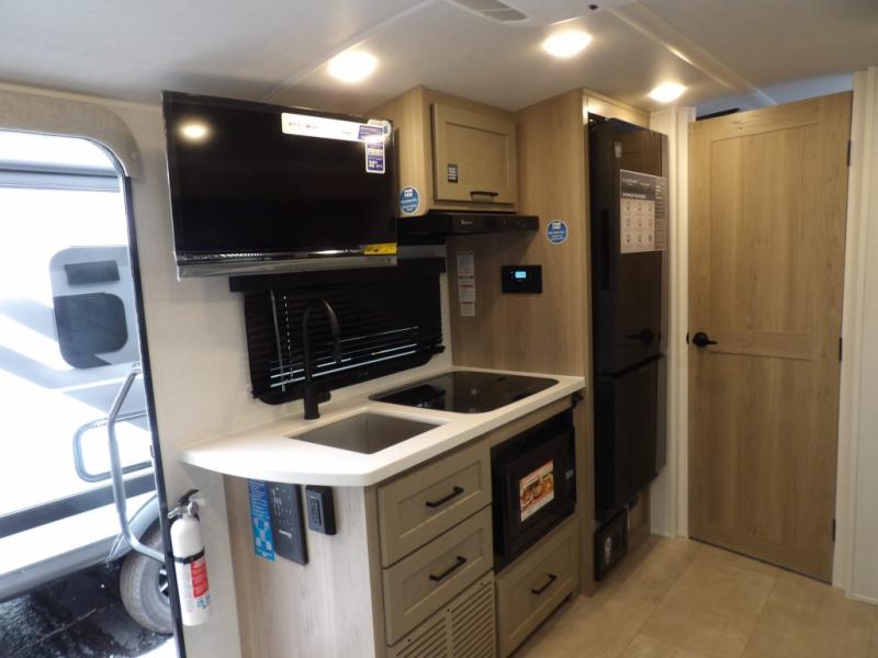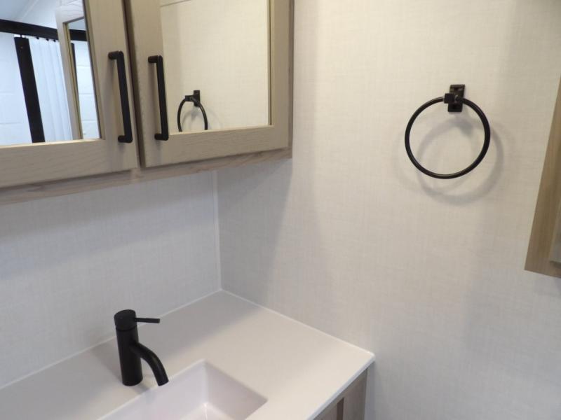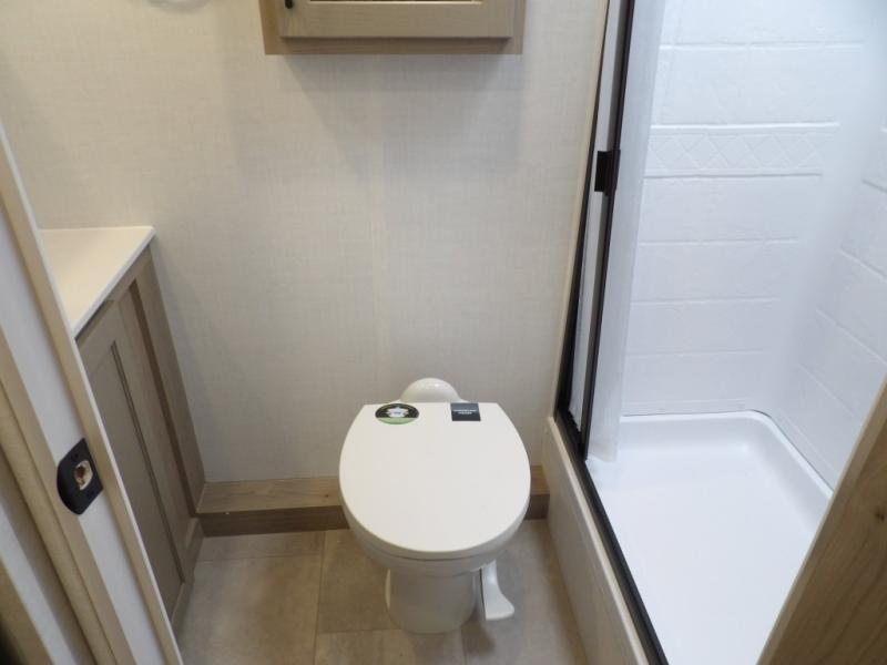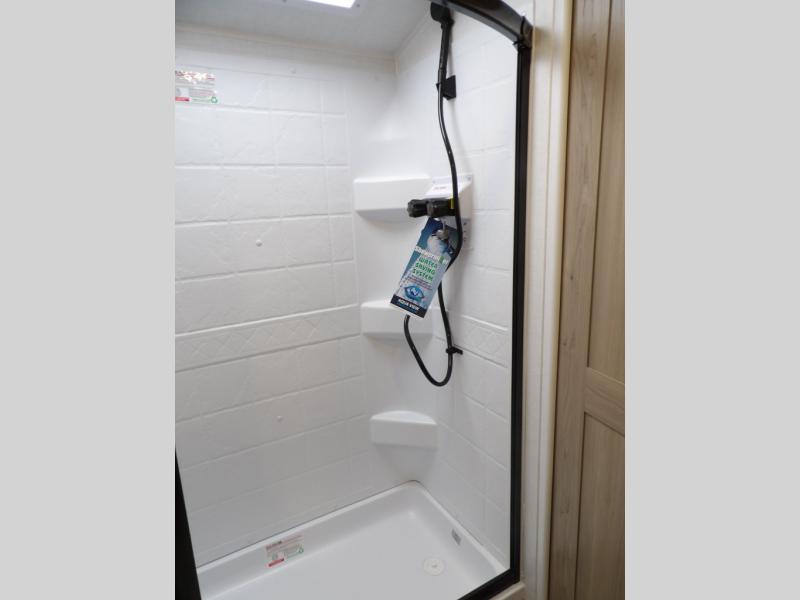 Get ready for a spacious and comfortable trip in this trailer, plus you will have a convenient rear full bathroom with an oversized shower and linen storage to utilize instead of using the campground's facilities. The walk-around full bed gives you two sides with wardrobes to claim as your own. And the kitchen offers full amenities to make meals. You can relax, dine, or even work from the slide out sofa with a 30" x 15" table and watch the TV. You will find storage along the exterior for your outdoor gear, plus a 14' power awning.