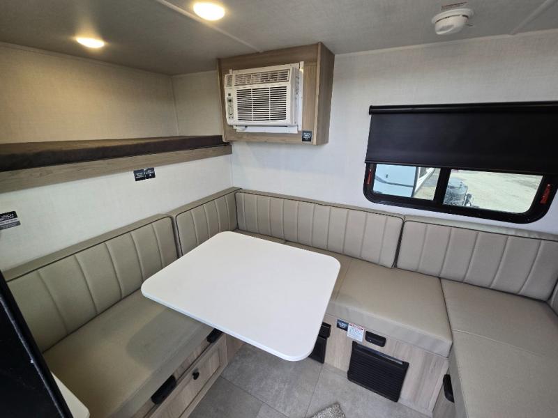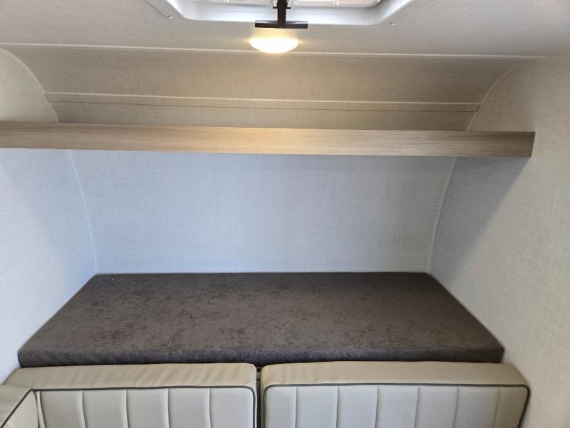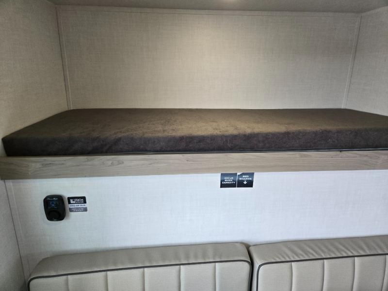 With its practical design, this trailer is designed to make your travels easy and enjoyable. The bunk beds are a fun and practical sleeping solution for kids. Perfect for sleepovers, family gatherings, or outdoor adventures! The U-dinette is a cozy spot for meals and conversation and can convert into two more sleeping spaces. The outside kitchen features a fridge and sink, perfect for alfresco dining and outdoor cooking. The shelf provides ample storage space for outdoor gear, toys, and essentials. Plus, the pass-thru storage allows for easy access to your belongings. The exterior awning creates a comfortable outdoor living space, perfect for relaxing, socializing, or enjoying the great outdoors.