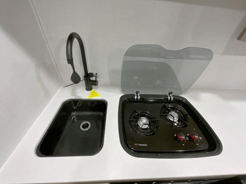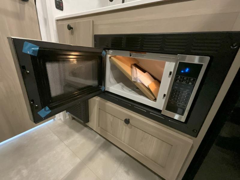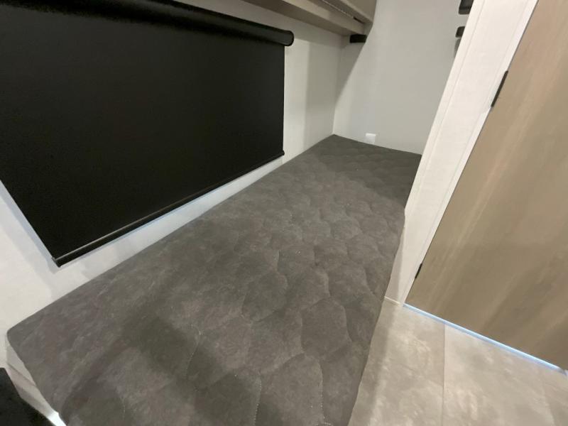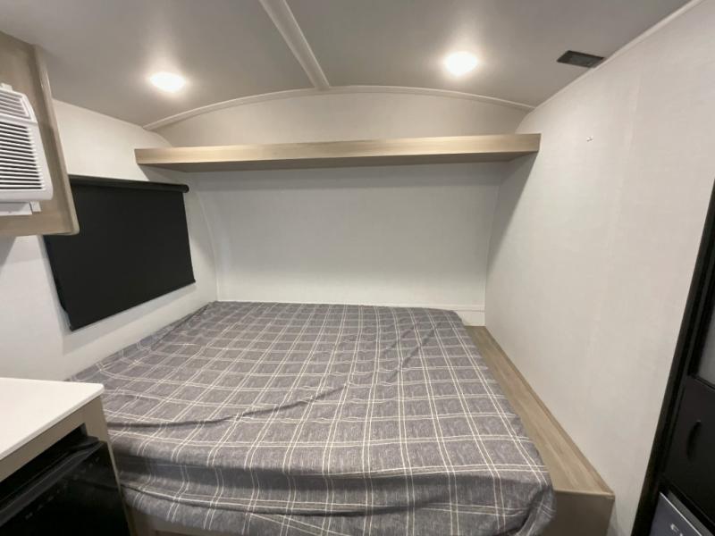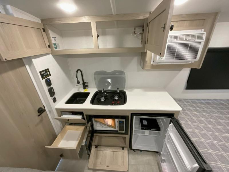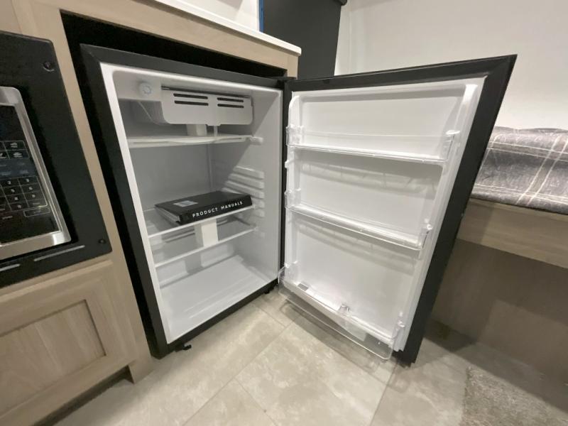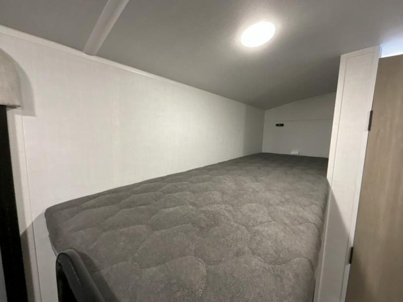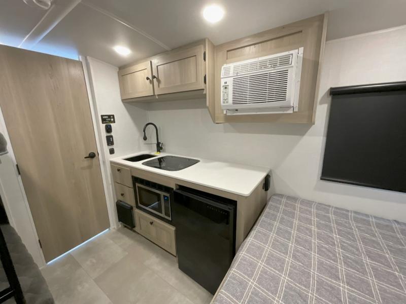 Perfect for couples, families, or friends, this trailer offers a comfortable and functional space to relax, recharge, and explore. The bathroom is a serene retreat, equipped with everything you need to refresh and rejuvenate after a day of adventure. The two bunk beds give a snug and inviting sleeping spot, perfect for kids or adults looking for a cozy spot to rest. The kitchen is equipped with a microwave for quick and easy meal prep, and a fridge to keep your favorite snacks and drinks fresh. Overhead cabinets provide plenty of storage for your gear, cookware, and essentials, keeping your trailer tidy and organized. The bed offers a restful sleeping space, perfect for unwinding after a long day of exploring.