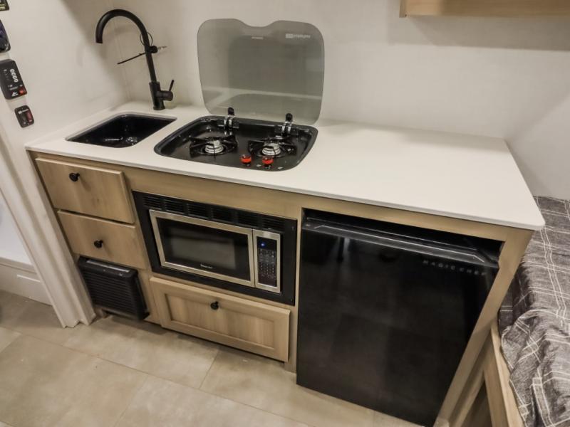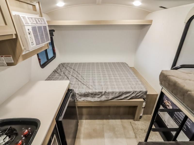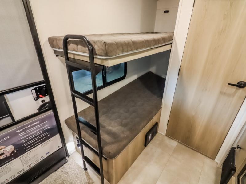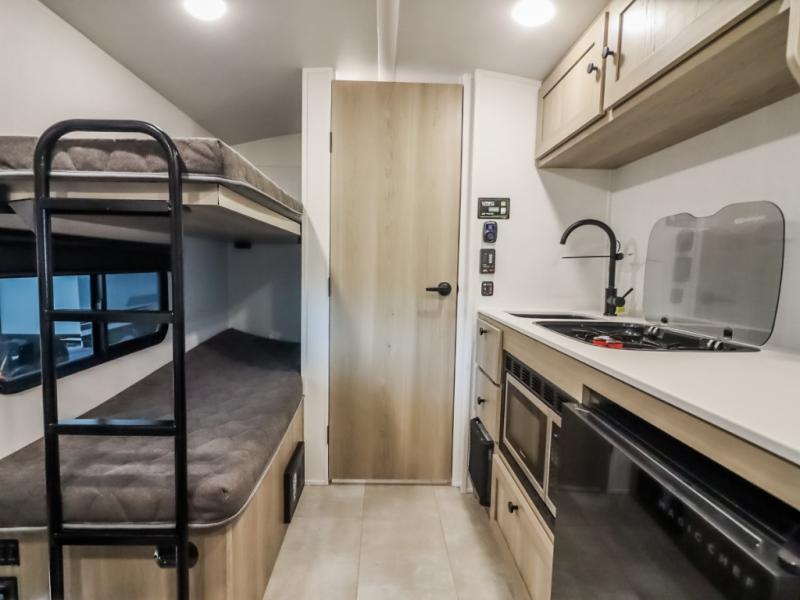 Perfect for couples, families, or friends, this trailer offers a comfortable and functional space to relax, recharge, and explore. The full bathroom is a serene retreat, equipped with everything you need to refresh and rejuvenate after a day of adventure. The two bunk beds give a snug and inviting sleeping spot, perfect for kids or adults looking for a cozy spot to rest. The kitchen is equipped with a microwave for quick and easy meal prep, and a fridge to keep your favorite snacks and drinks fresh. Overhead cabinets provide plenty of storage for your gear, cookware, and essentials, keeping your trailer tidy and organized. The bed offers a restful sleeping space, perfect for unwinding after a long day of exploring.