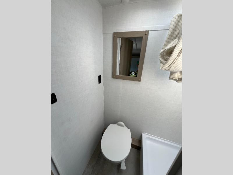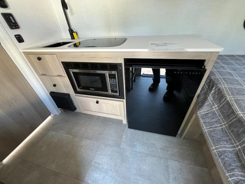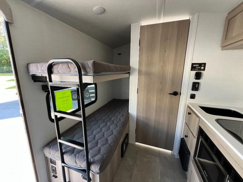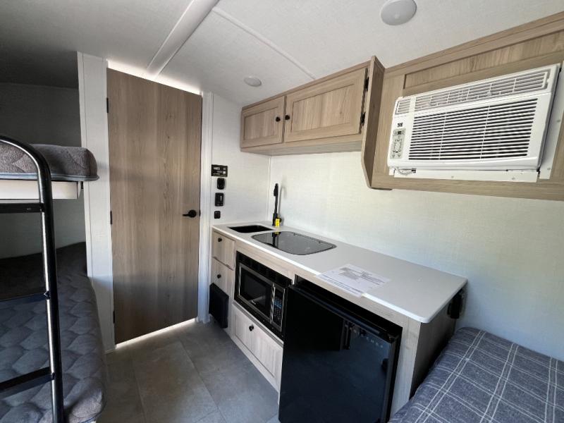 Perfect for couples, families, or friends, this trailer offers a comfortable and functional space to relax, recharge, and explore. The full bathroom is a serene retreat, equipped with everything you need to refresh and rejuvenate after a day of adventure. The two bunk beds give a snug and inviting sleeping spot, perfect for kids or adults looking for a cozy spot to rest. The kitchen is equipped with a microwave for quick and easy meal prep, and a fridge to keep your favorite snacks and drinks fresh. Overhead cabinets provide plenty of storage for your gear, cookware, and essentials, keeping your trailer tidy and organized. The bed offers a restful sleeping space, perfect for unwinding after a long day of exploring.