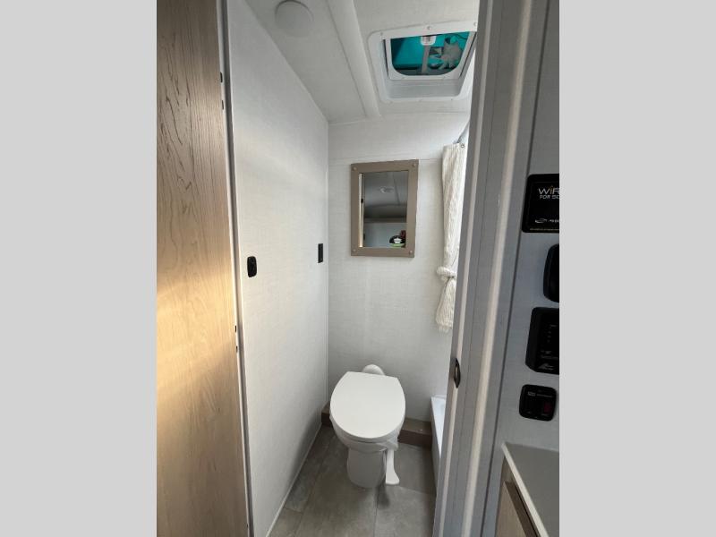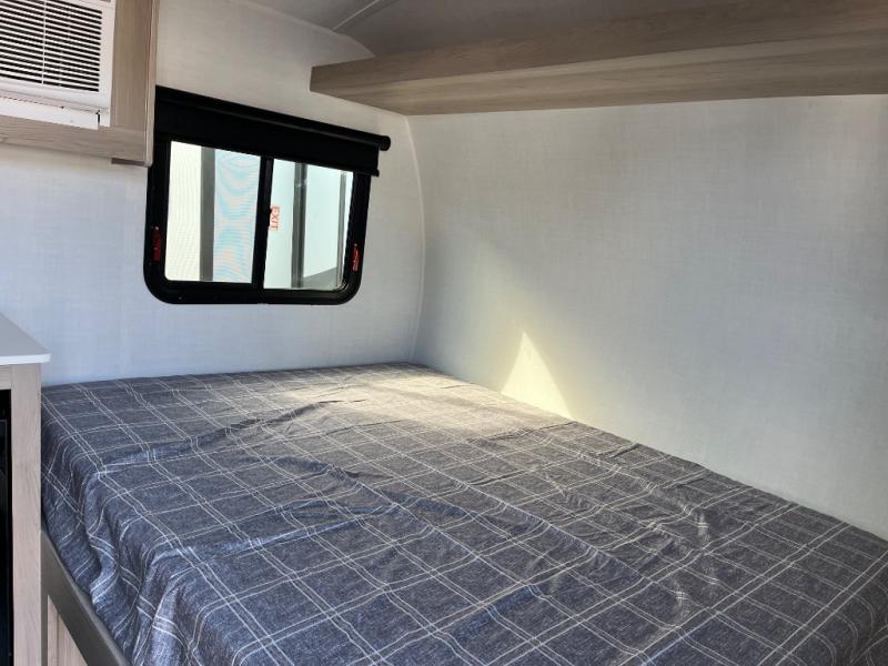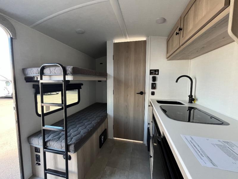 Perfect for couples, families, or friends, this trailer offers a comfortable and functional space to relax, recharge, and explore. The full bathroom is a serene retreat, equipped with everything you need to refresh and rejuvenate after a day of adventure. The two bunk beds give a snug and inviting sleeping spot, perfect for kids or adults looking for a cozy spot to rest. The kitchen is equipped with a microwave for quick and easy meal prep, and a fridge to keep your favorite snacks and drinks fresh. Overhead cabinets provide plenty of storage for your gear, cookware, and essentials, keeping your trailer tidy and organized. The bed offers a restful sleeping space, perfect for unwinding after a long day of exploring.