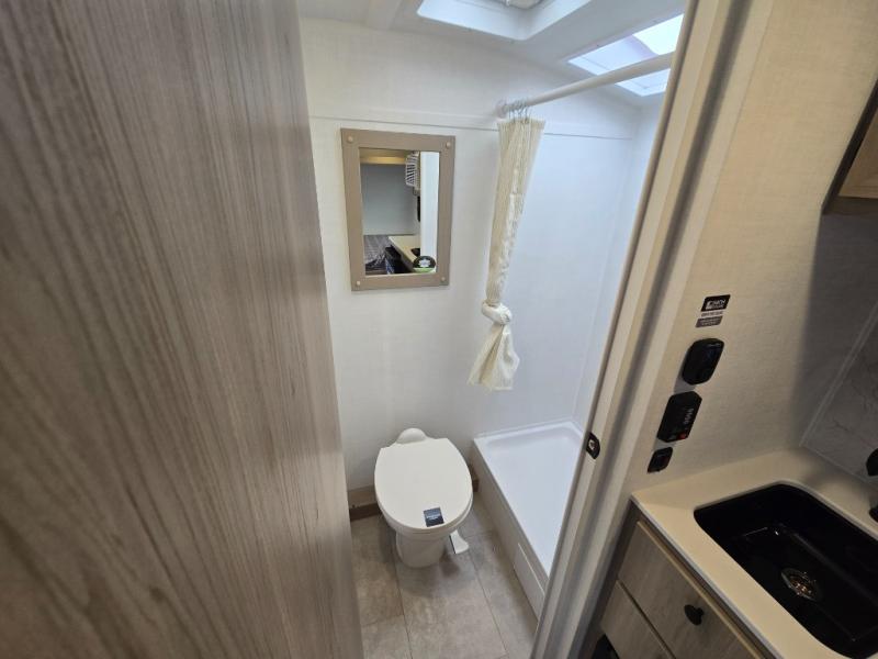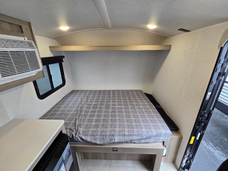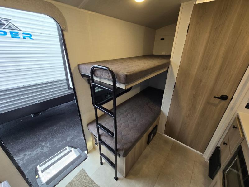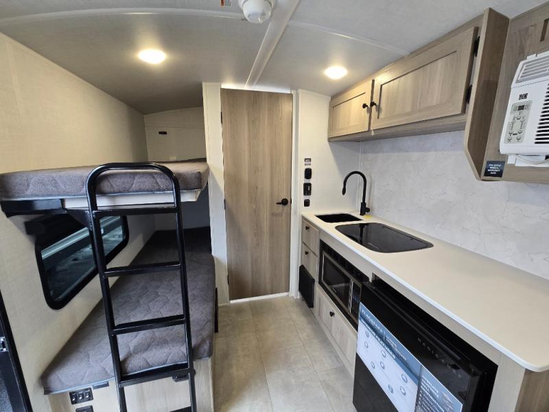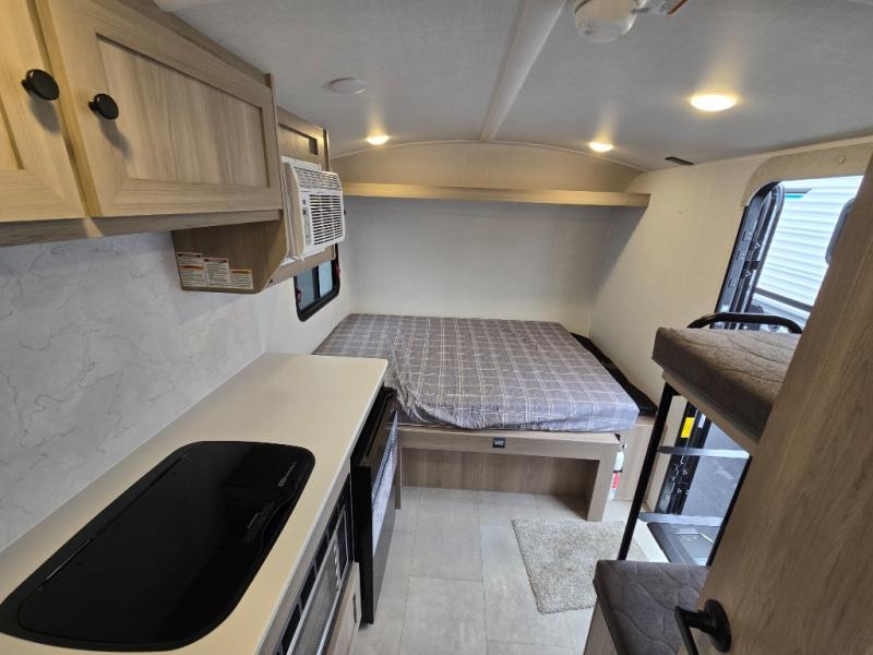 Perfect for couples, families, or friends, this trailer offers a comfortable and functional space to relax, recharge, and explore. The full bathroom is a serene retreat, equipped with everything you need to refresh and rejuvenate after a day of adventure. The two bunk beds give a snug and inviting sleeping spot, perfect for kids or adults looking for a cozy spot to rest. The kitchen is equipped with a microwave for quick and easy meal prep, and a fridge to keep your favorite snacks and drinks fresh. Overhead cabinets provide plenty of storage for your gear, cookware, and essentials, keeping your trailer tidy and organized. The bed offers a restful sleeping space, perfect for unwinding after a long day of exploring.