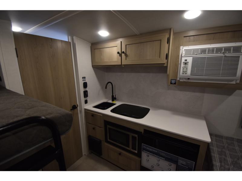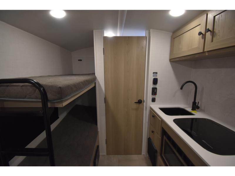 Perfect for couples, families, or friends, this trailer offers a comfortable and functional space to relax, recharge, and explore. The full bathroom is a serene retreat, equipped with everything you need to refresh and rejuvenate after a day of adventure. The two bunk beds give a snug and inviting sleeping spot, perfect for kids or adults looking for a cozy spot to rest. The kitchen is equipped with a microwave for quick and easy meal prep, and a fridge to keep your favorite snacks and drinks fresh. Overhead cabinets provide plenty of storage for your gear, cookware, and essentials, keeping your trailer tidy and organized. The bed offers a restful sleeping space, perfect for unwinding after a long day of exploring.