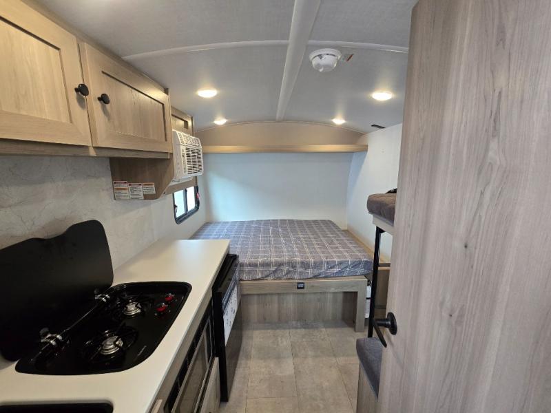 Perfect for couples, families, or friends, this trailer offers a comfortable and functional space to relax, recharge, and explore. The full bathroom is a serene retreat, equipped with everything you need to refresh and rejuvenate after a day of adventure. The two bunk beds give a snug and inviting sleeping spot, perfect for kids or adults looking for a cozy spot to rest. The kitchen is equipped with a microwave for quick and easy meal prep, and a fridge to keep your favorite snacks and drinks fresh. Overhead cabinets provide plenty of storage for your gear, cookware, and essentials, keeping your trailer tidy and organized. The bed offers a restful sleeping space, perfect for unwinding after a long day of exploring.