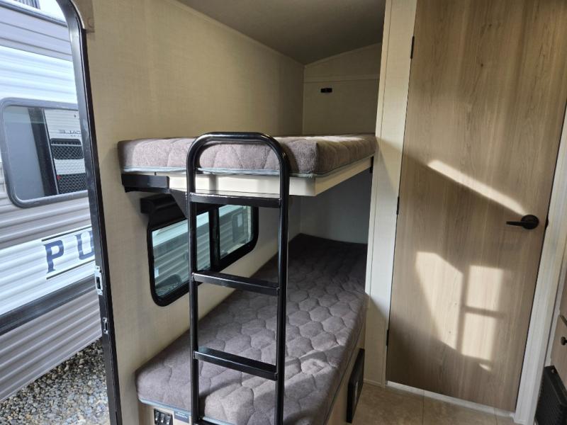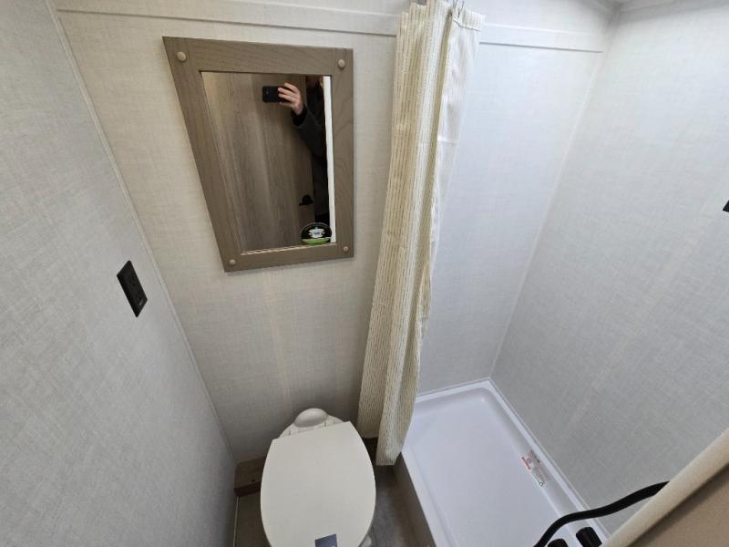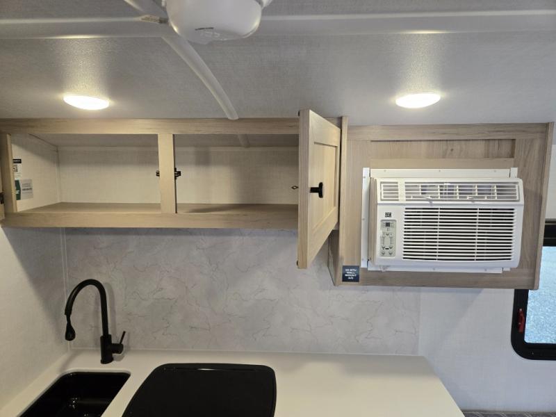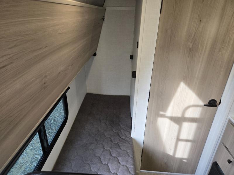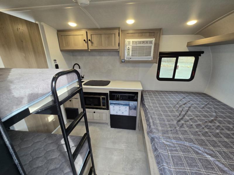 Perfect for couples, families, or friends, this trailer offers a comfortable and functional space to relax, recharge, and explore. The full bathroom is a serene retreat, equipped with everything you need to refresh and rejuvenate after a day of adventure. The two bunk beds give a snug and inviting sleeping spot, perfect for kids or adults looking for a cozy spot to rest. The kitchen is equipped with a microwave for quick and easy meal prep, and a fridge to keep your favorite snacks and drinks fresh. Overhead cabinets provide plenty of storage for your gear, cookware, and essentials, keeping your trailer tidy and organized. The bed offers a restful sleeping space, perfect for unwinding after a long day of exploring.