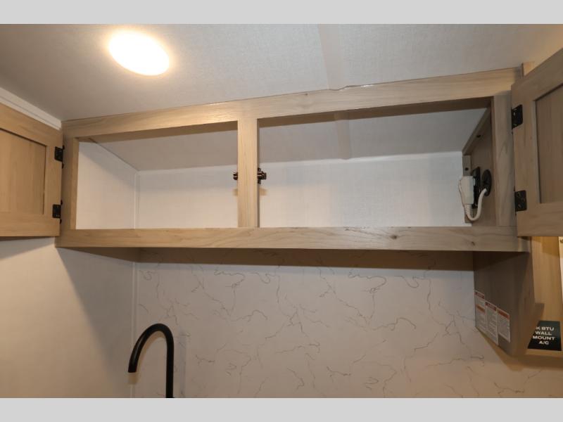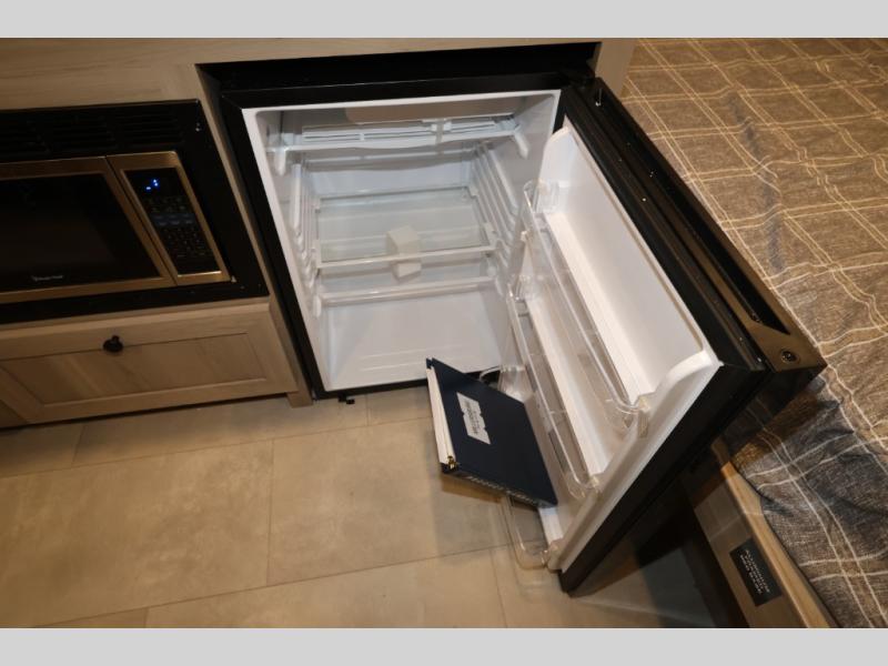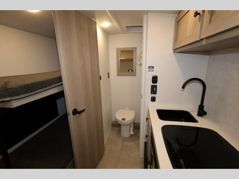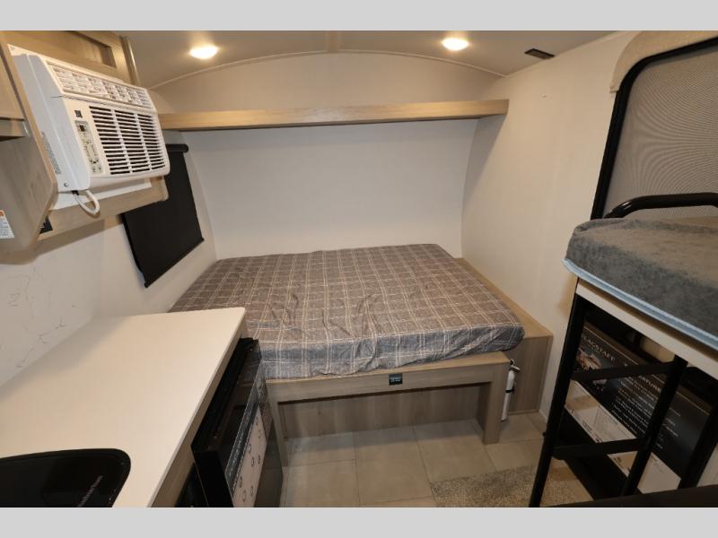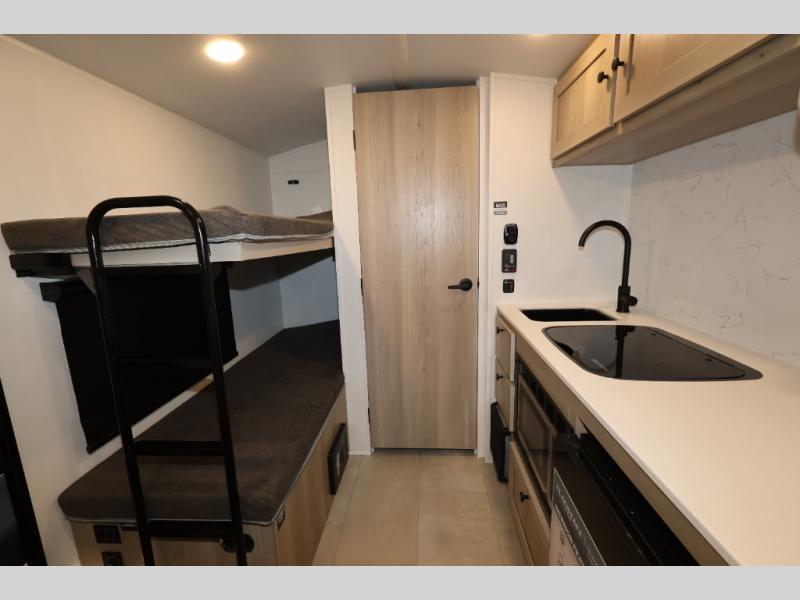 Perfect for couples, families, or friends, this trailer offers a comfortable and functional space to relax, recharge, and explore. The full bathroom is a serene retreat, equipped with everything you need to refresh and rejuvenate after a day of adventure. The two bunk beds give a snug and inviting sleeping spot, perfect for kids or adults looking for a cozy spot to rest. The kitchen is equipped with a microwave for quick and easy meal prep, and a fridge to keep your favorite snacks and drinks fresh. Overhead cabinets provide plenty of storage for your gear, cookware, and essentials, keeping your trailer tidy and organized. The bed offers a restful sleeping space, perfect for unwinding after a long day of exploring.