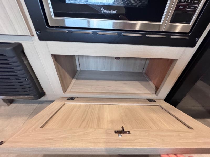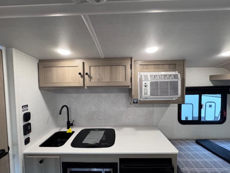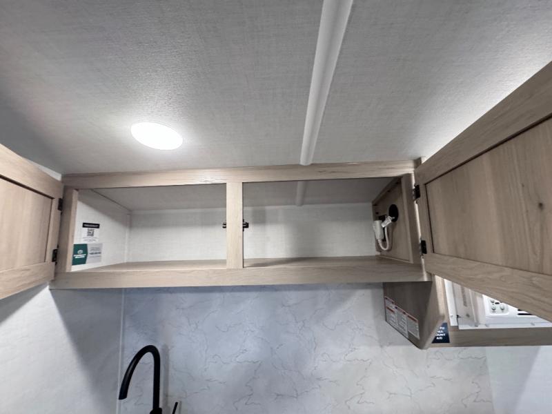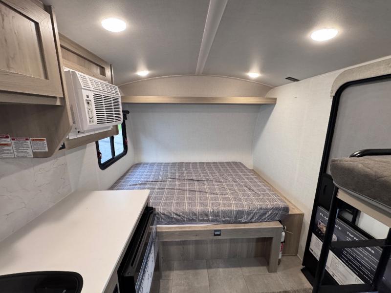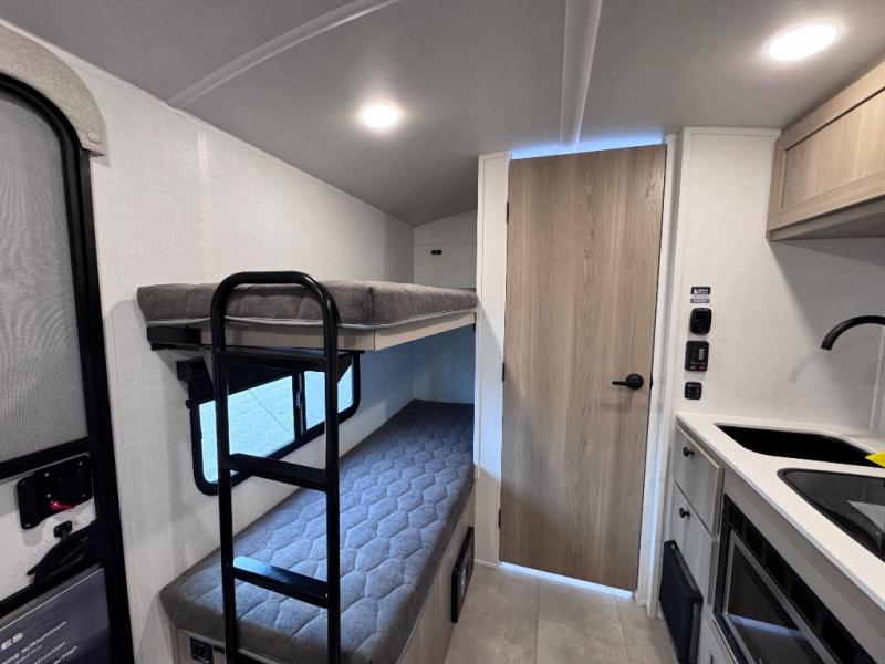 Perfect for couples, families, or friends, this trailer offers a comfortable and functional space to relax, recharge, and explore. The full bathroom is a serene retreat, equipped with everything you need to refresh and rejuvenate after a day of adventure. The two bunk beds give a snug and inviting sleeping spot, perfect for kids or adults looking for a cozy spot to rest. The kitchen is equipped with a microwave for quick and easy meal prep, and a fridge to keep your favorite snacks and drinks fresh. Overhead cabinets provide plenty of storage for your gear, cookware, and essentials, keeping your trailer tidy and organized. The bed offers a restful sleeping space, perfect for unwinding after a long day of exploring.