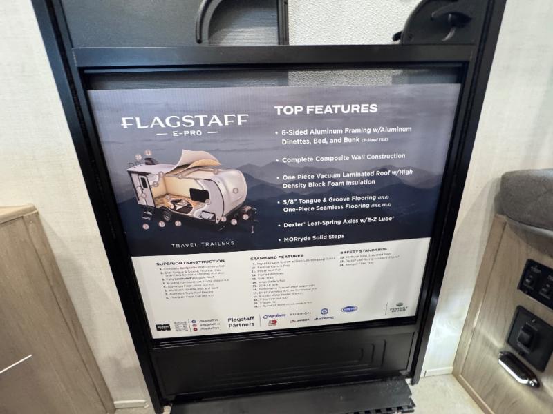 With any Flagstaff E-Pro travel trailer by Forest River, you will experience lightweight towing, style and features that will meet your needs, plus amenities that give you more than you expected! Built with interior and exterior composite sidewall construction for added strength and durability, a fully laminated roof for weather-tight protection, and aluminum truss roof bracing for enhanced stability. These trailers are equipped with Dexter leaf-spring axles for smooth towing and durable performance. The interior features an aluminum dinette, bed, and bunk, providing a strong and lightweight framework for comfortable living. Additionally, the backup camera prep ensures a safe and stress-free reversing experience. Make your selection today!
