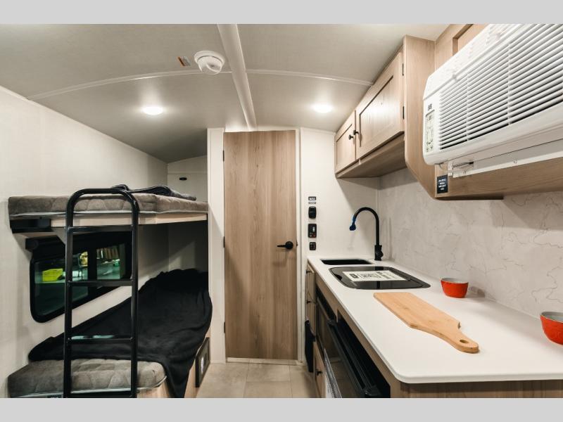 Perfect for couples, families, or friends, this trailer offers a comfortable and functional space to relax, recharge, and explore. The full bathroom is a serene retreat, equipped with everything you need to refresh and rejuvenate after a day of adventure. The two bunk beds give a snug and inviting sleeping spot, perfect for kids or adults looking for a cozy spot to rest. The kitchen is equipped with a microwave for quick and easy meal prep, and a fridge to keep your favorite snacks and drinks fresh. Overhead cabinets provide plenty of storage for your gear, cookware, and essentials, keeping your trailer tidy and organized. The bed offers a restful sleeping space, perfect for unwinding after a long day of exploring.