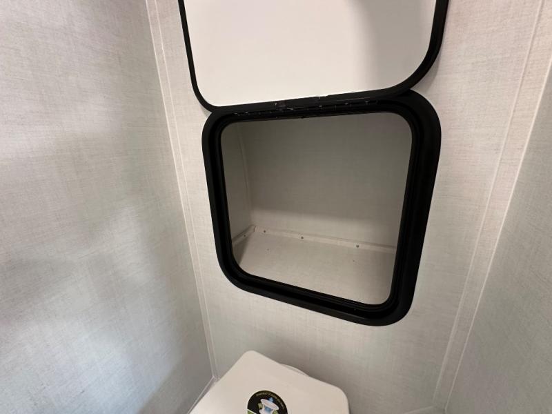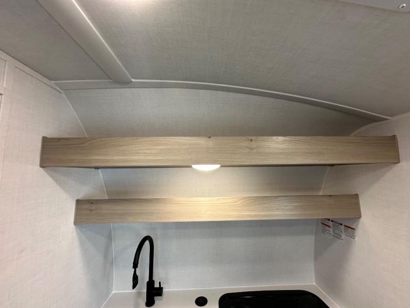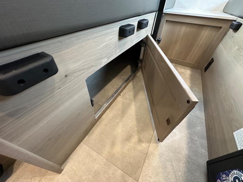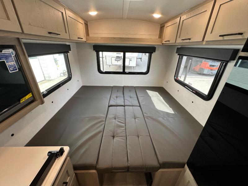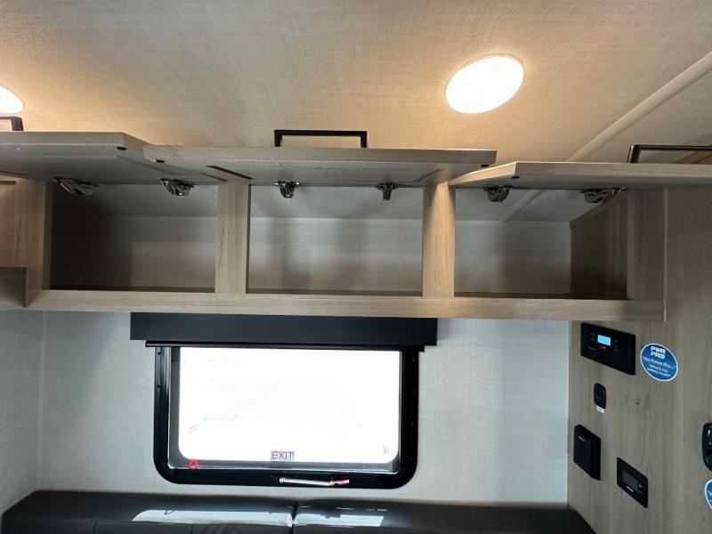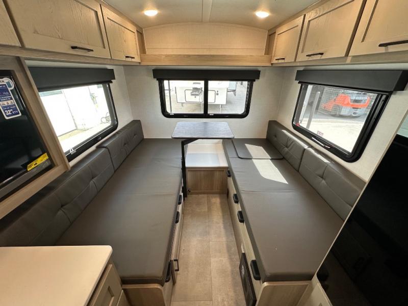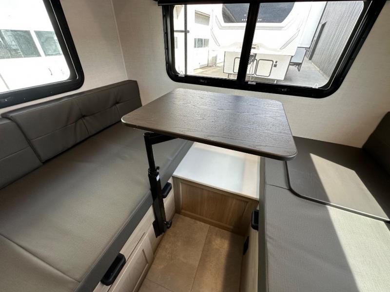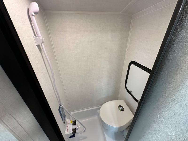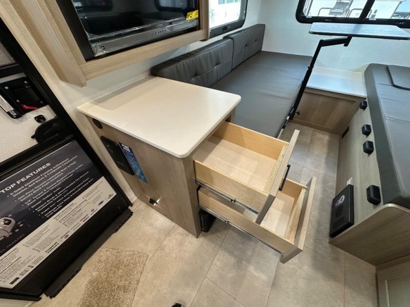 It's time to hit the road in this small, yet walkable travel trailer that is versatile to your needs and offers everything you will want to stay comfortable at a campground or off-grid. You can make meals using the cooktop and microwave up front, and store your cold items in the 12V refrigerator. Take turns getting cleaned up in the wet bath so you can skip the public facilities, and store your clothing in the overhead cabinets. You can watch the 32" TV while dining or sleeping on the twin beds that offer a table top to help you convert this area into a king bed. And the 10' power awning will give you a place to hang out while you use the outdoor griddle.