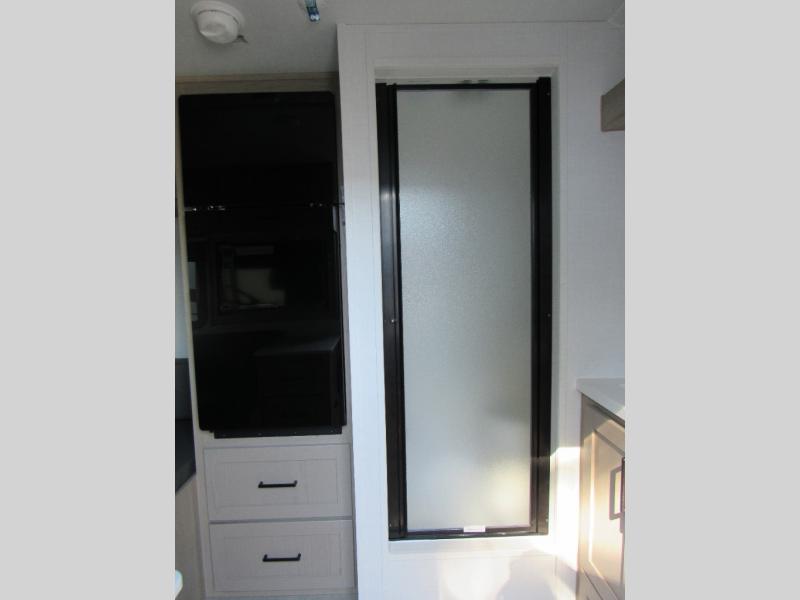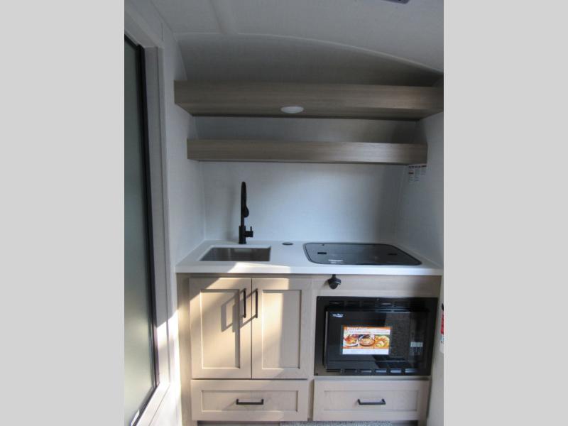 It's time to hit the road in this small, yet walkable travel trailer that is versatile to your needs and offers everything you will want to stay comfortable at a campground or off-grid. You can make meals using the cooktop and microwave up front, and store your cold items in the 12V refrigerator. Take turns getting cleaned up in the wet bath so you can skip the public facilities, and store your clothing in the overhead cabinets. You can watch the 32" TV while dining or sleeping on the twin beds that offer a table top to help you convert this area into a king bed. And the 10' power awning will give you a place to hang out while you use the outdoor griddle.