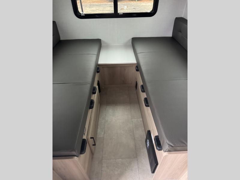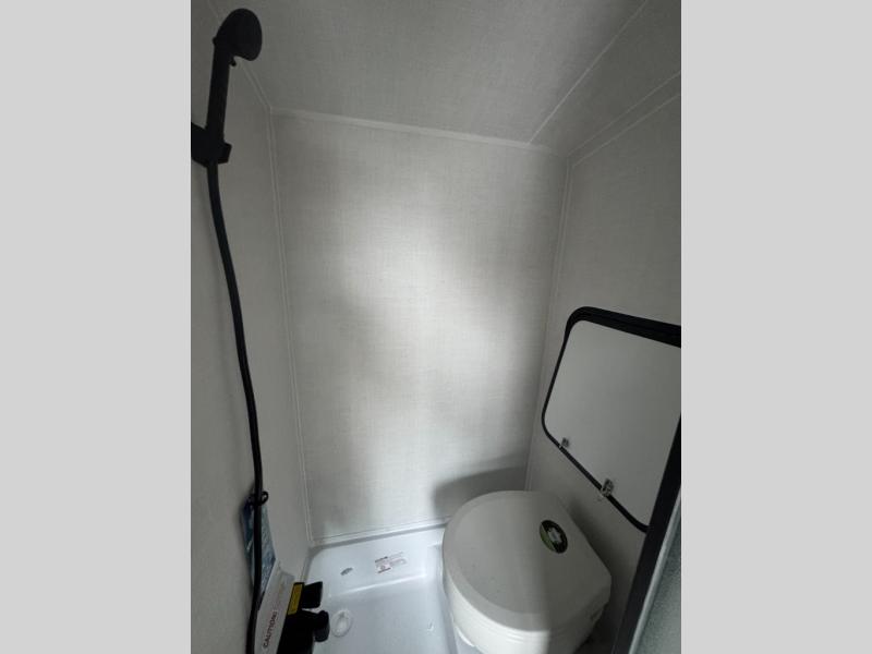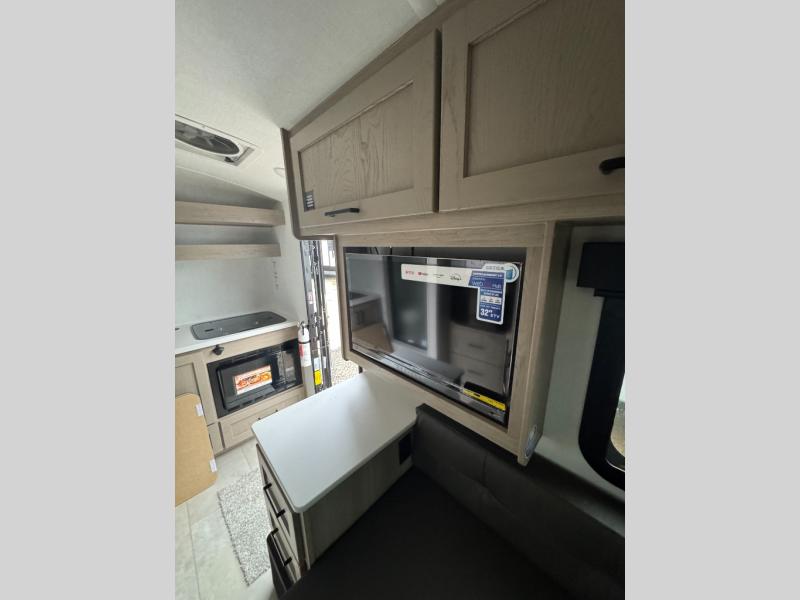 It's time to hit the road in this small, yet walkable travel trailer that is versatile to your needs and offers everything you will want to stay comfortable at a campground or off-grid. You can make meals using the cooktop and microwave up front, and store your cold items in the 12V refrigerator. Take turns getting cleaned up in the wet bath so you can skip the public facilities, and store your clothing in the overhead cabinets. You can watch the 32" TV while dining or sleeping on the twin beds that offer a table top to help you convert this area into a king bed. And the 10' power awning will give you a place to hang out while you use the outdoor griddle.