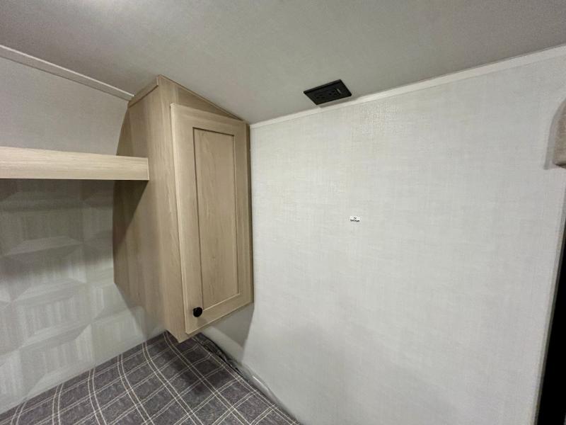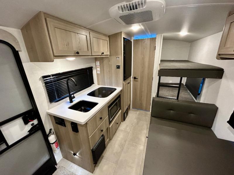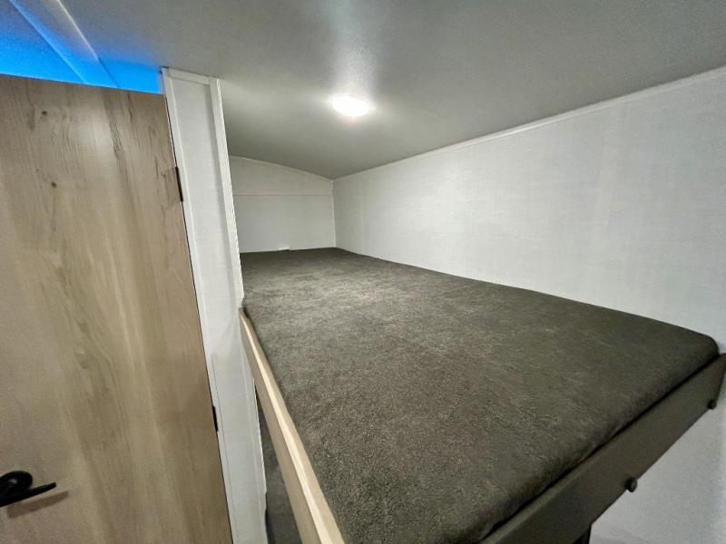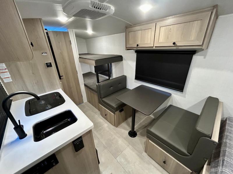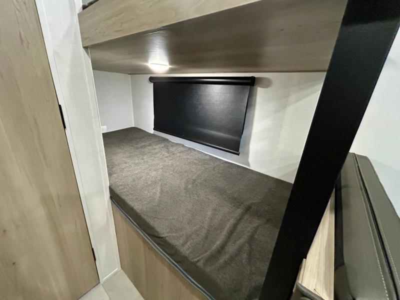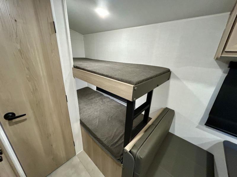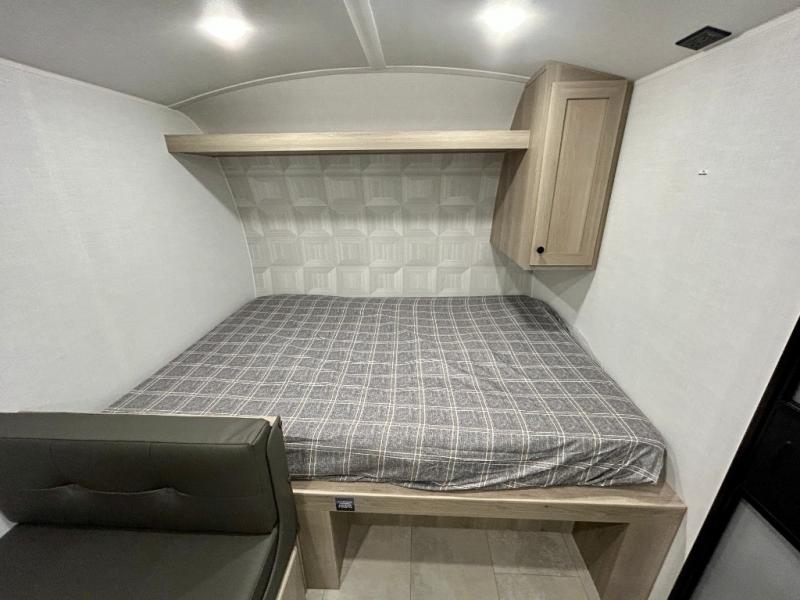 This charming travel trailer is perfect for families or small groups. The front bedroom features a full bed, perfect for a restful night's sleep. Ample storage space ensures you stay organized and clutter-free. The booth dinette is a cozy spot for meals and conversation, while the kitchen area is equipped with a microwave, fridge, and overhead cabinets. Prepare delicious meals and snacks with ease. The bunk beds provide a fun and practical sleeping solution for kids or additional guests. Perfect for sleepovers or family gatherings! The full bathroom is a convenient and refreshing space, with all the essentials for a comfortable stay.