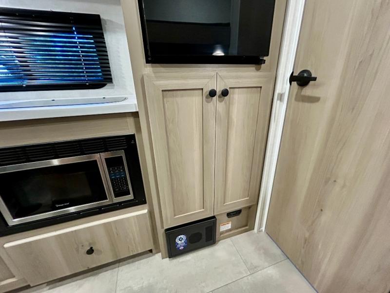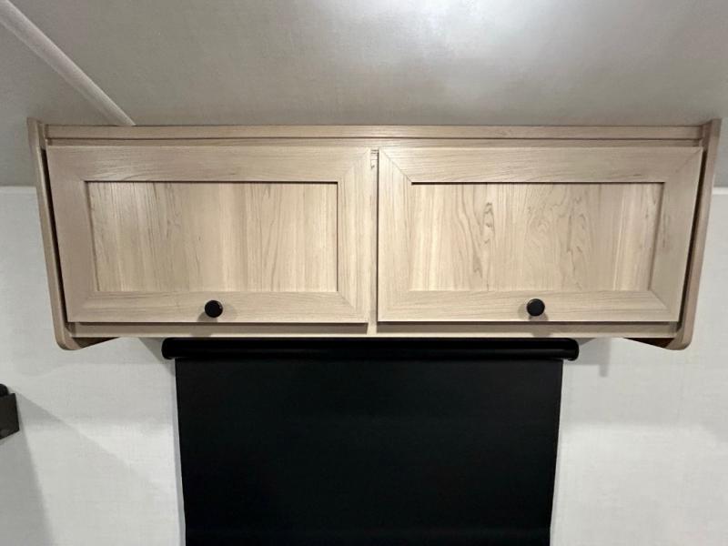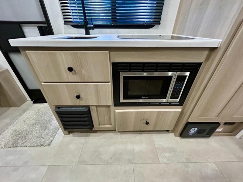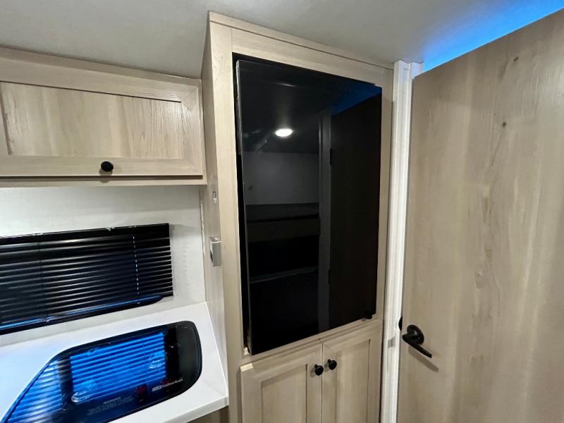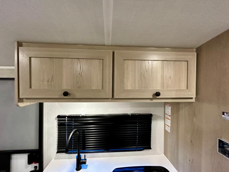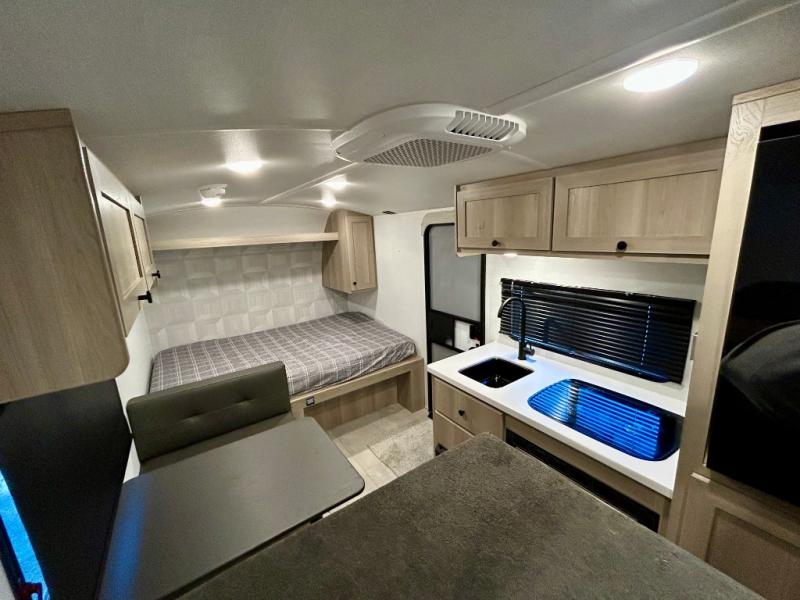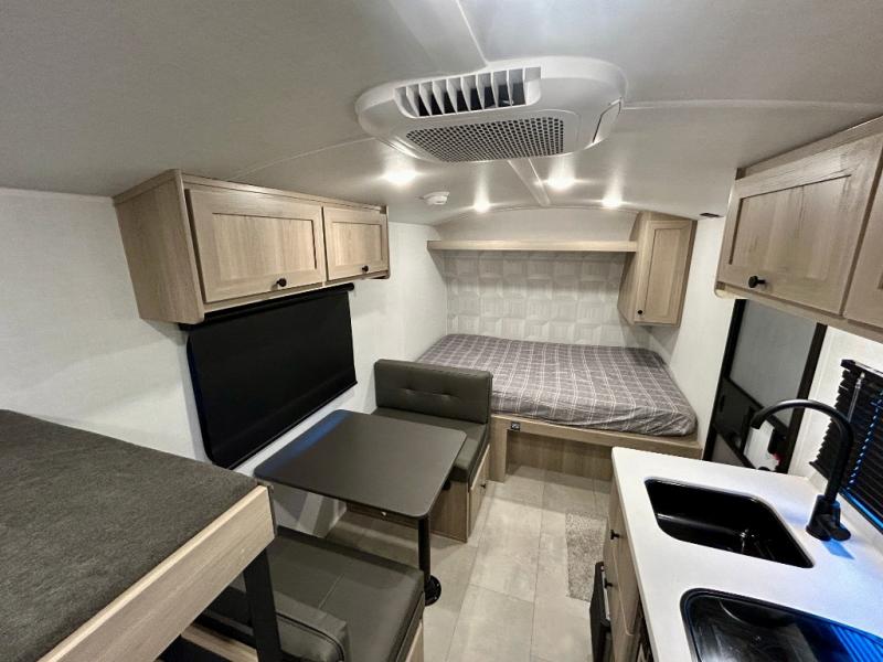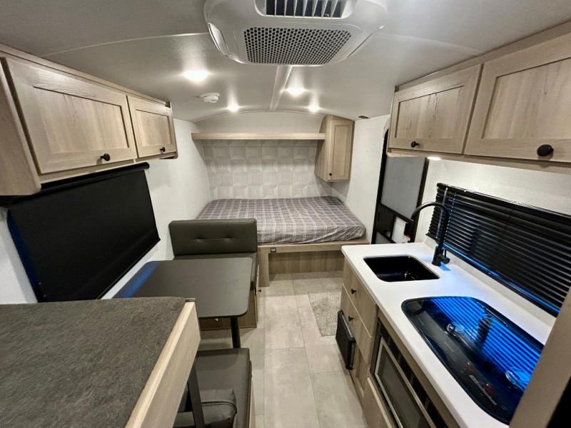 This charming travel trailer is perfect for families or small groups. The front bedroom features a full bed, perfect for a restful night's sleep. Ample storage space ensures you stay organized and clutter-free. The booth dinette is a cozy spot for meals and conversation, while the kitchen area is equipped with a microwave, fridge, and overhead cabinets. Prepare delicious meals and snacks with ease. The bunk beds provide a fun and practical sleeping solution for kids or additional guests. Perfect for sleepovers or family gatherings! The full bathroom is a convenient and refreshing space, with all the essentials for a comfortable stay.