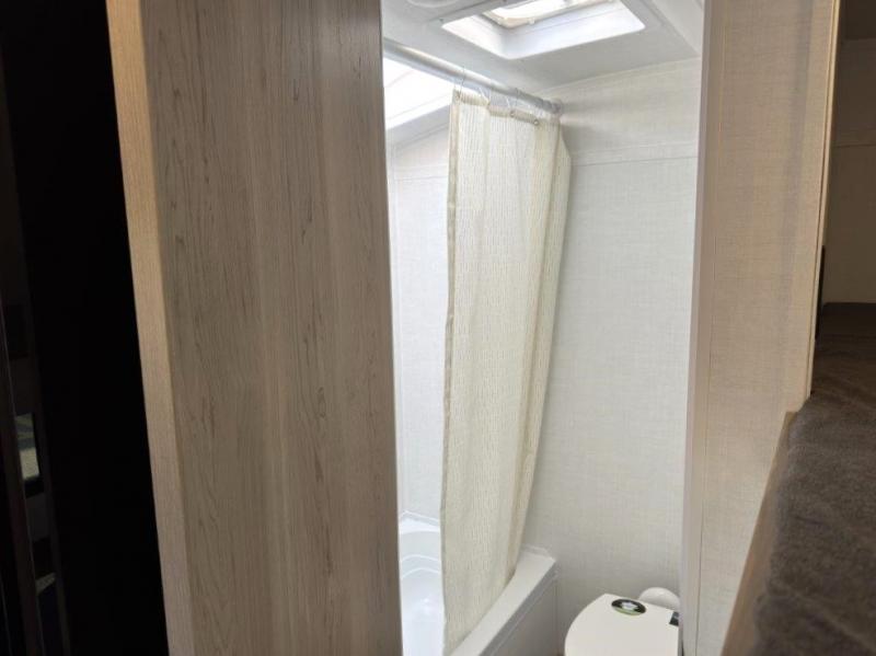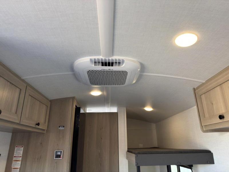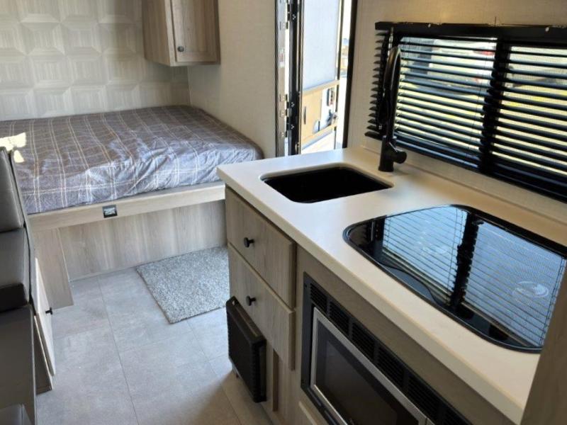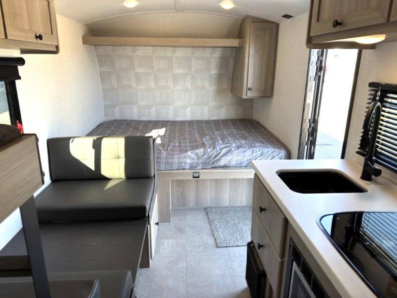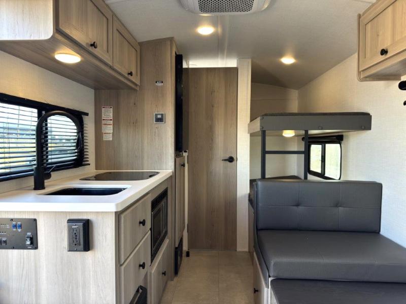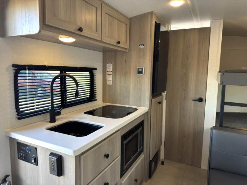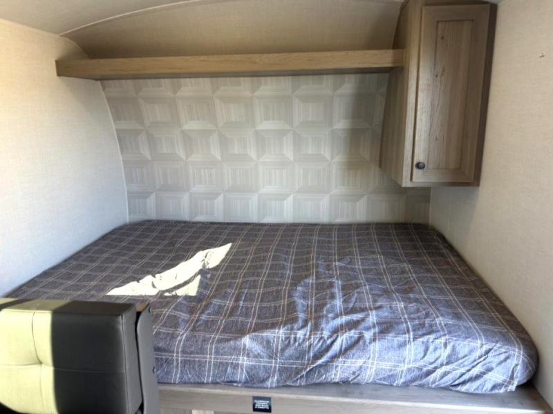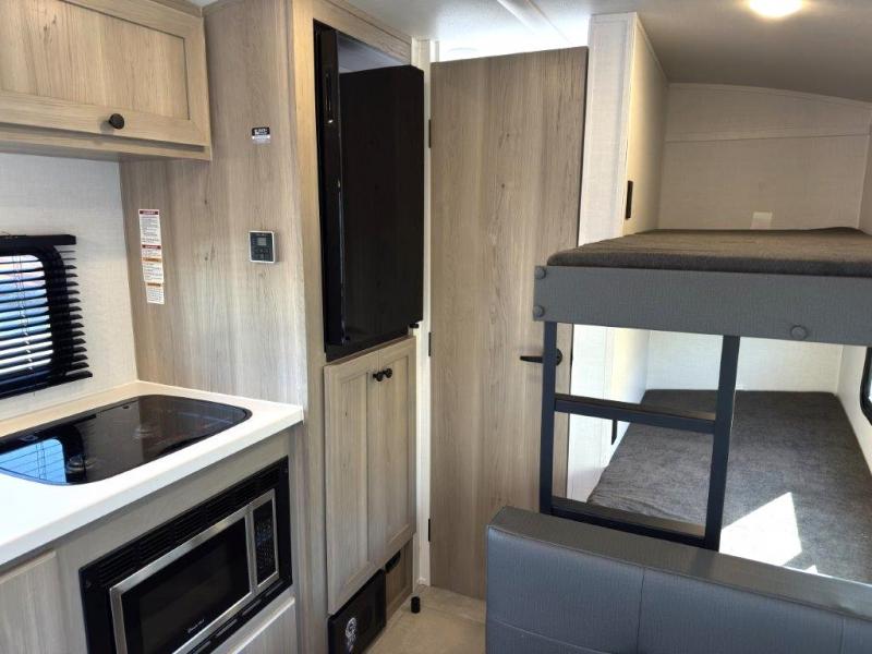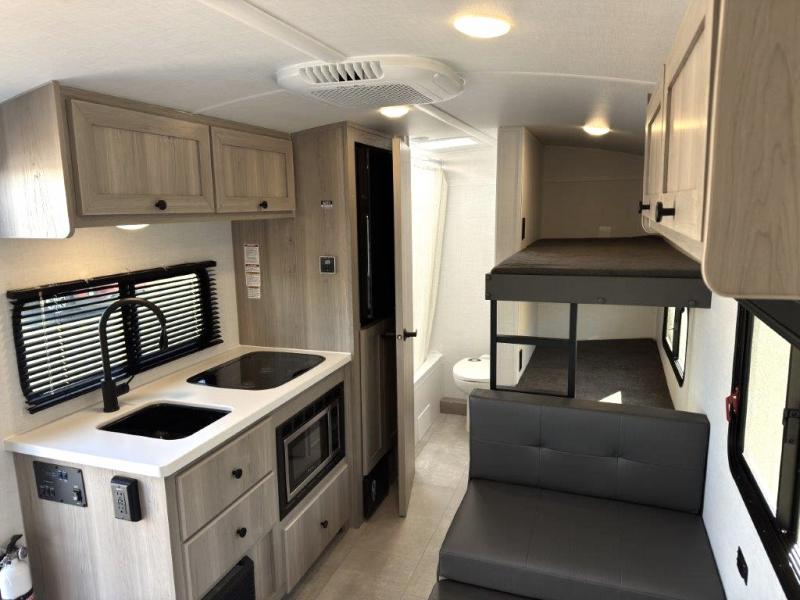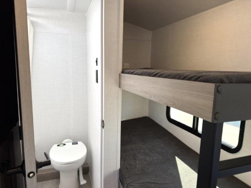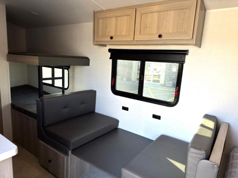 This charming travel trailer is perfect for families or small groups. The front bedroom features a full bed, perfect for a restful night's sleep. Ample storage space ensures you stay organized and clutter-free. The booth dinette is a cozy spot for meals and conversation, while the kitchen area is equipped with a microwave, fridge, and overhead cabinets. Prepare delicious meals and snacks with ease. The bunk beds provide a fun and practical sleeping solution for kids or additional guests. Perfect for sleepovers or family gatherings! The full bathroom is a convenient and refreshing space, with all the essentials for a comfortable stay.