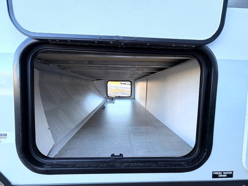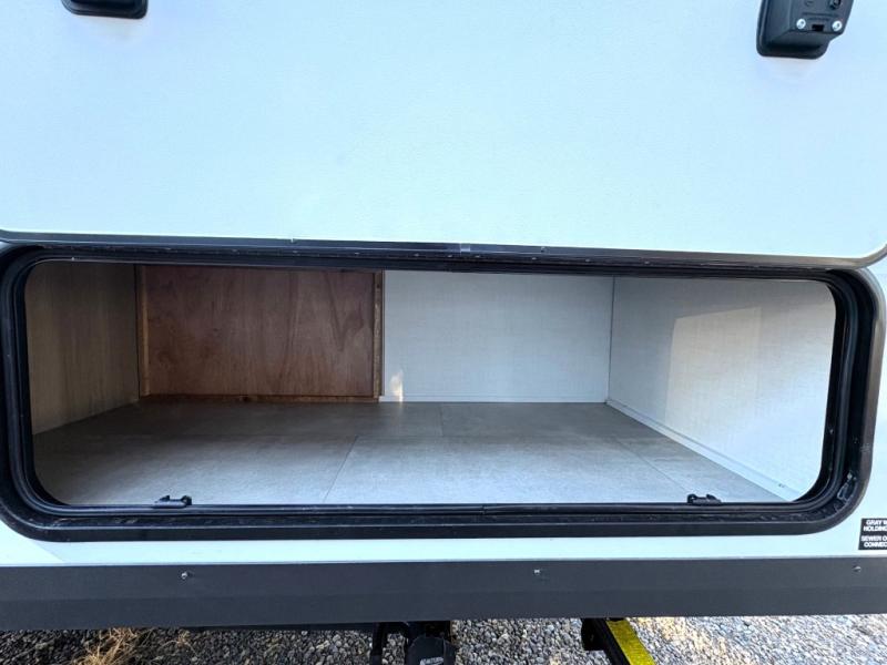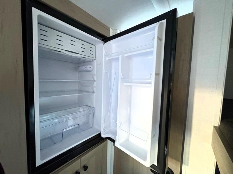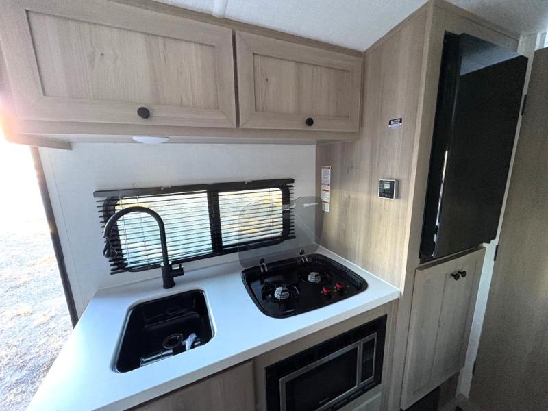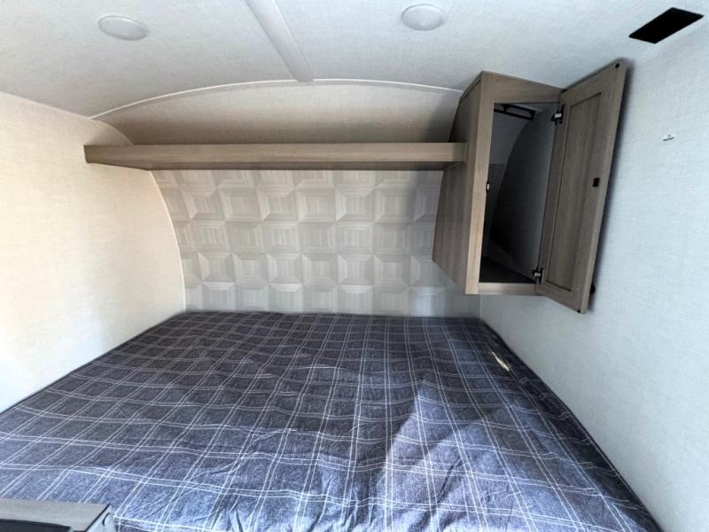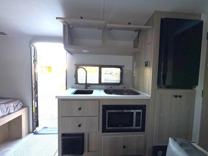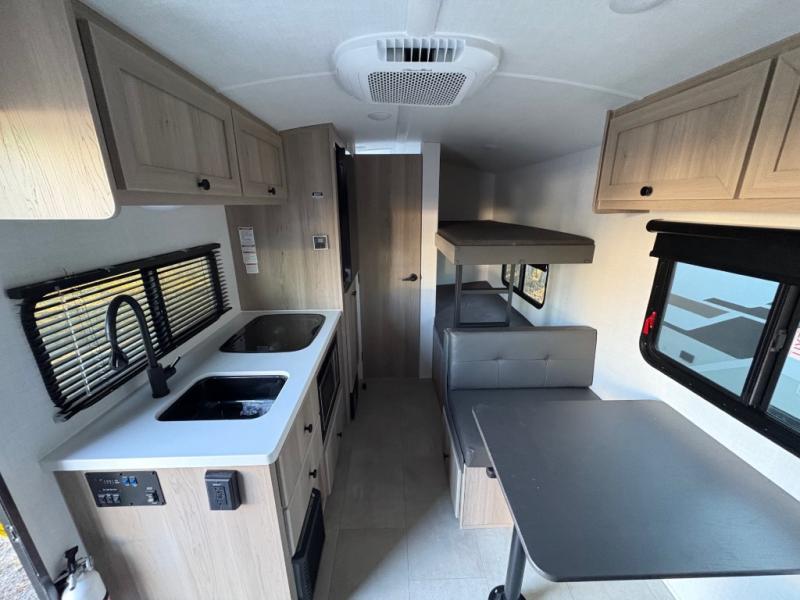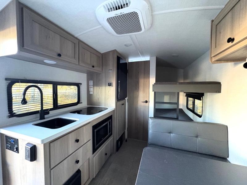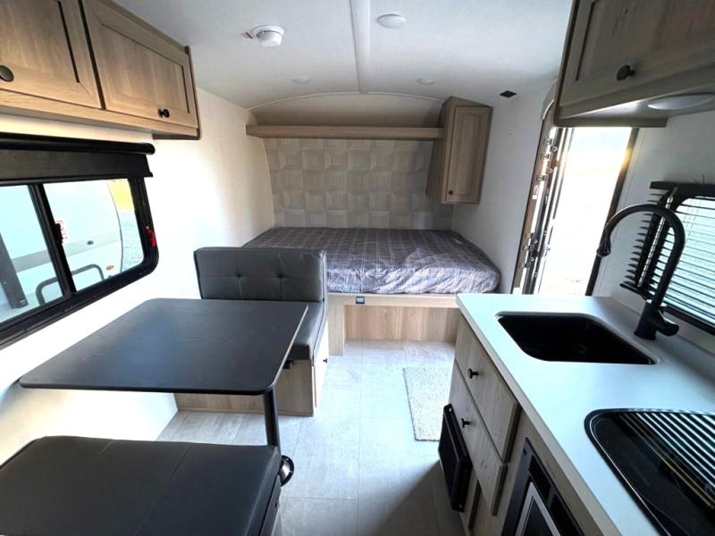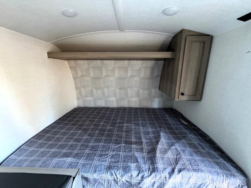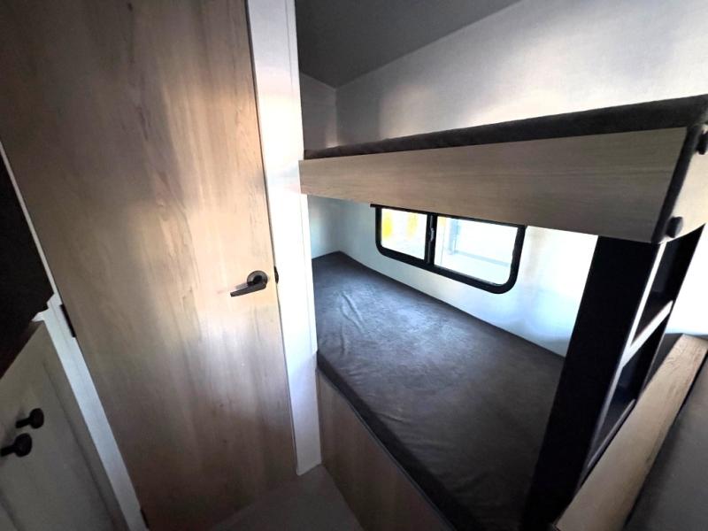 This charming travel trailer is perfect for families or small groups. The front bedroom features a full bed, perfect for a restful night's sleep. Ample storage space ensures you stay organized and clutter-free. The booth dinette is a cozy spot for meals and conversation, while the kitchen area is equipped with a microwave, fridge, and overhead cabinets. Prepare delicious meals and snacks with ease. The bunk beds provide a fun and practical sleeping solution for kids or additional guests. Perfect for sleepovers or family gatherings! The full bathroom is a convenient and refreshing space, with all the essentials for a comfortable stay.