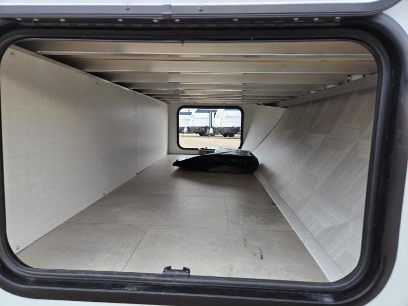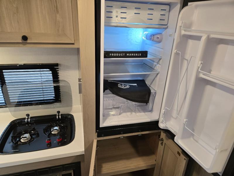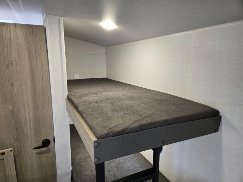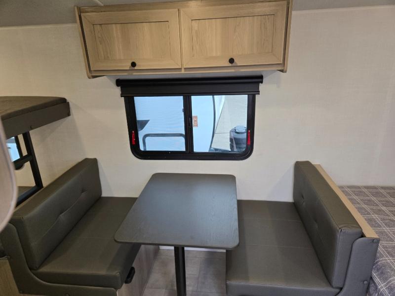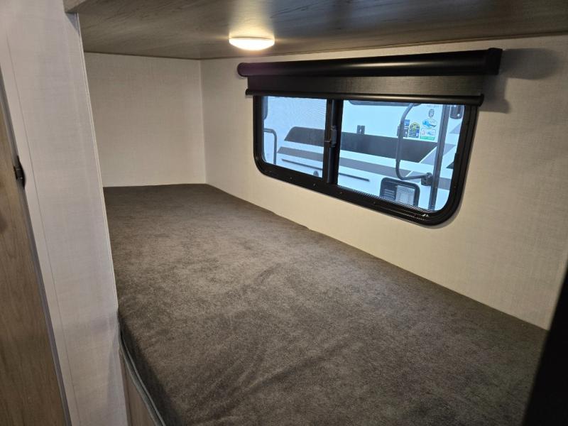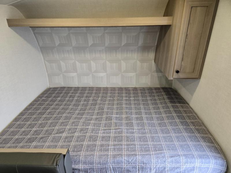 This charming travel trailer is perfect for families or small groups. The front bedroom features a full bed, perfect for a restful night's sleep. Ample storage space ensures you stay organized and clutter-free. The booth dinette is a cozy spot for meals and conversation, while the kitchen area is equipped with a microwave, fridge, and overhead cabinets. Prepare delicious meals and snacks with ease. The bunk beds provide a fun and practical sleeping solution for kids or additional guests. Perfect for sleepovers or family gatherings! The full bathroom is a convenient and refreshing space, with all the essentials for a comfortable stay.