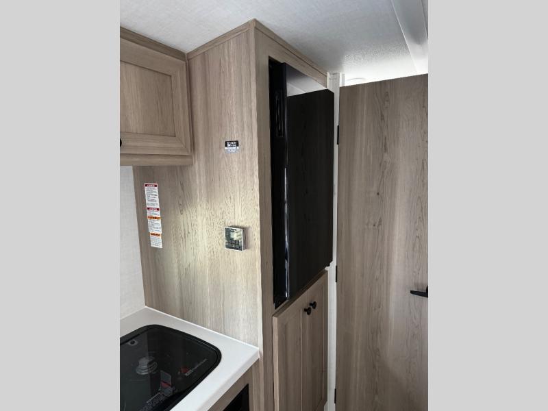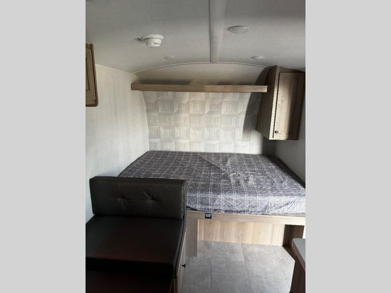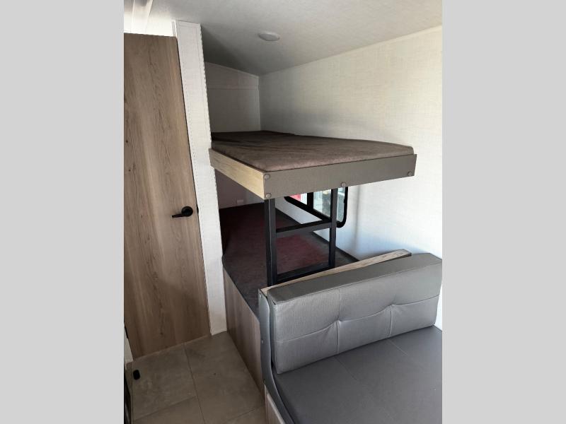 This charming travel trailer is perfect for families or small groups. The front bedroom features a full bed, perfect for a restful night's sleep. Ample storage space ensures you stay organized and clutter-free. The booth dinette is a cozy spot for meals and conversation, while the kitchen area is equipped with a microwave, fridge, and overhead cabinets. Prepare delicious meals and snacks with ease. The bunk beds provide a fun and practical sleeping solution for kids or additional guests. Perfect for sleepovers or family gatherings! The full bathroom is a convenient and refreshing space, with all the essentials for a comfortable stay.