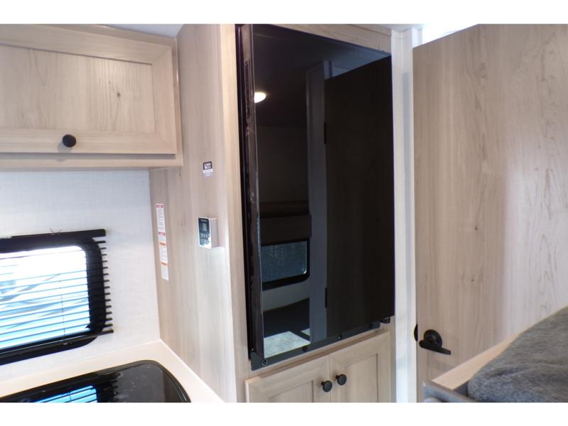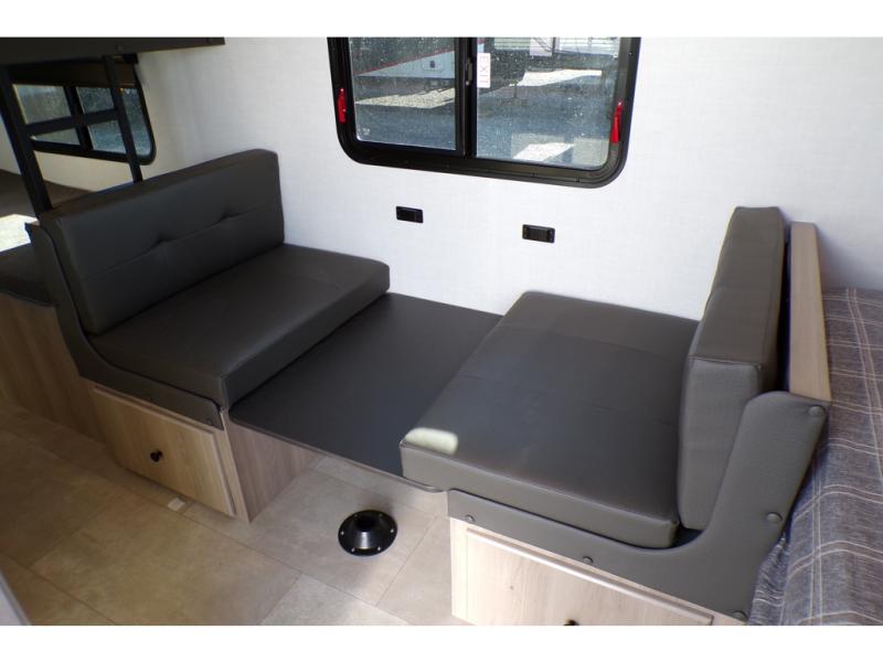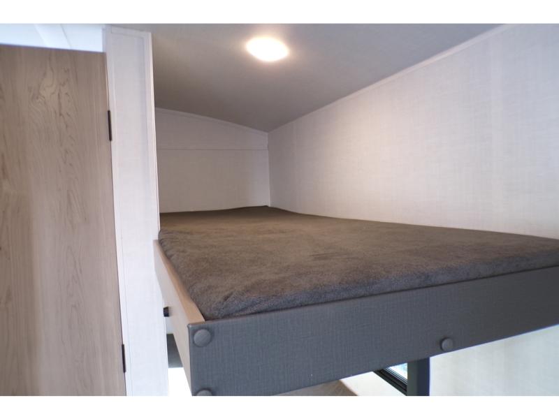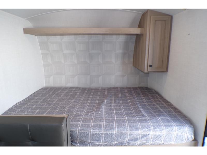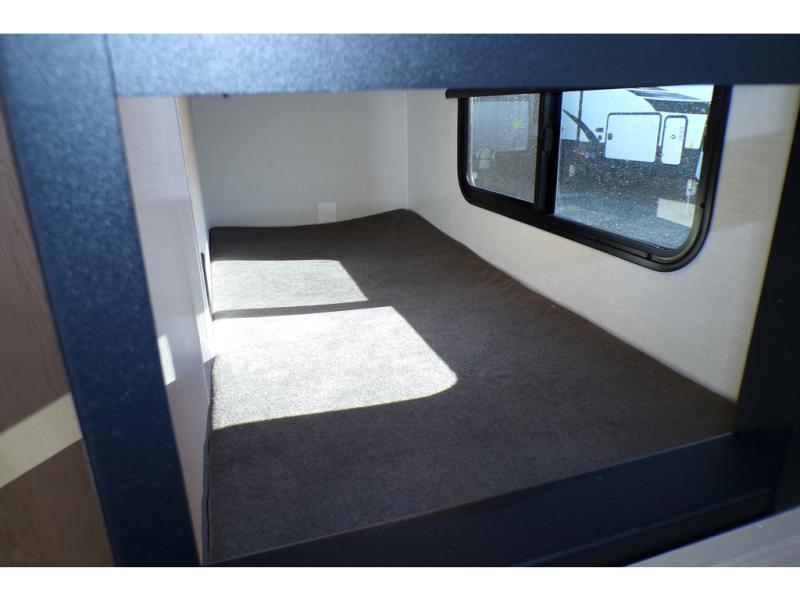 This charming travel trailer is perfect for families or small groups. The front bedroom features a full bed, perfect for a restful night's sleep. Ample storage space ensures you stay organized and clutter-free. The booth dinette is a cozy spot for meals and conversation, while the kitchen area is equipped with a microwave, fridge, and overhead cabinets. Prepare delicious meals and snacks with ease. The bunk beds provide a fun and practical sleeping solution for kids or additional guests. Perfect for sleepovers or family gatherings! The full bathroom is a convenient and refreshing space, with all the essentials for a comfortable stay.