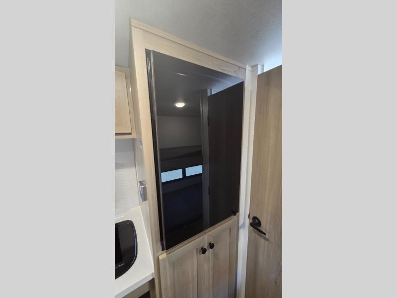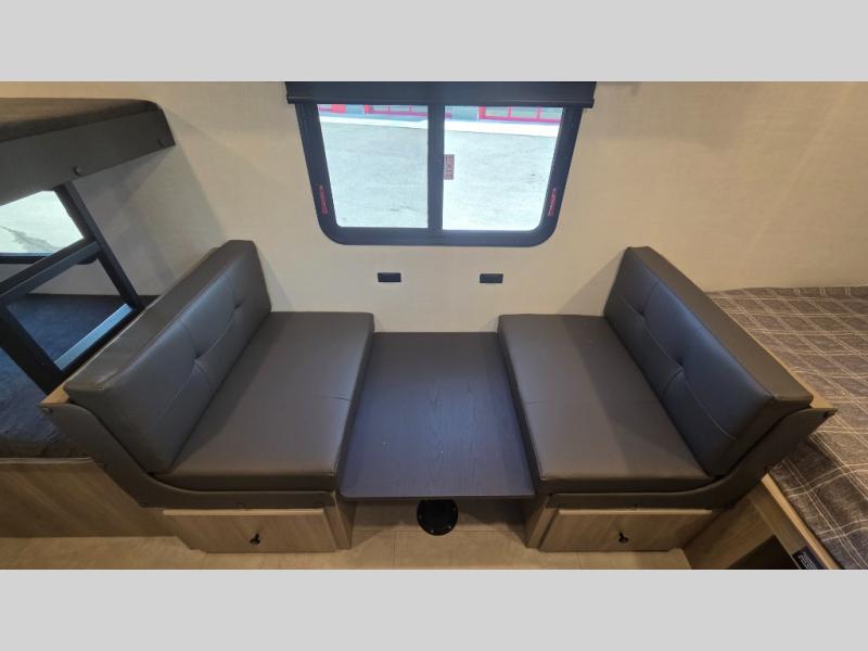 This charming travel trailer is perfect for families or small groups. The front bedroom features a full bed, perfect for a restful night's sleep. Ample storage space ensures you stay organized and clutter-free. The booth dinette is a cozy spot for meals and conversation, while the kitchen area is equipped with a microwave, fridge, and overhead cabinets. Prepare delicious meals and snacks with ease. The bunk beds provide a fun and practical sleeping solution for kids or additional guests. Perfect for sleepovers or family gatherings! The full bathroom is a convenient and refreshing space, with all the essentials for a comfortable stay.