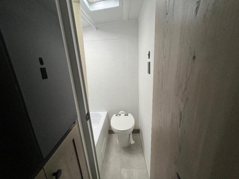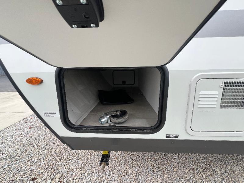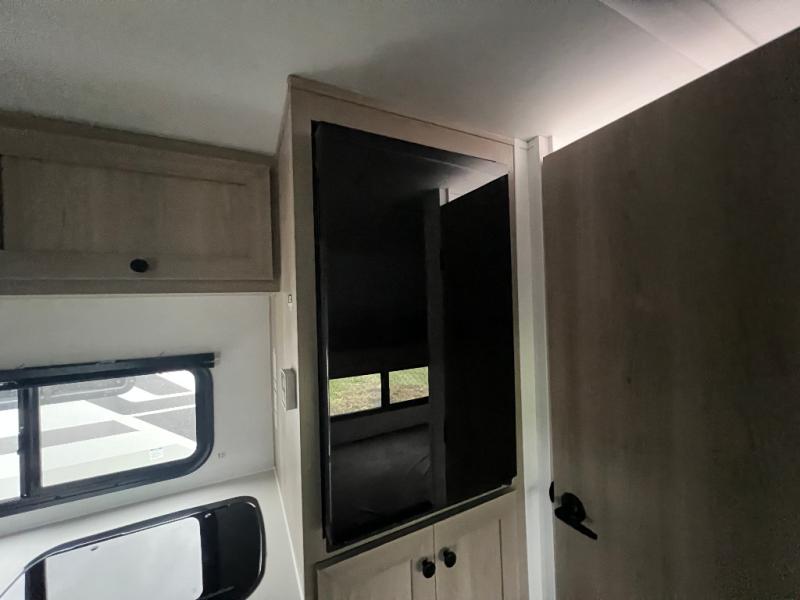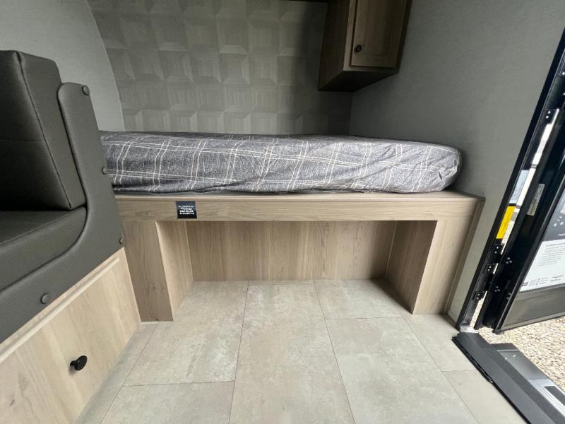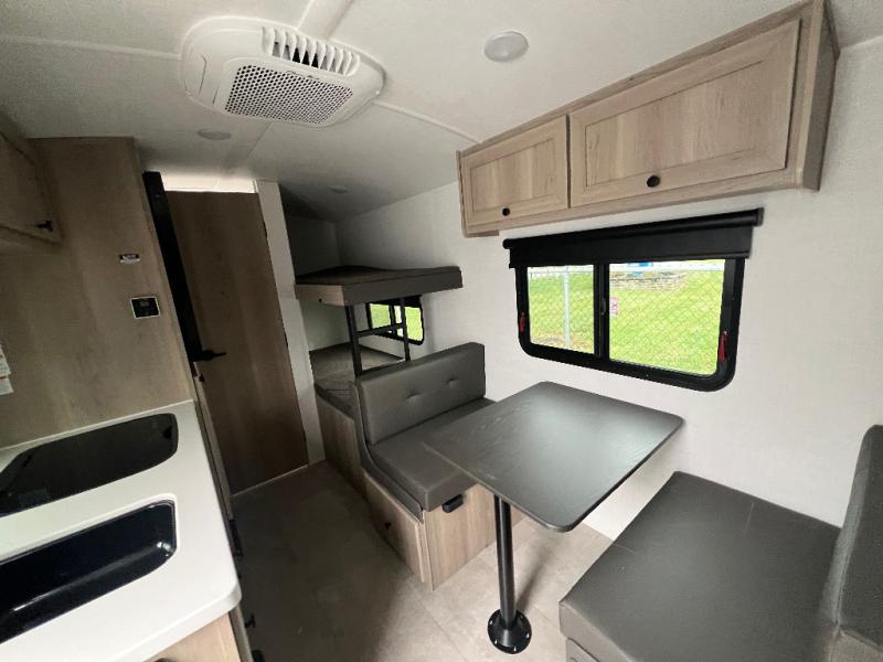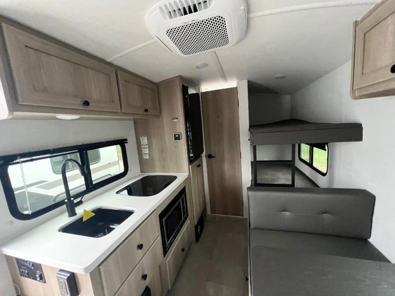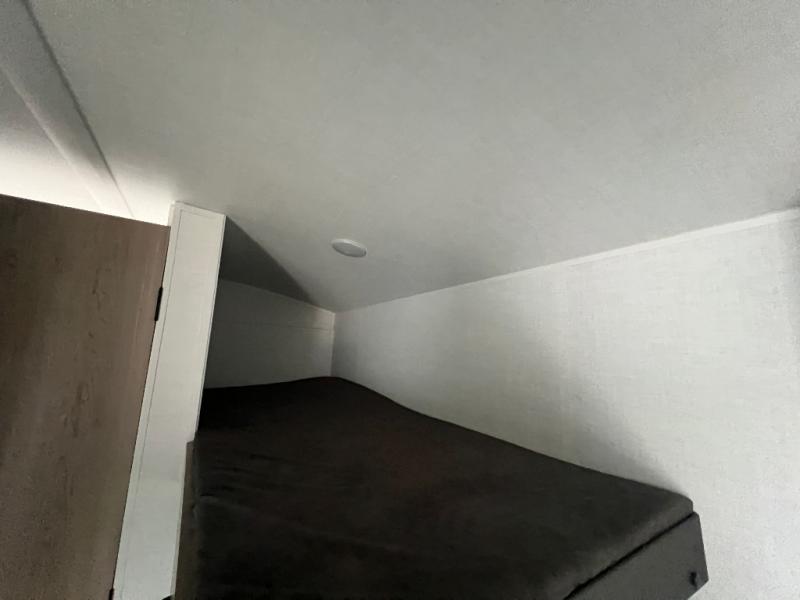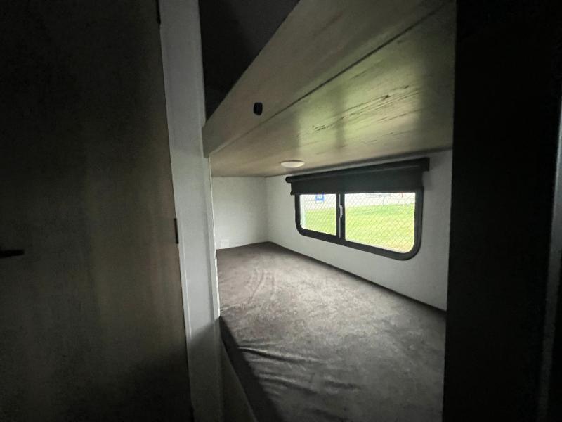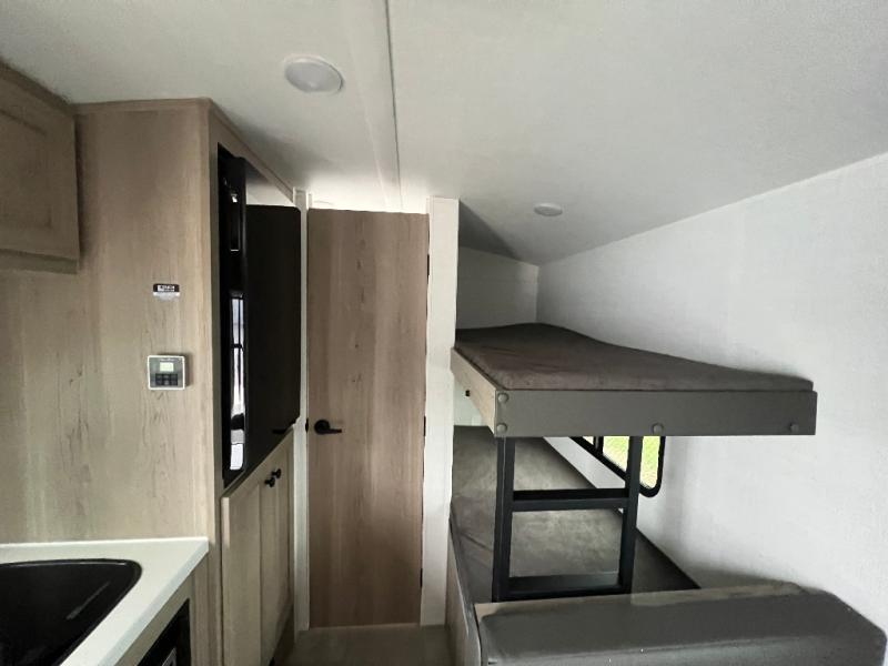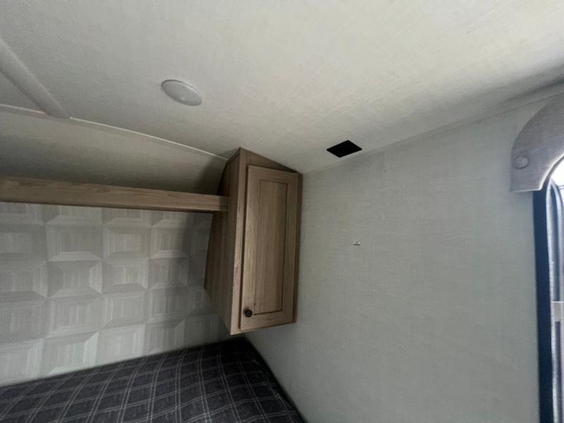 This charming travel trailer is perfect for families or small groups. The front bedroom features a full bed, perfect for a restful night's sleep. Ample storage space ensures you stay organized and clutter-free. The booth dinette is a cozy spot for meals and conversation, while the kitchen area is equipped with a microwave, fridge, and overhead cabinets. Prepare delicious meals and snacks with ease. The bunk beds provide a fun and practical sleeping solution for kids or additional guests. Perfect for sleepovers or family gatherings! The full bathroom is a convenient and refreshing space, with all the essentials for a comfortable stay.