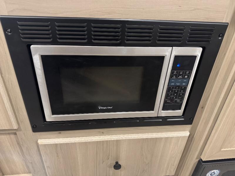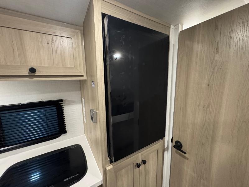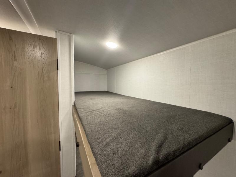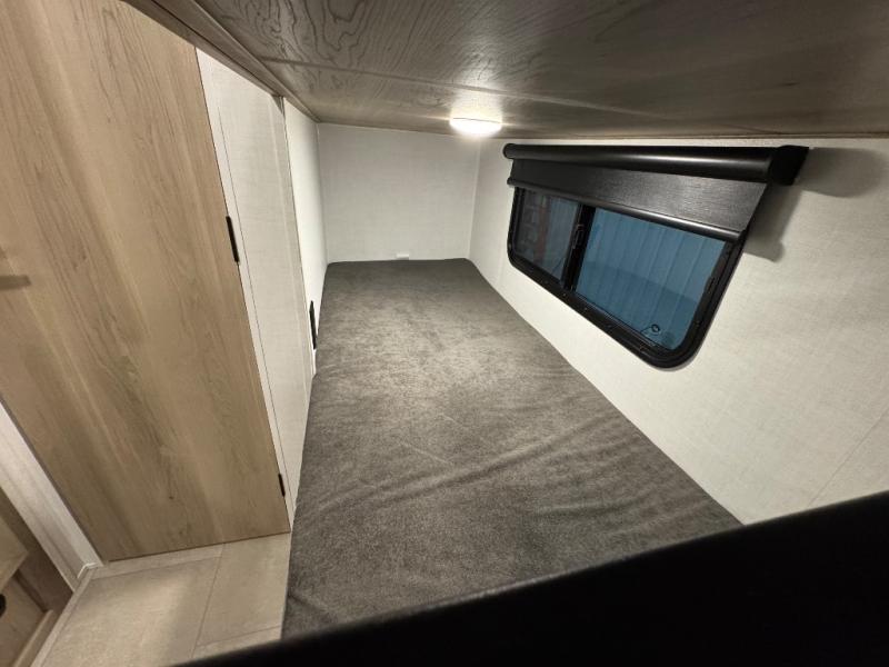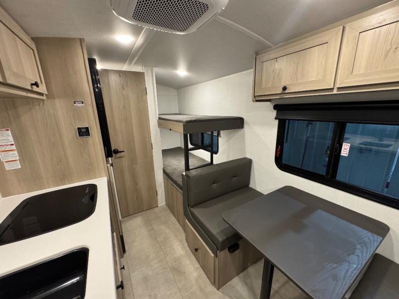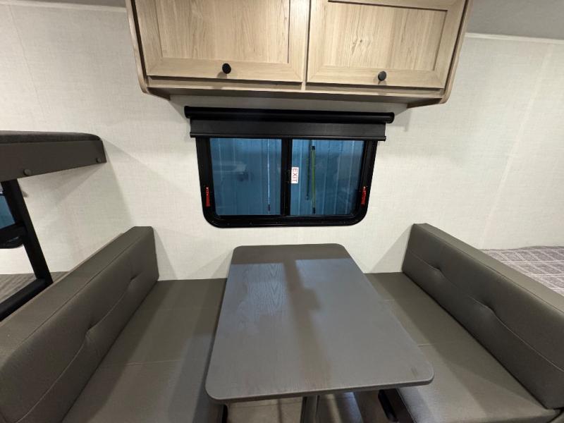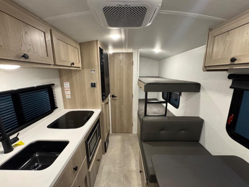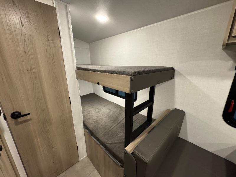 This charming travel trailer is perfect for families or small groups. The front bedroom features a full bed, perfect for a restful night's sleep. Ample storage space ensures you stay organized and clutter-free. The booth dinette is a cozy spot for meals and conversation, while the kitchen area is equipped with a microwave, fridge, and overhead cabinets. Prepare delicious meals and snacks with ease. The bunk beds provide a fun and practical sleeping solution for kids or additional guests. Perfect for sleepovers or family gatherings! The full bathroom is a convenient and refreshing space, with all the essentials for a comfortable stay.